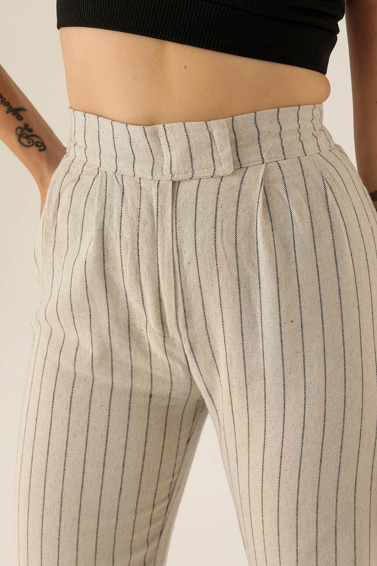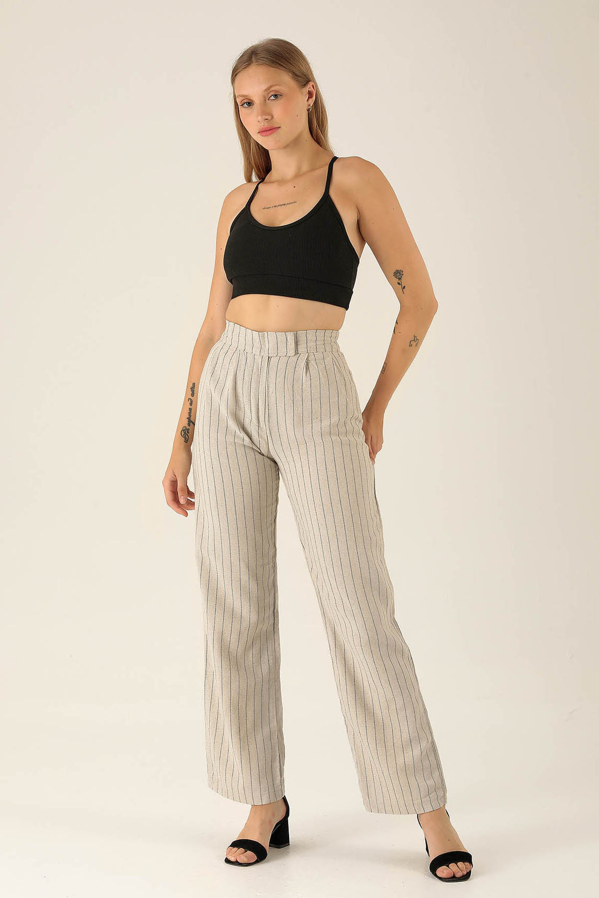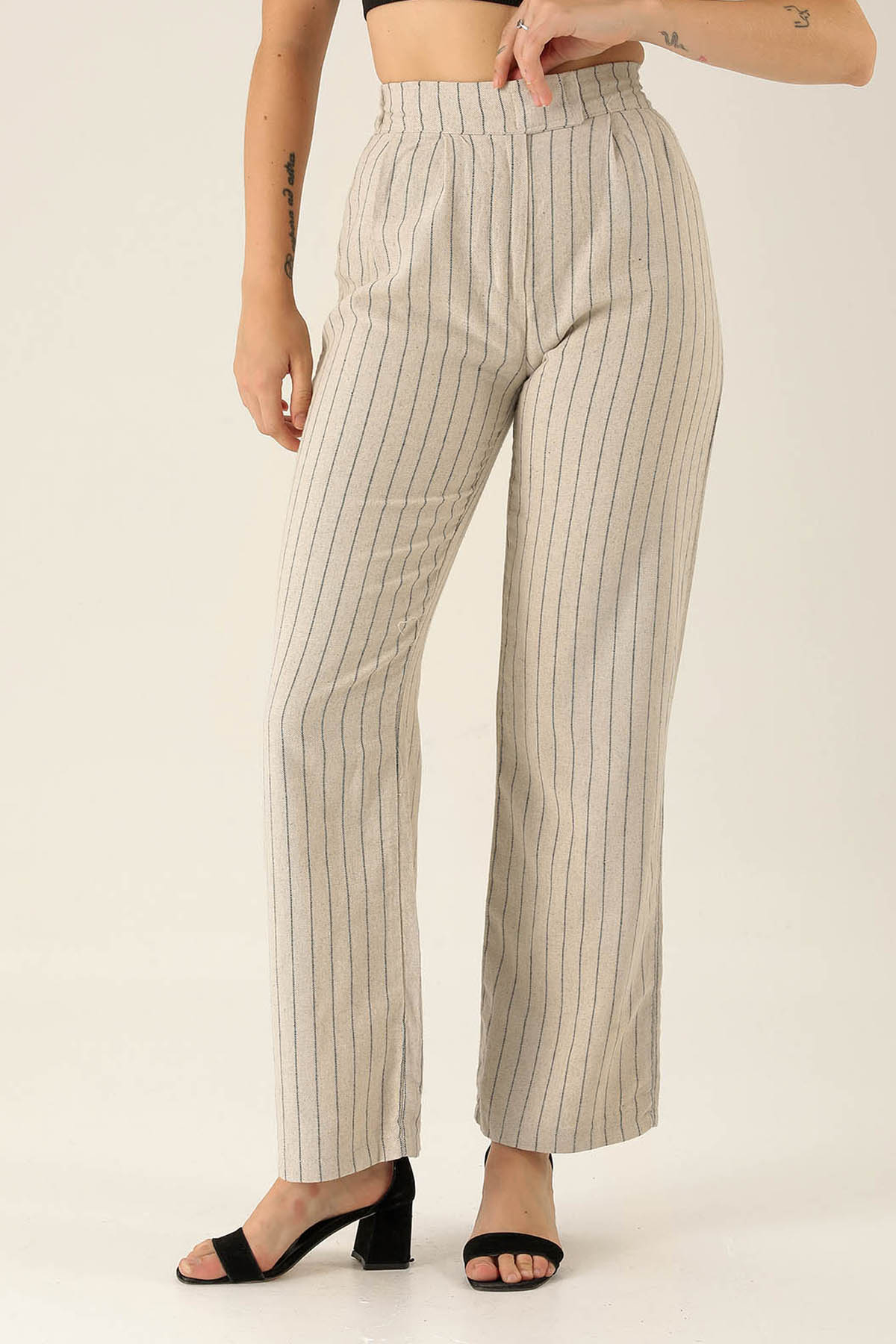 Bantlı Çizgili Palazzo Bayan Pantolon - 3043 Siyah