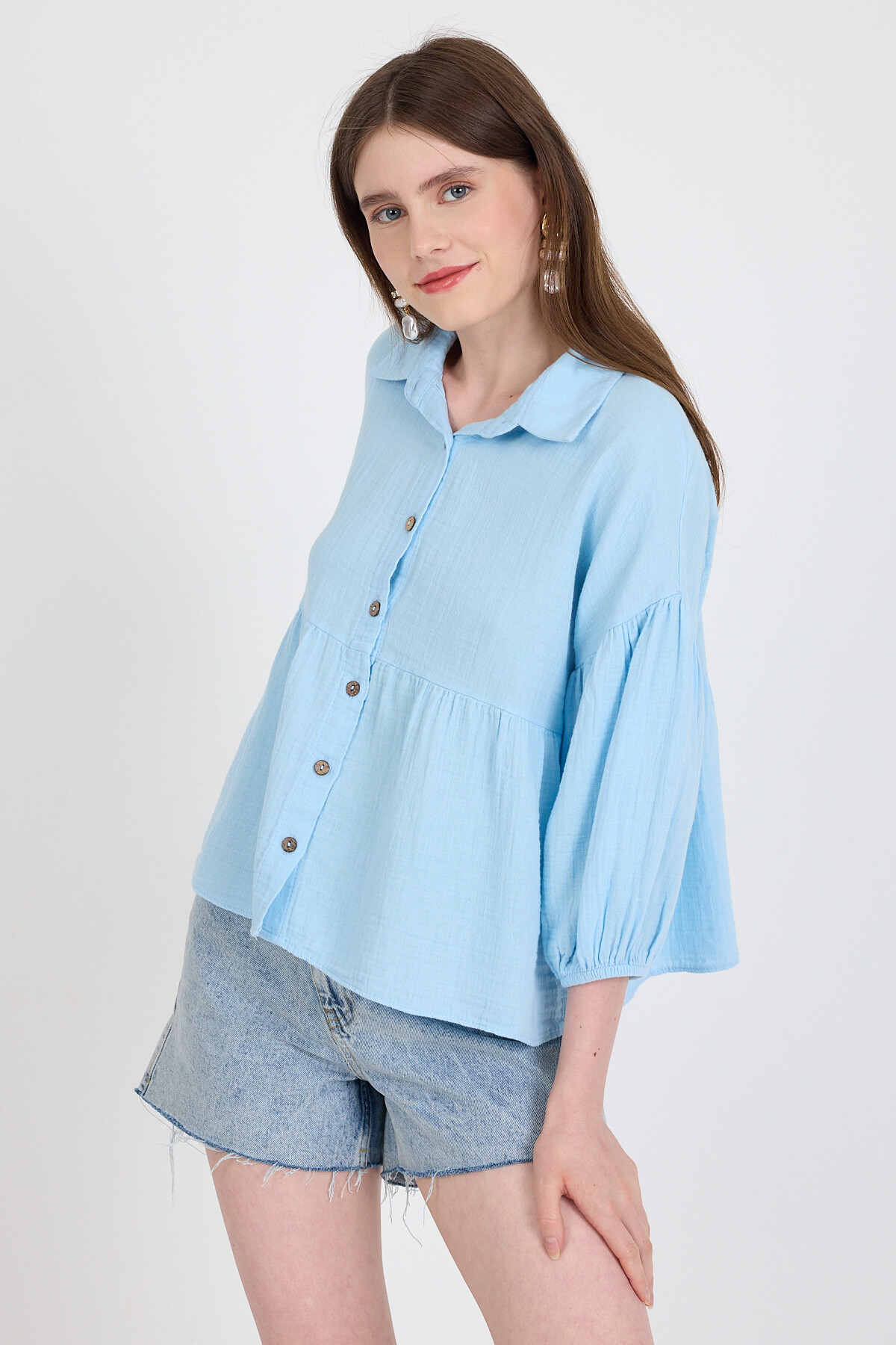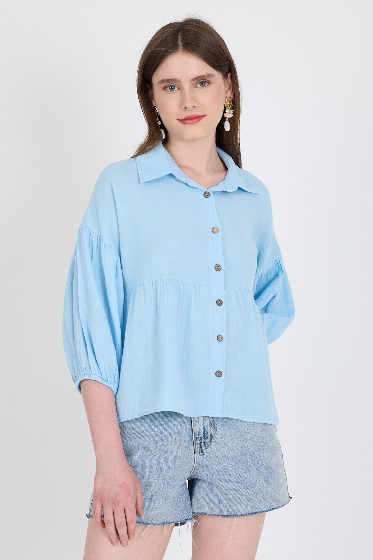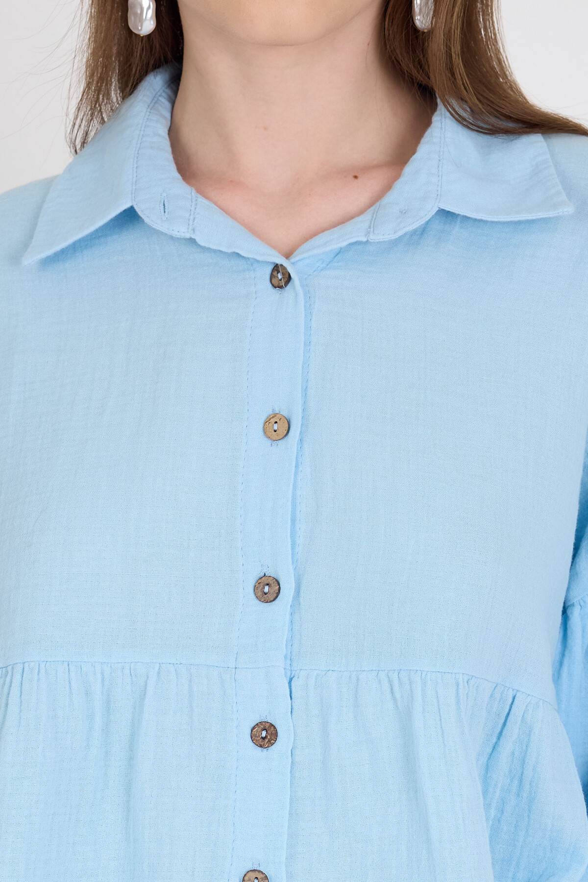 Bebe Mavi %100 Pamuk Keten Görünümlü Düğmeli Gömlek 4783A
