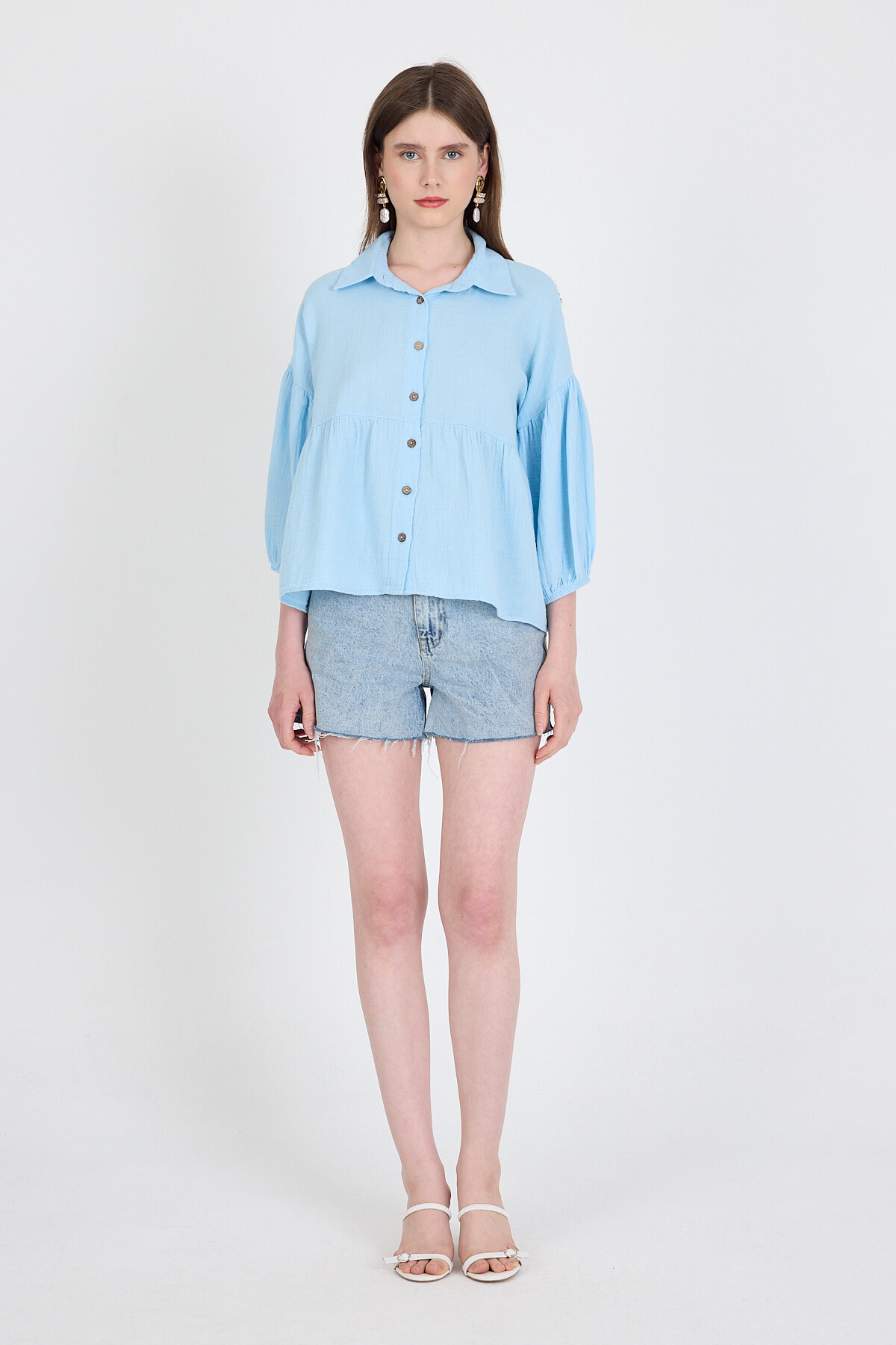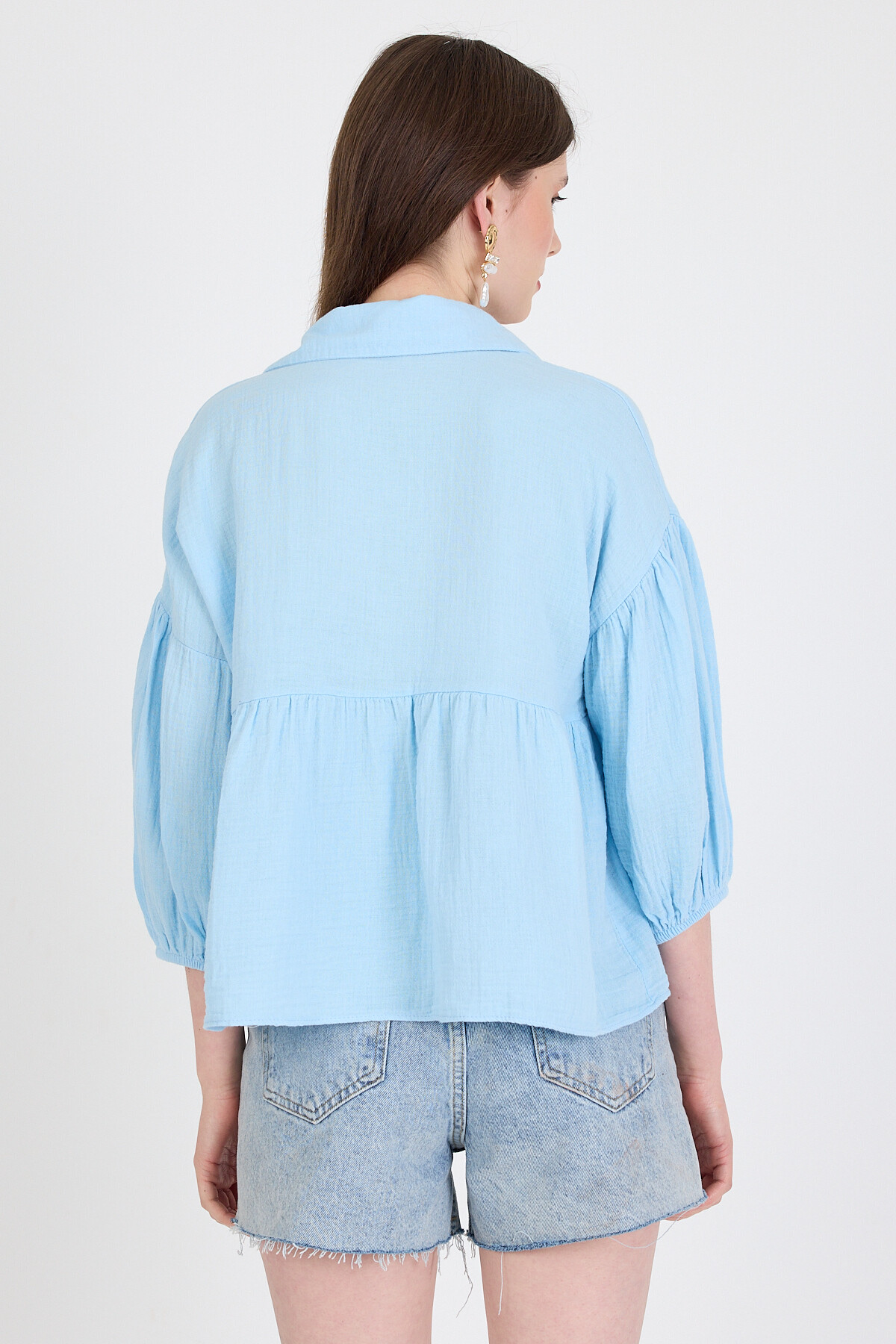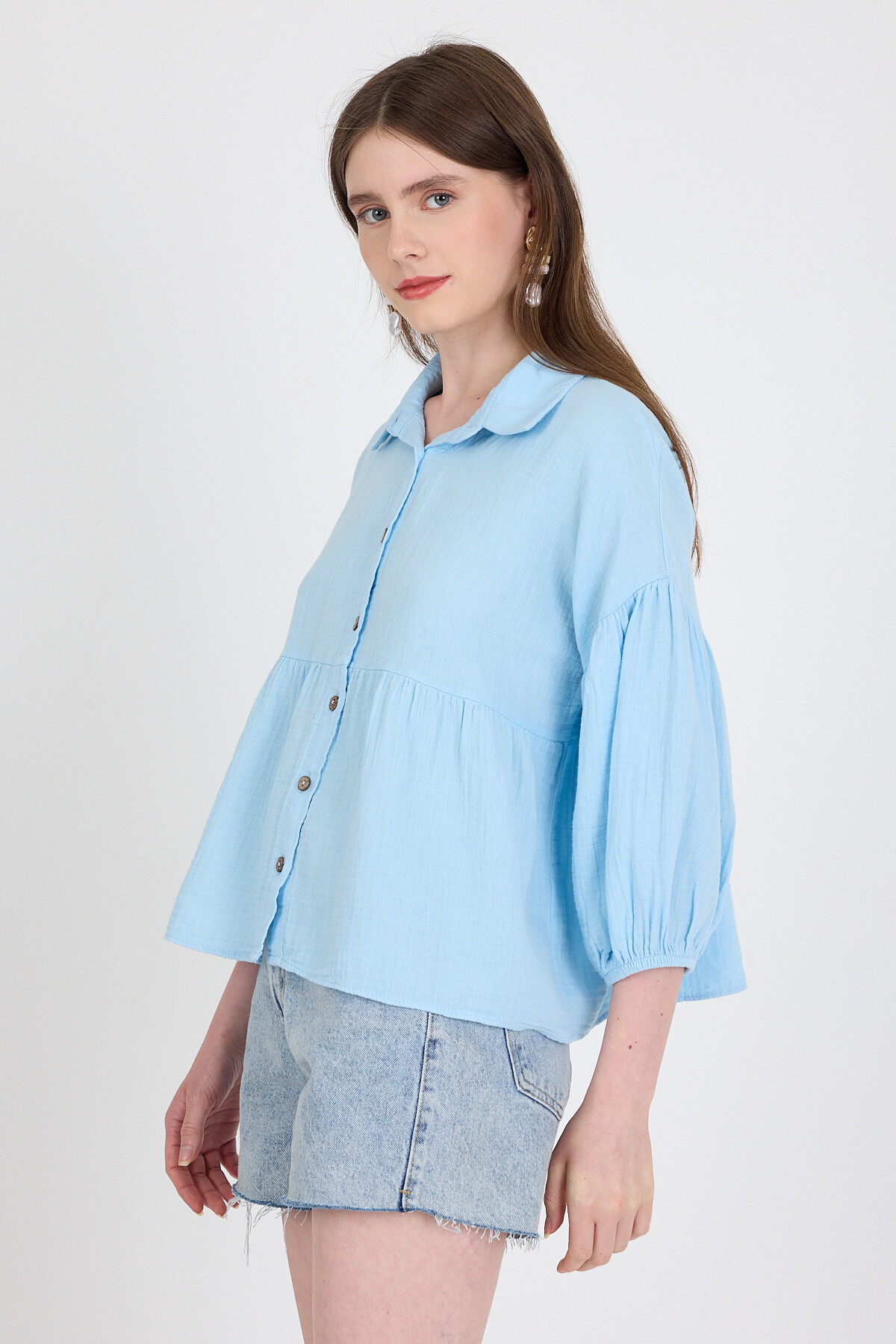 Bebe Mavi %100 Pamuk Keten Görünümlü Düğmeli Gömlek 4783A