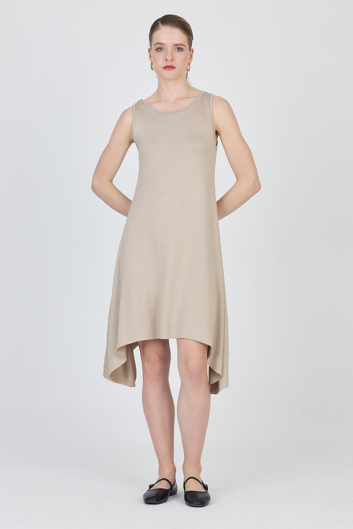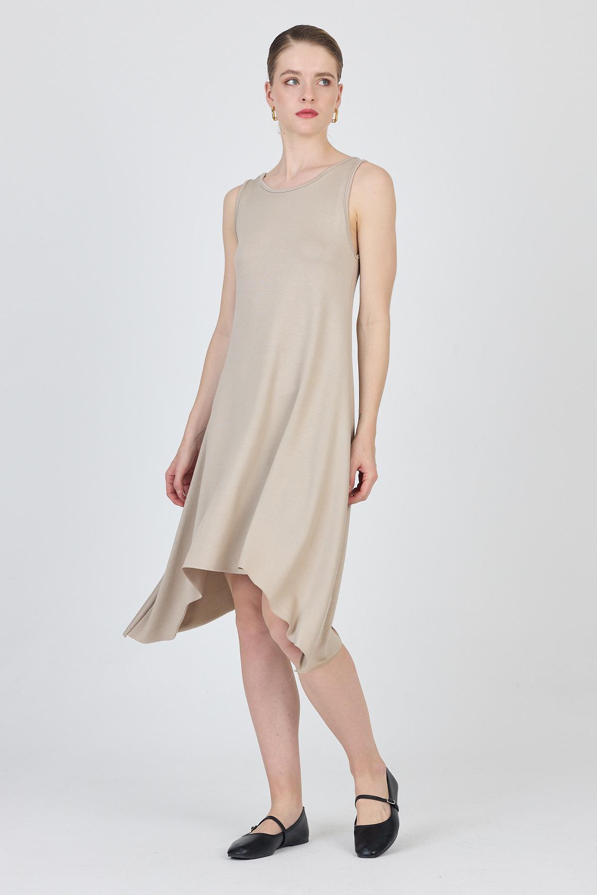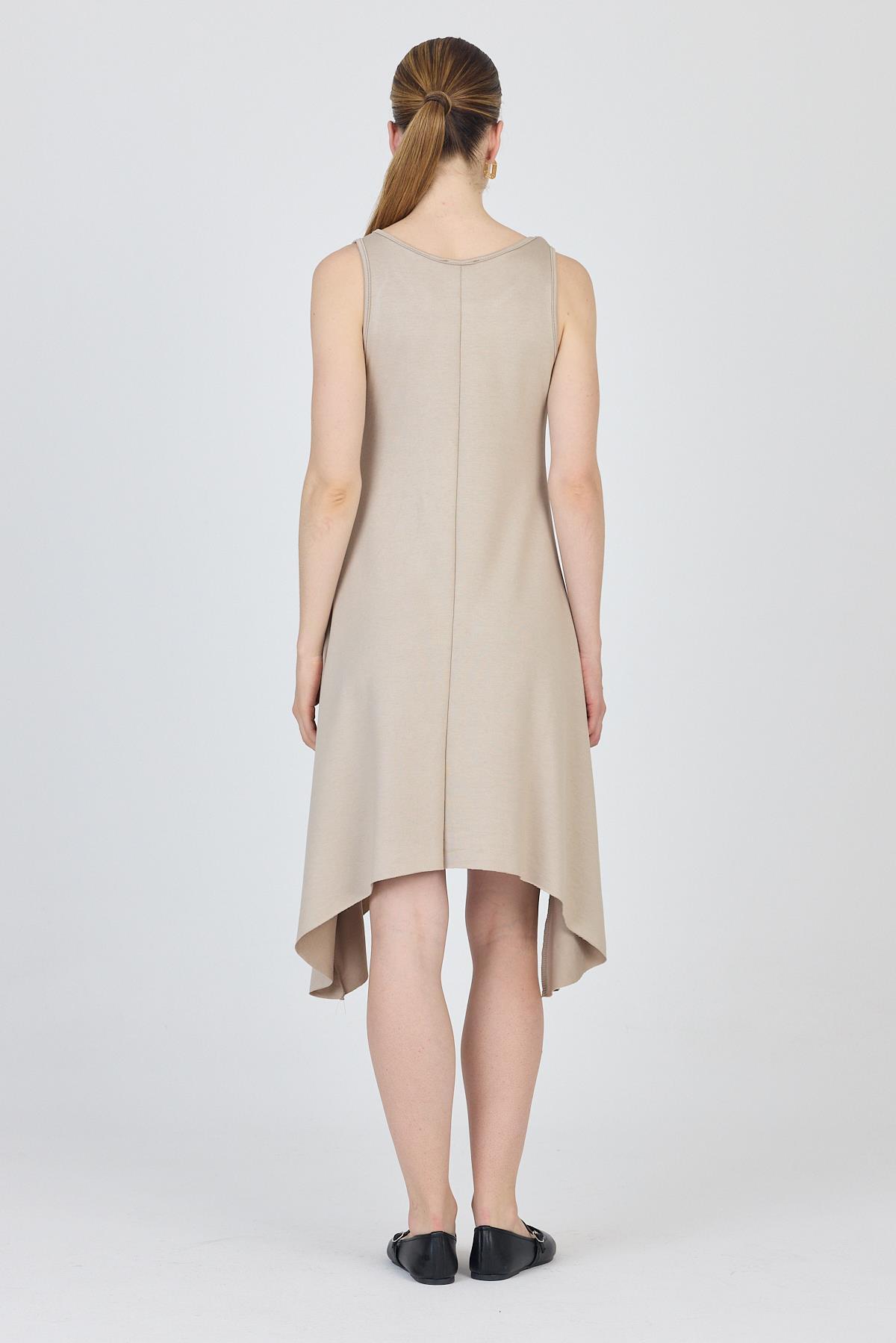 Bej Asimetrik Kesim Kolsuz Elbise 4034