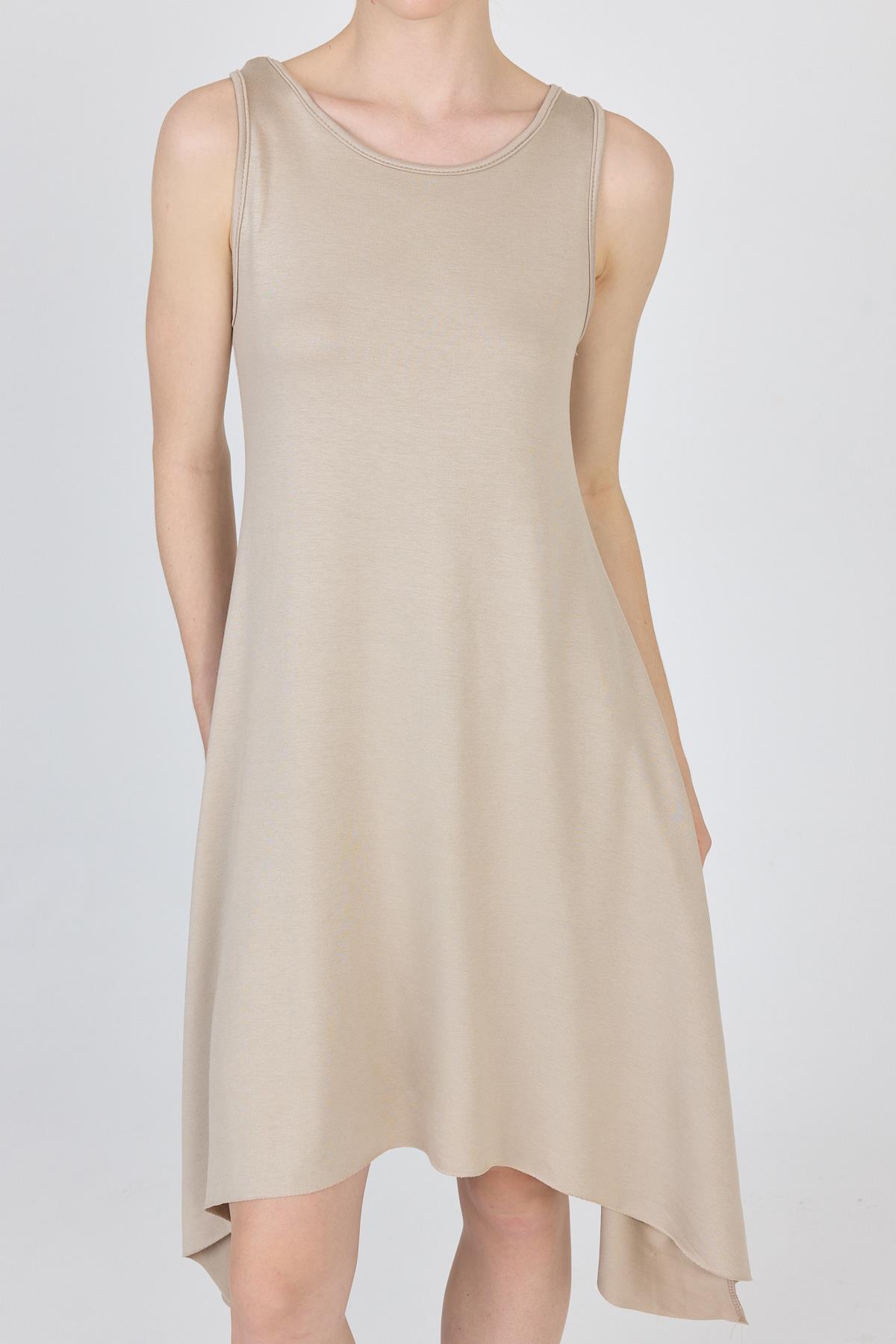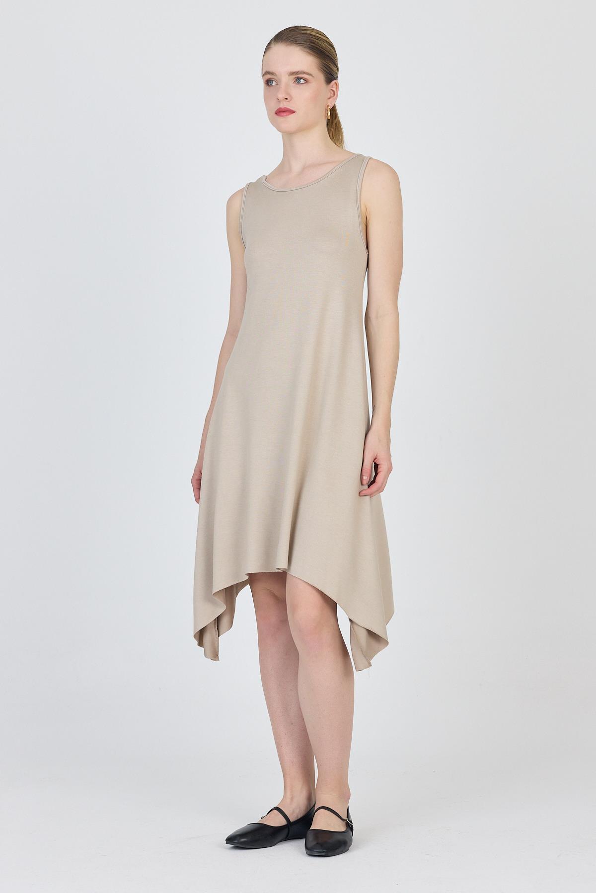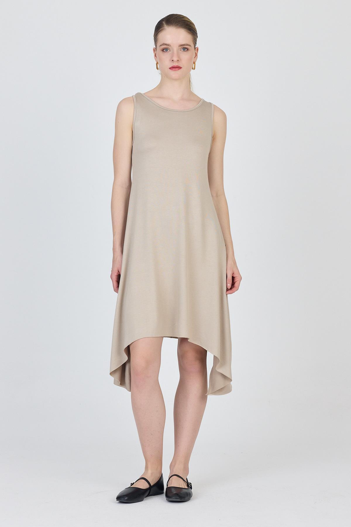 Bej Asimetrik Kesim Kolsuz Elbise 4034