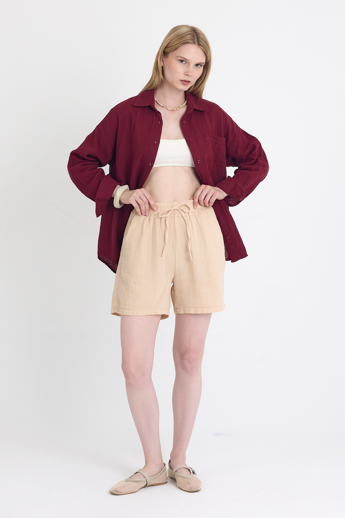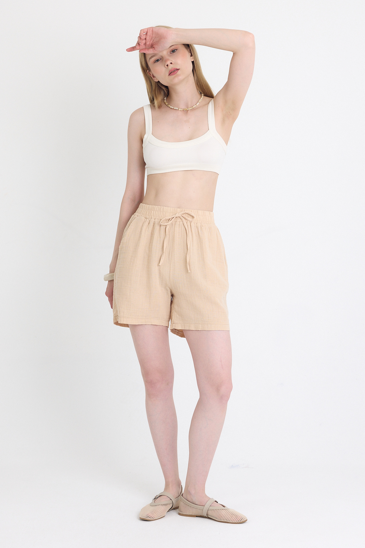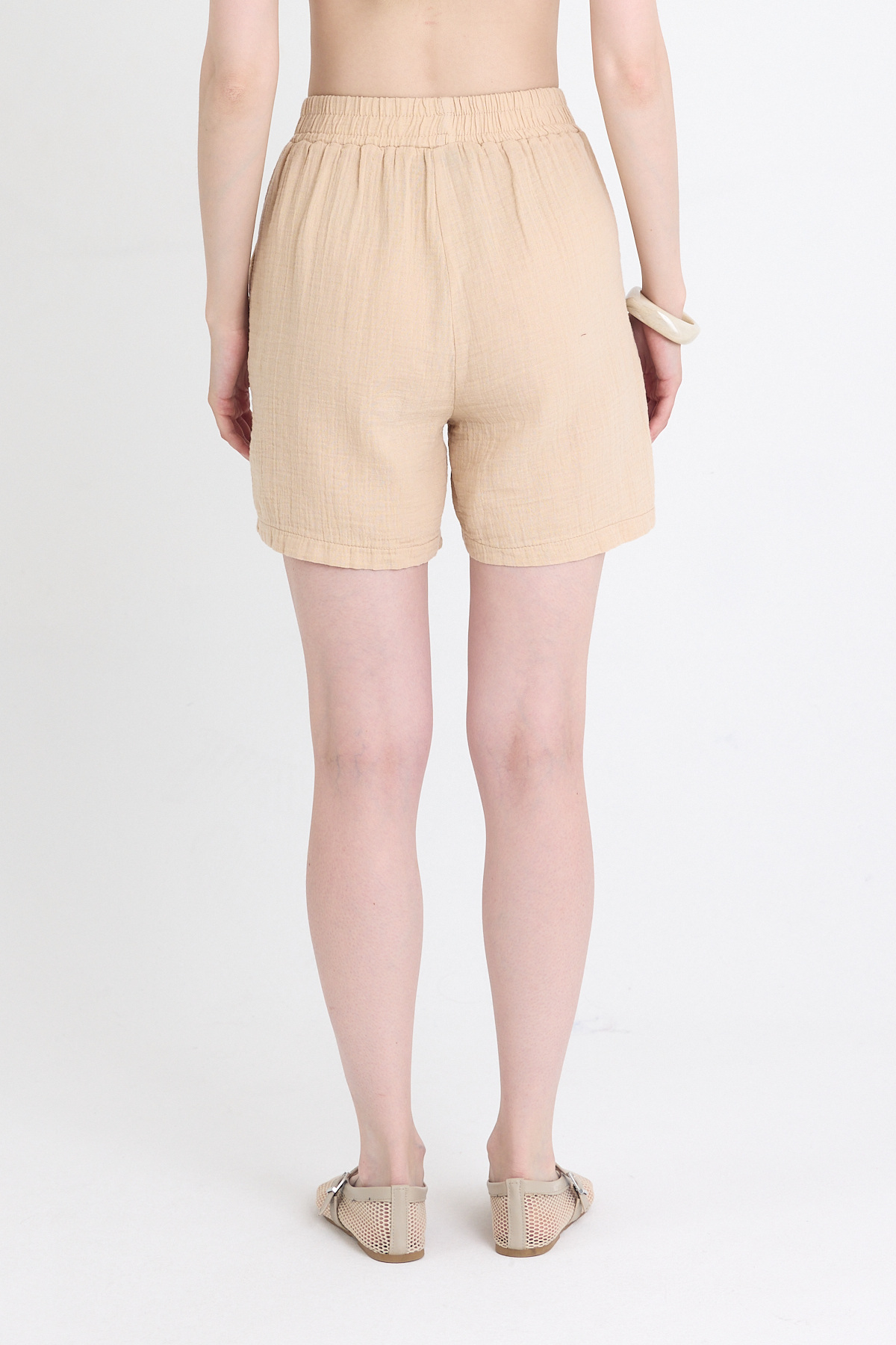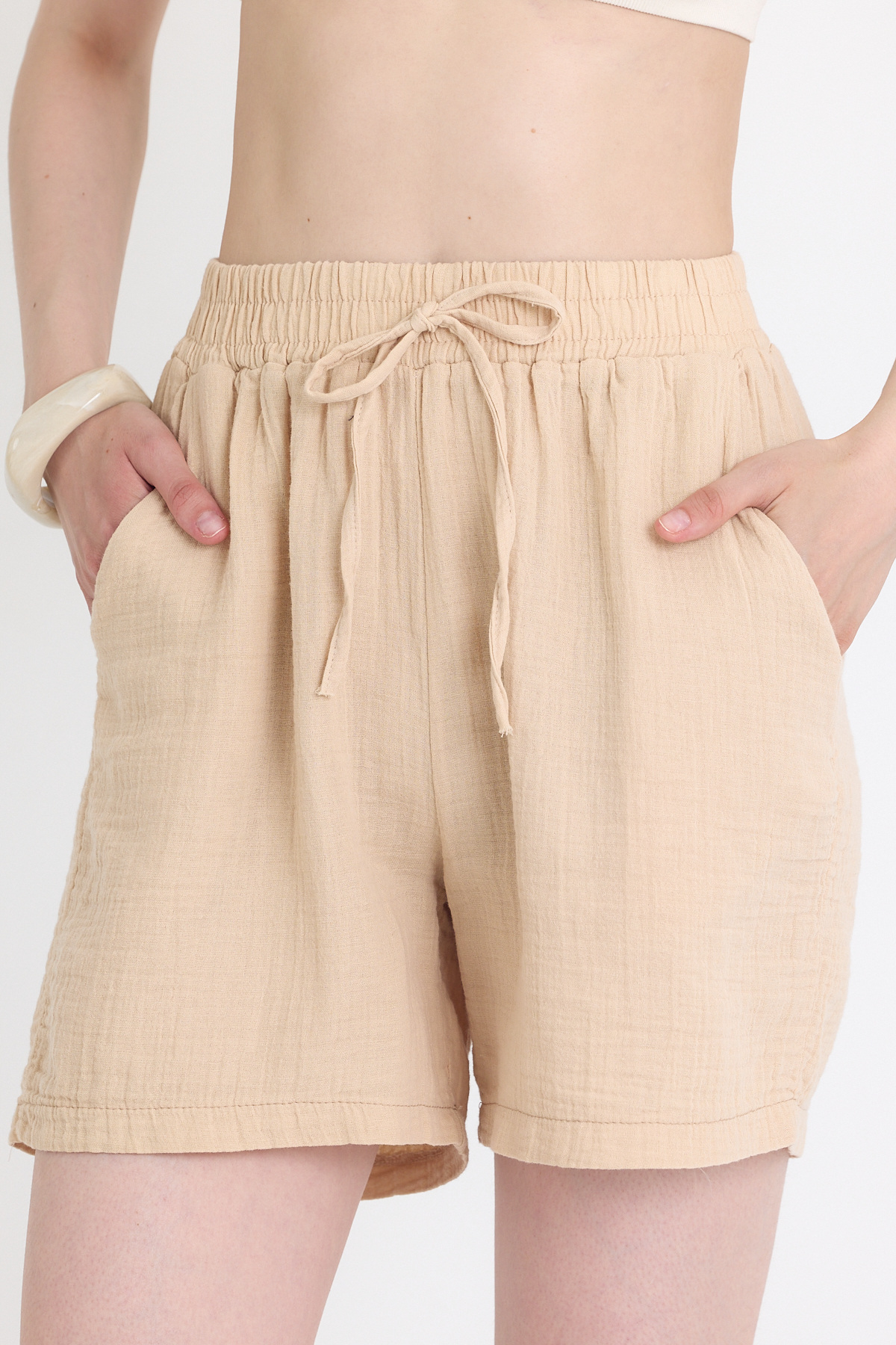 Bej Beli Lastikli %100 Pamuk Müslin Şort 4769A