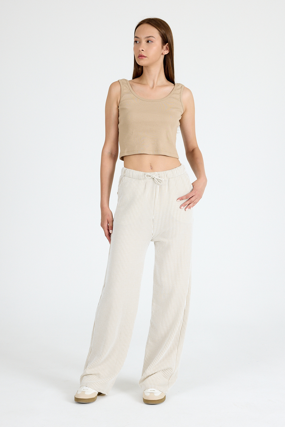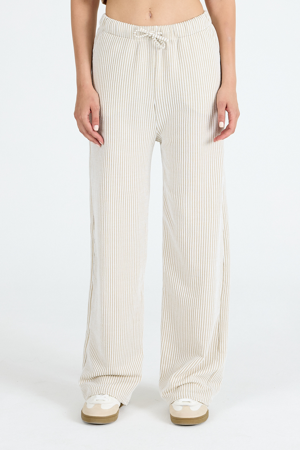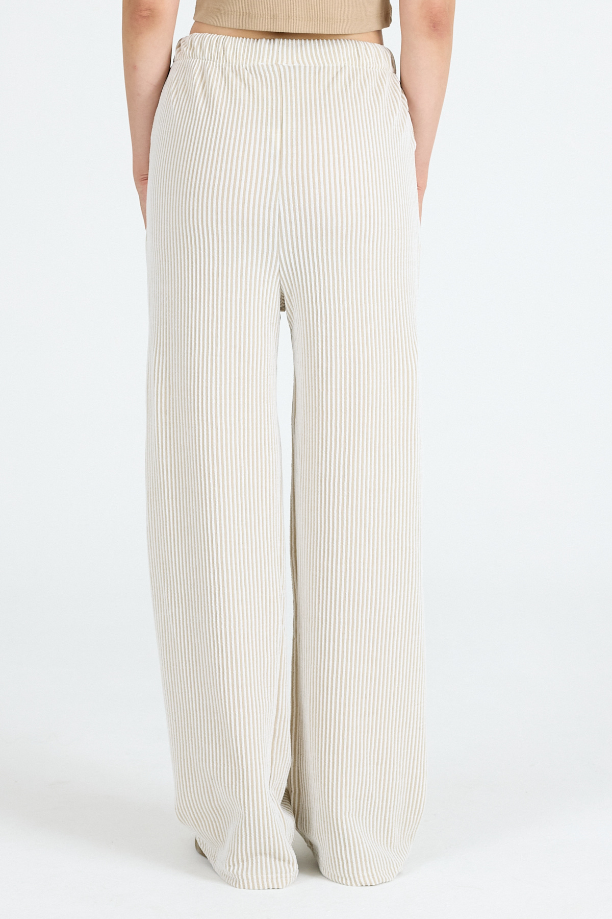 Bej Beli Lastikli Çizgili Geniş Paça Dokuma Pantolon 4098