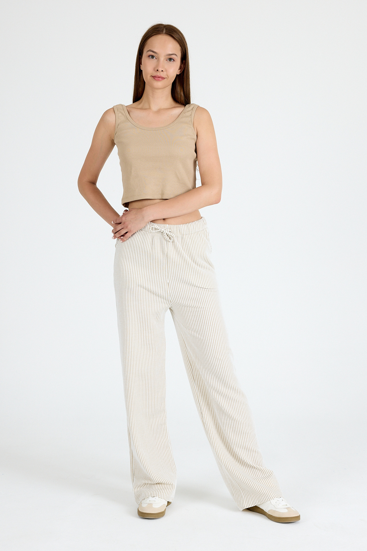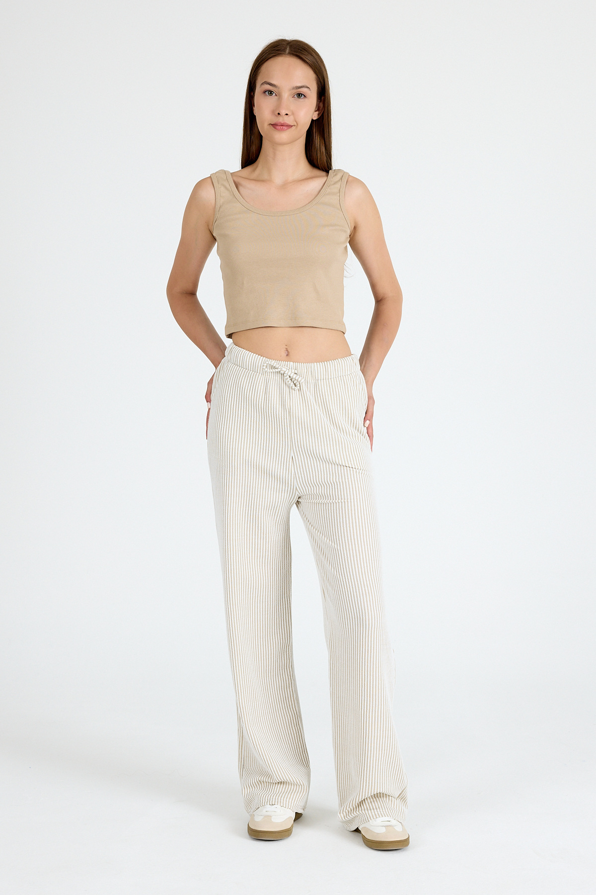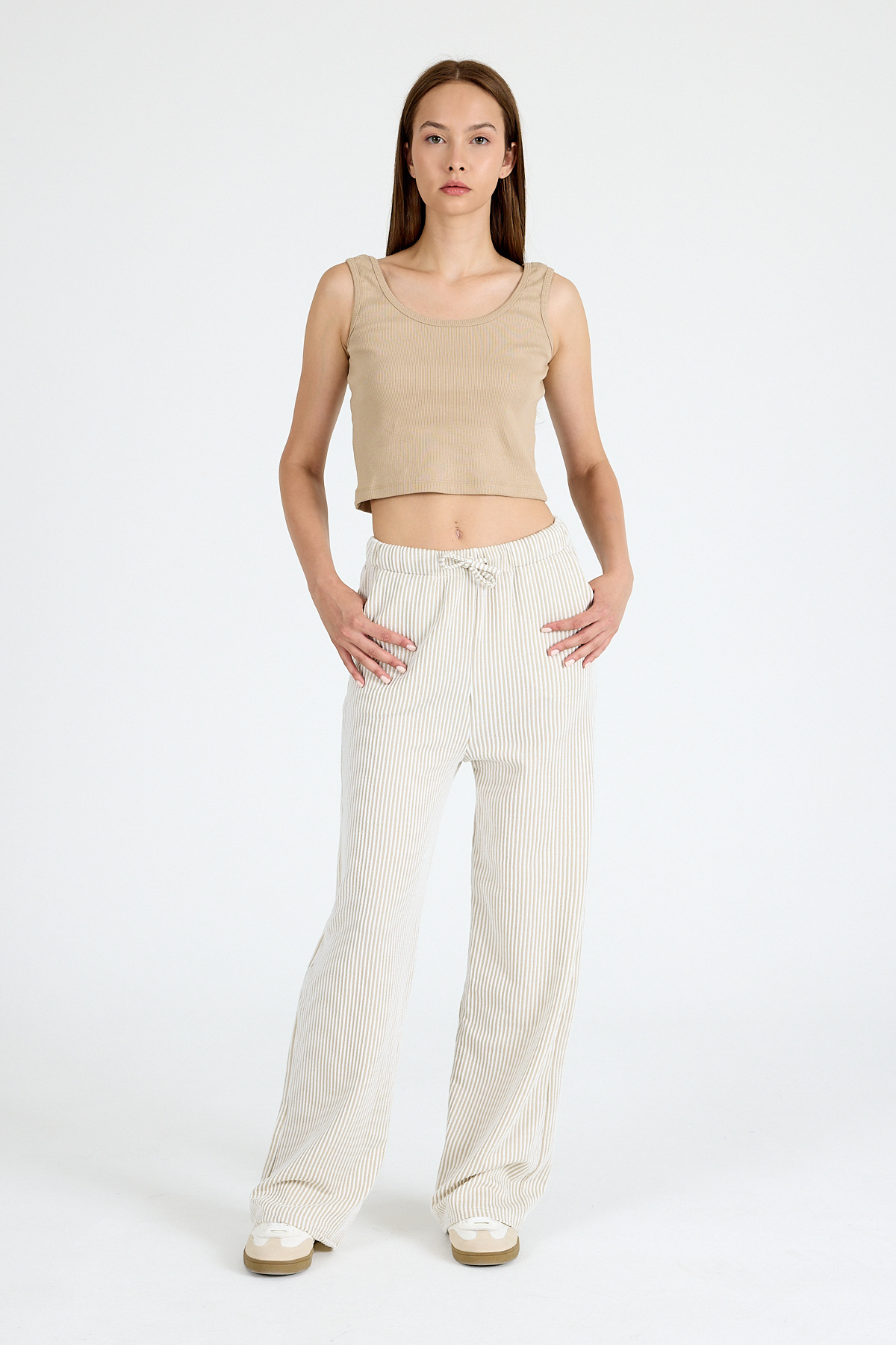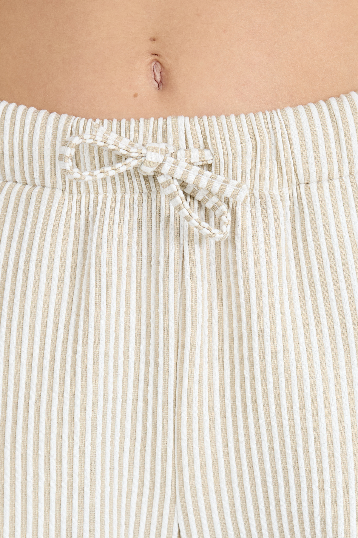 Bej Beli Lastikli Çizgili Geniş Paça Dokuma Pantolon 4098
