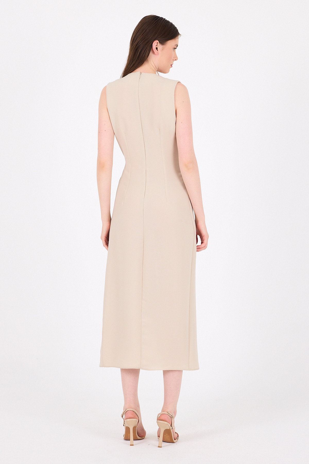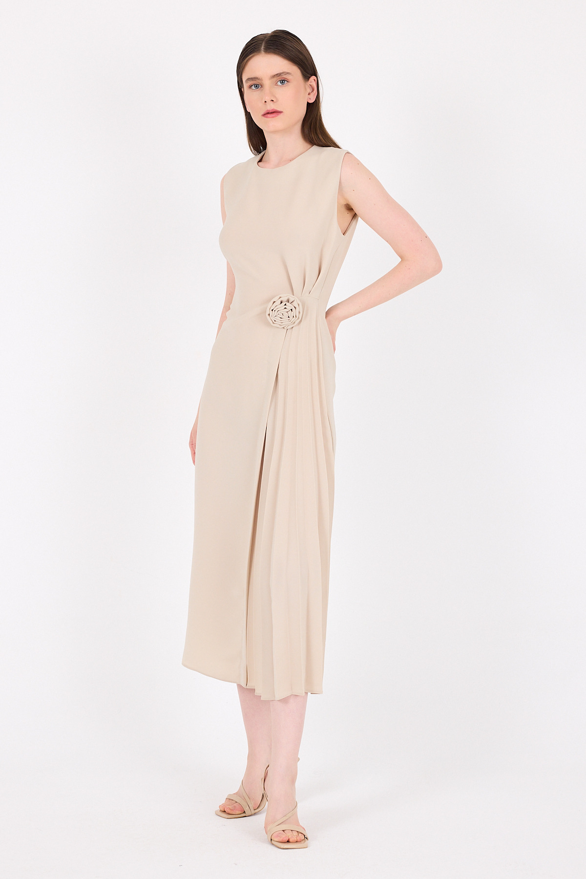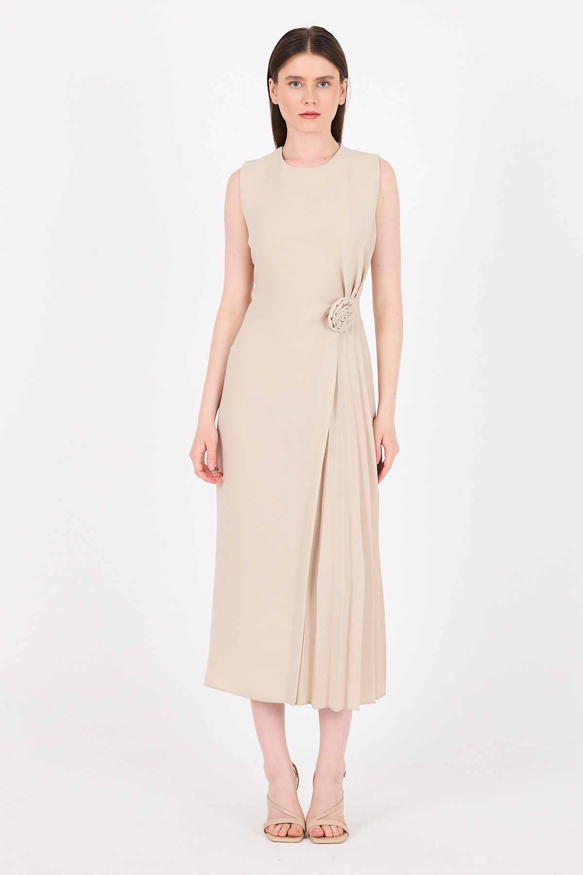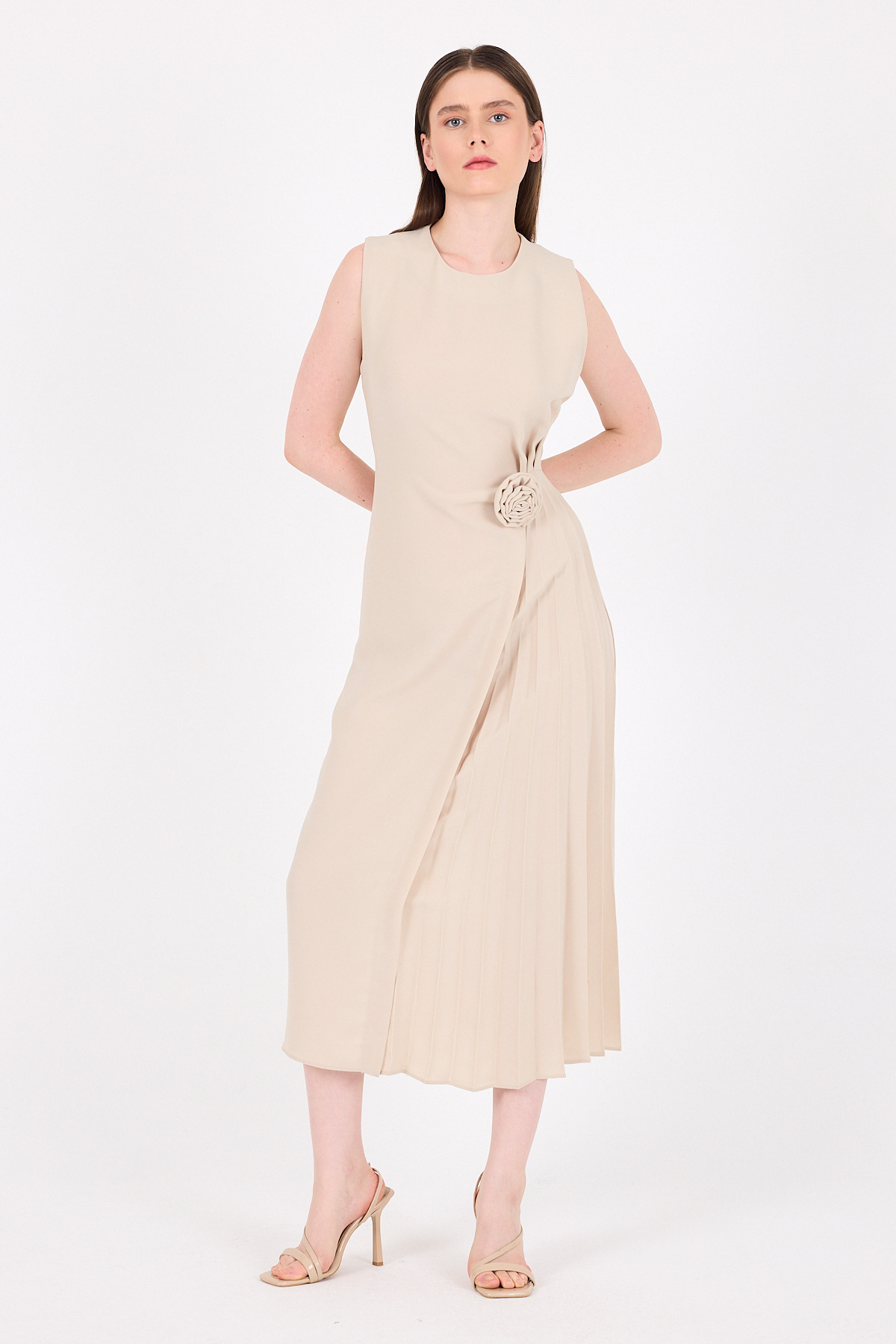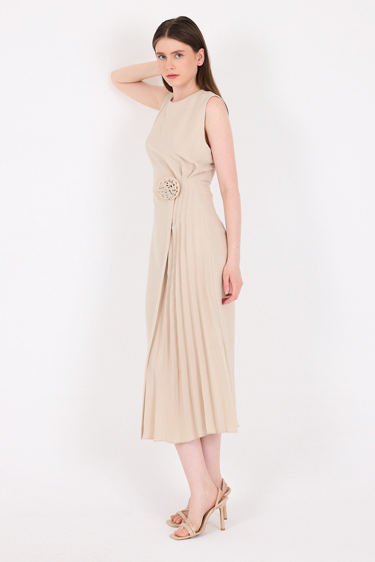 Bej Çiçek Detaylı Pliseli Midi Abiye Elbise 251671