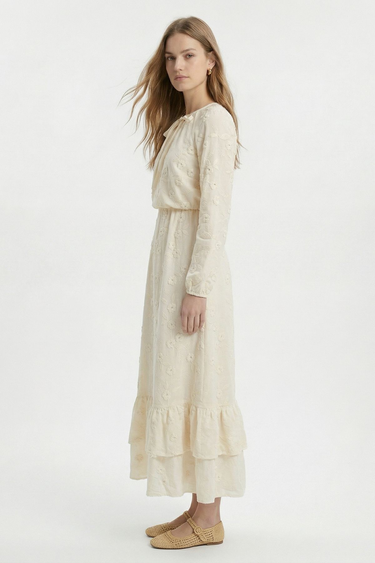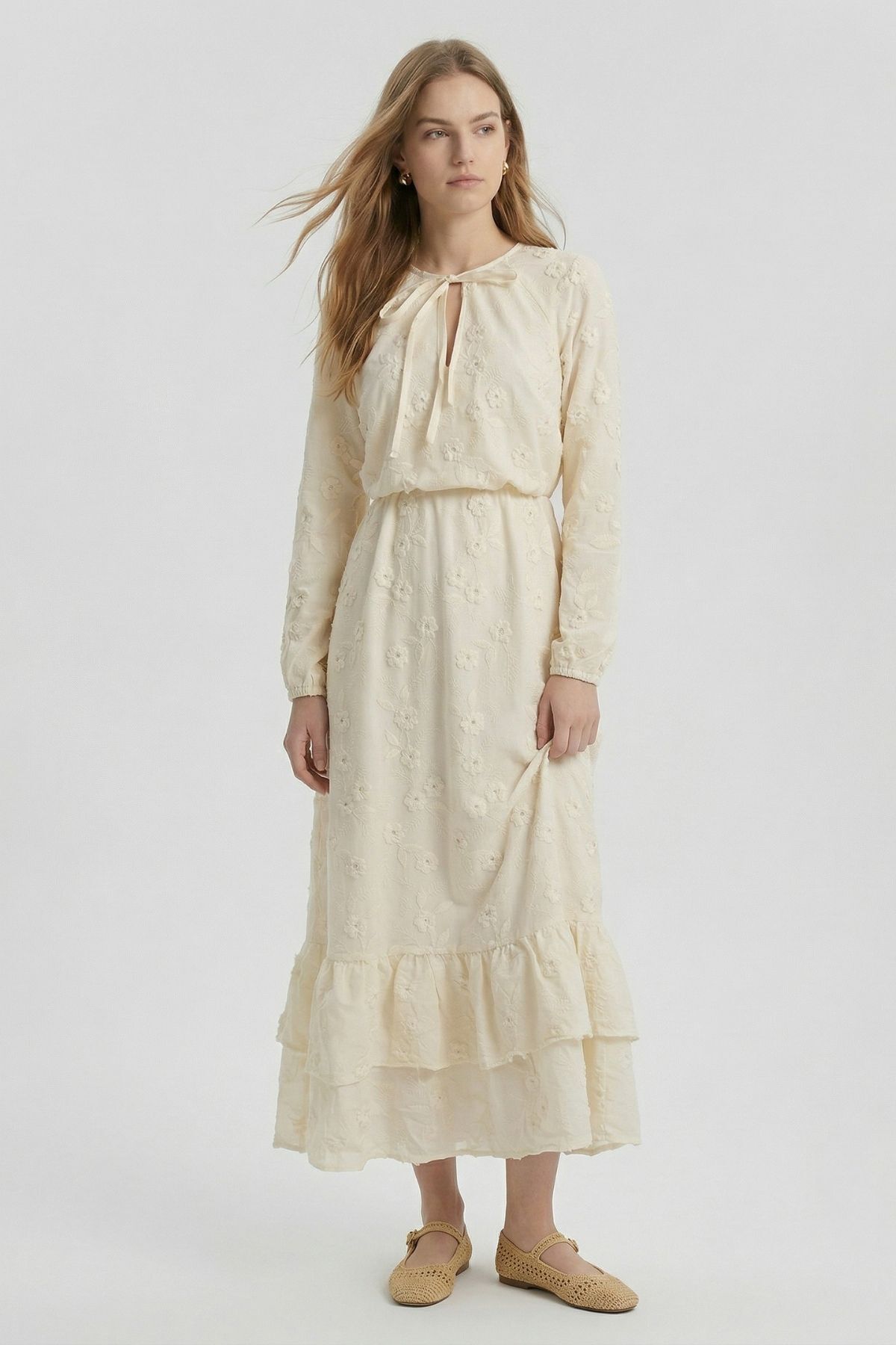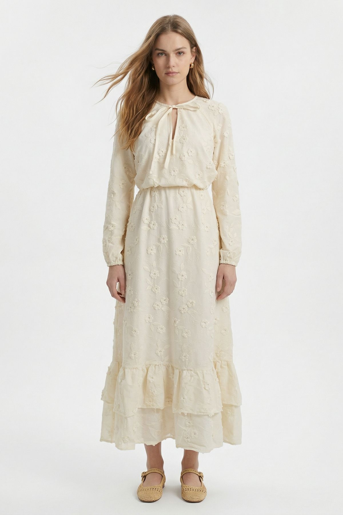 Bej Çiçek Nakışlı Bağcıklı Elbise 2377