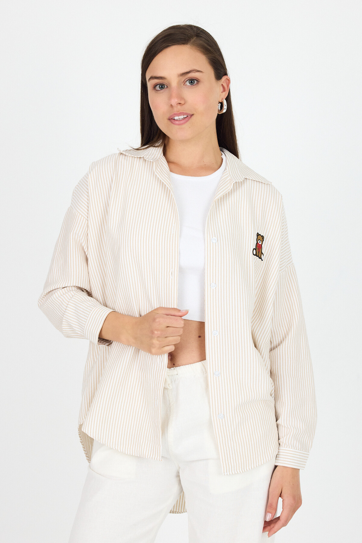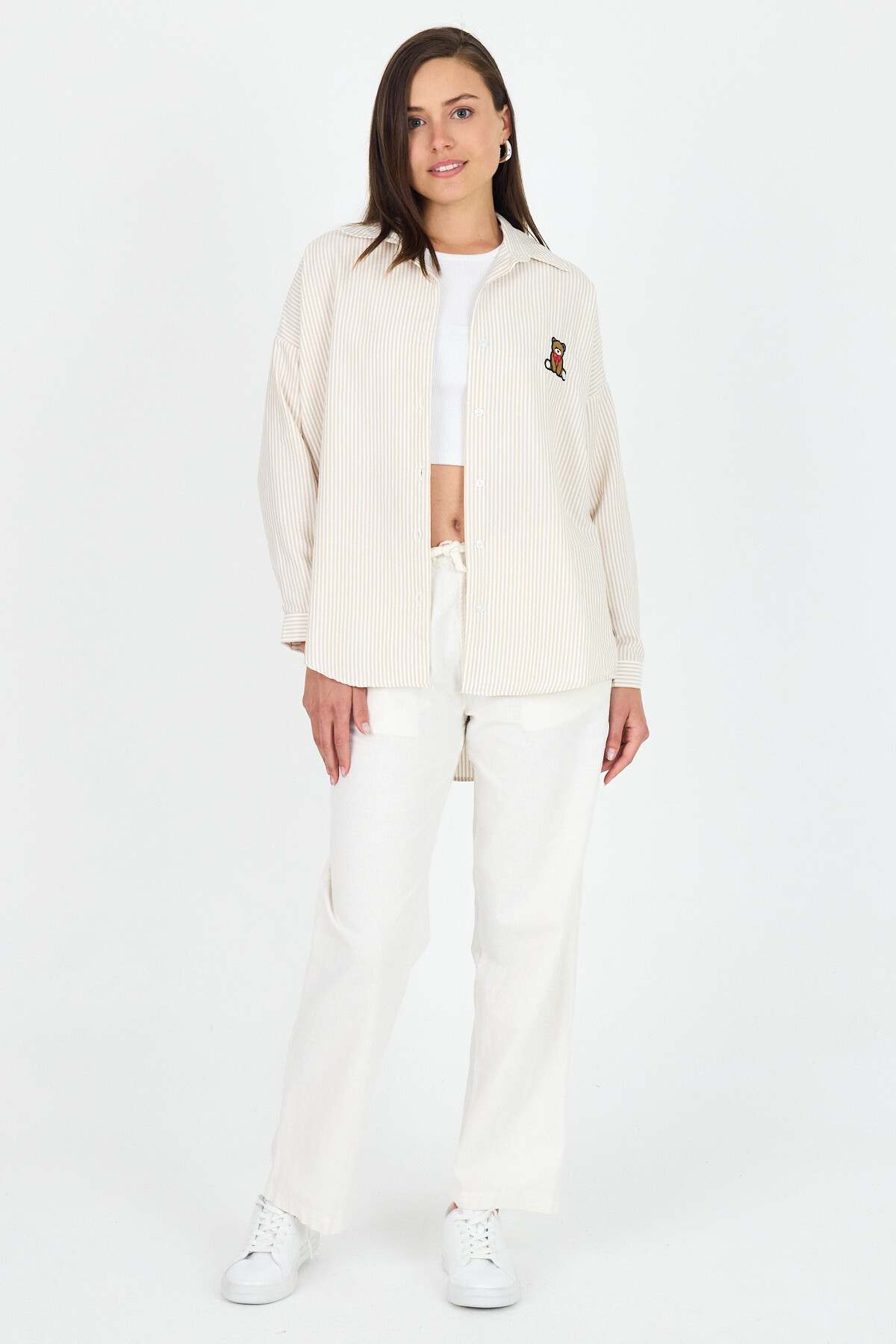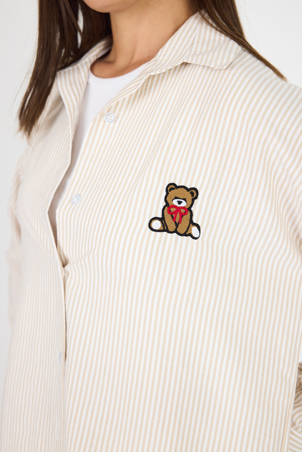 Bej Çizgili Ayıcık Nakışlı Pamuklu Oversize Gömlek 4689A