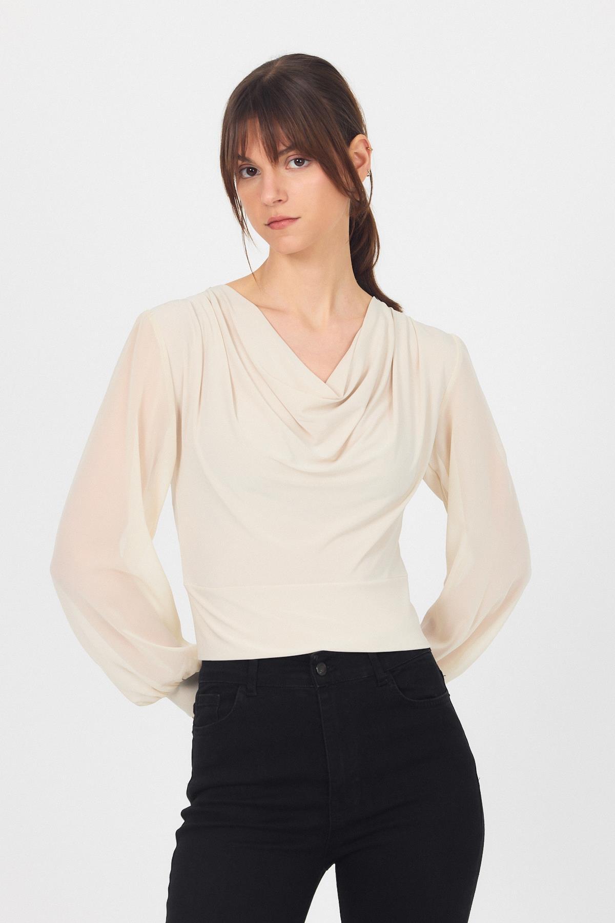 Bej Drapeli Tül Kol Detaylı Bluz 9474