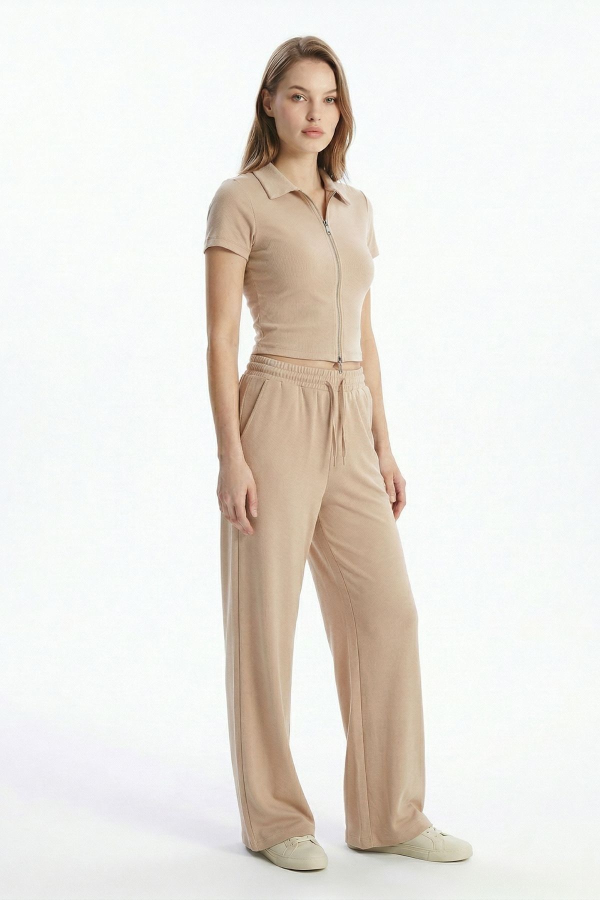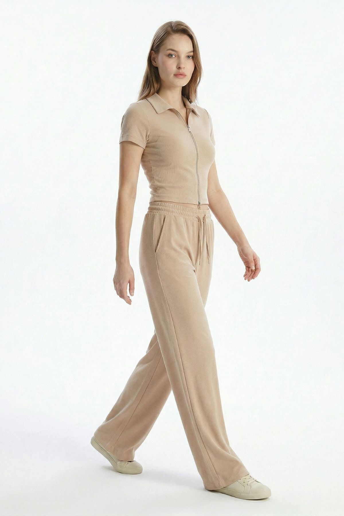 Bej Fermuarlı Gömlek Yaka Eşofman Takım 0426