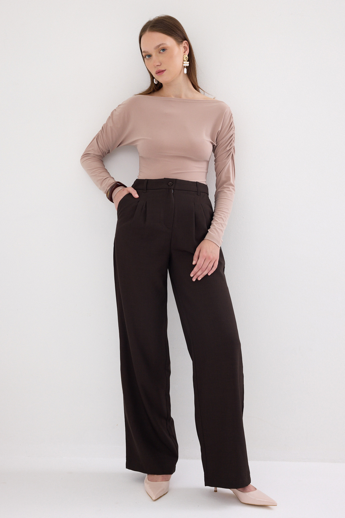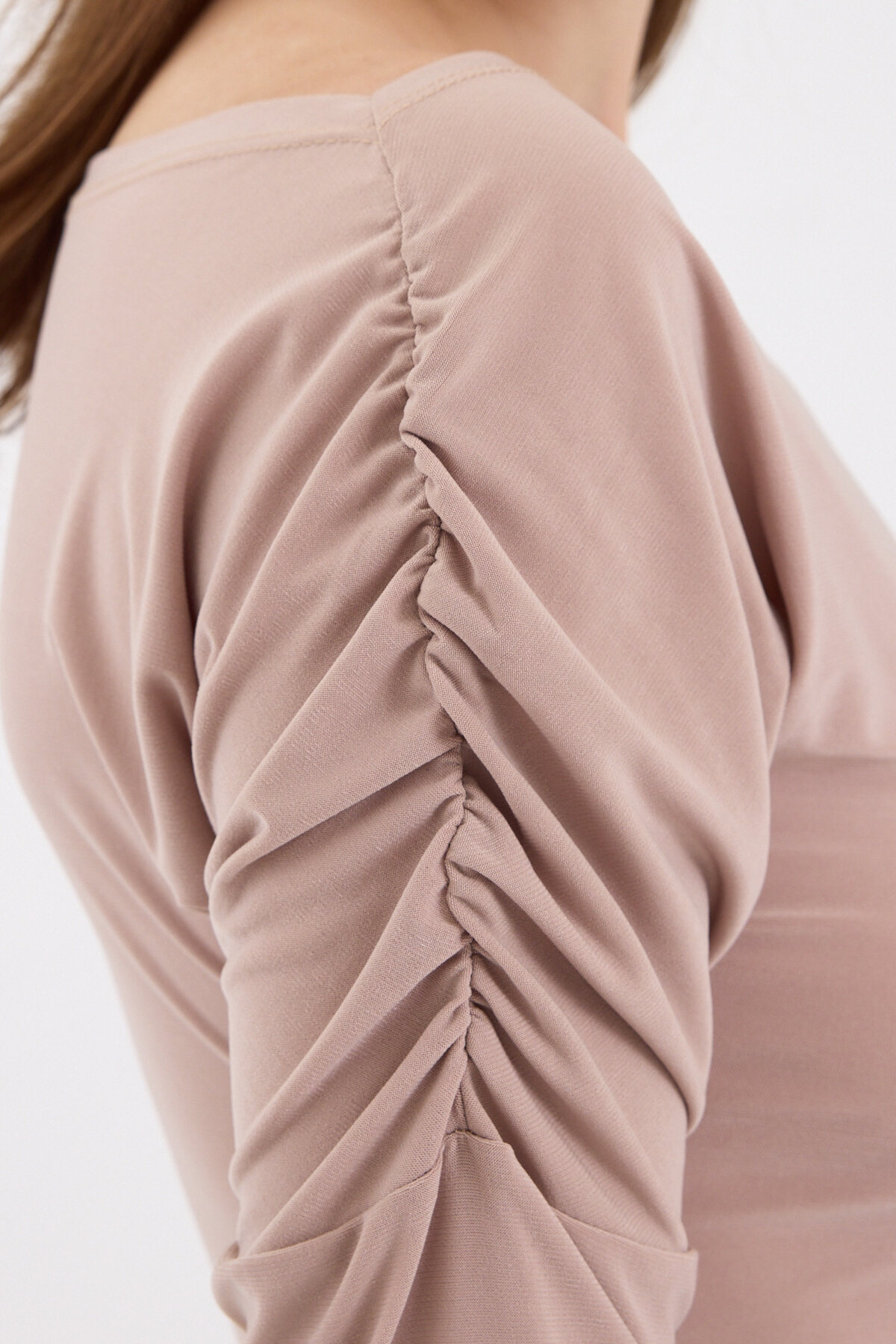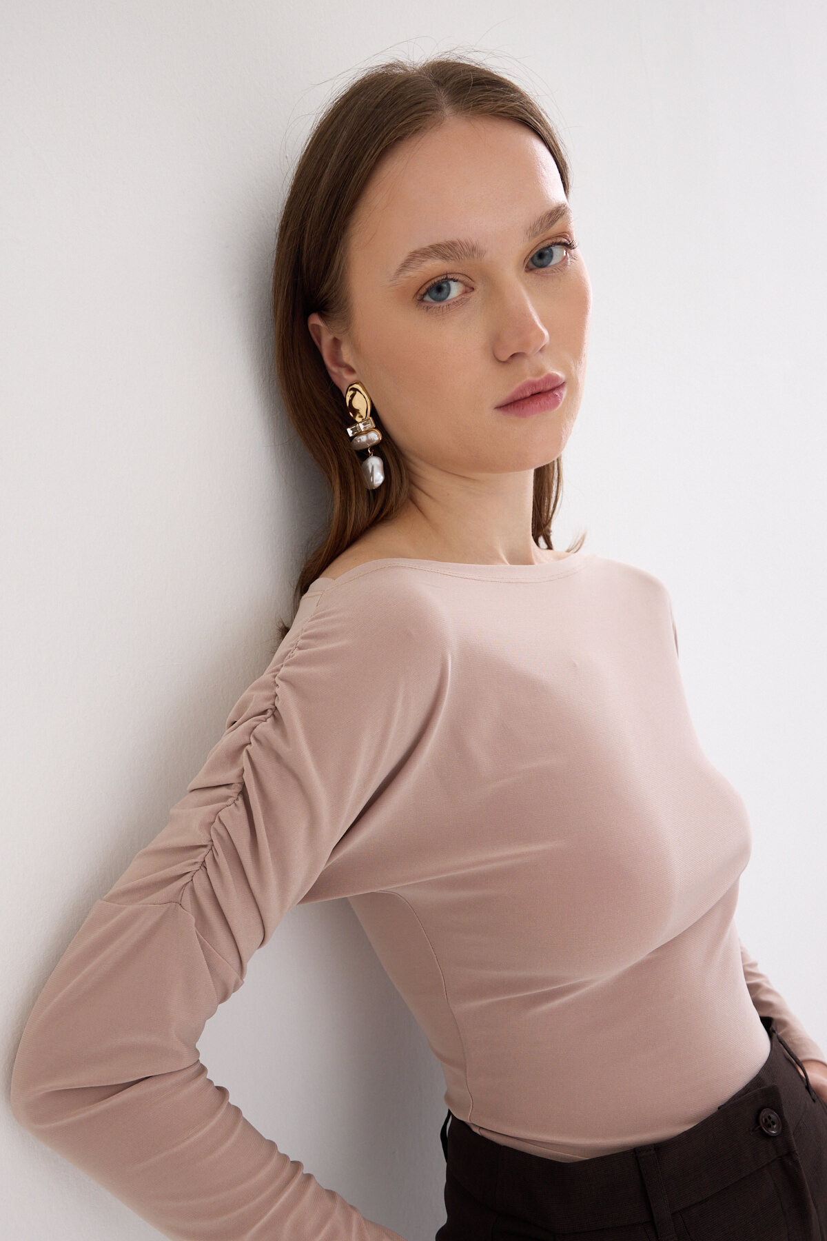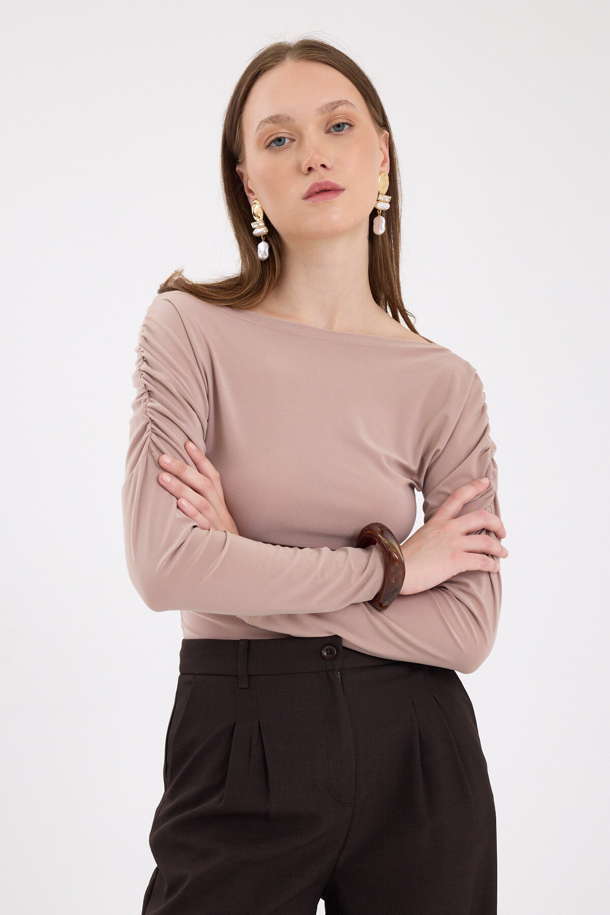 Bej Kayık Yaka Kol Büzgülü Bluz 2433