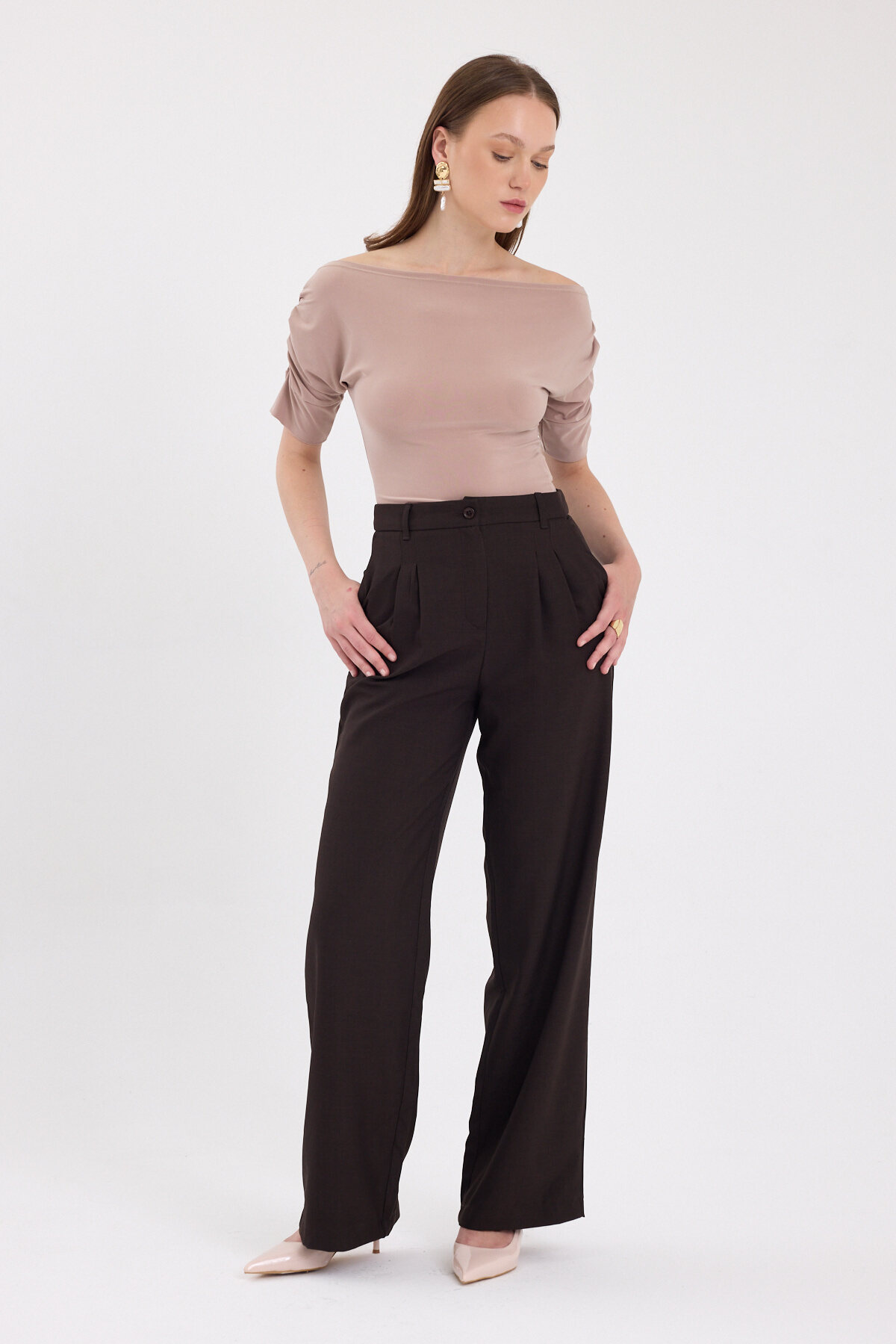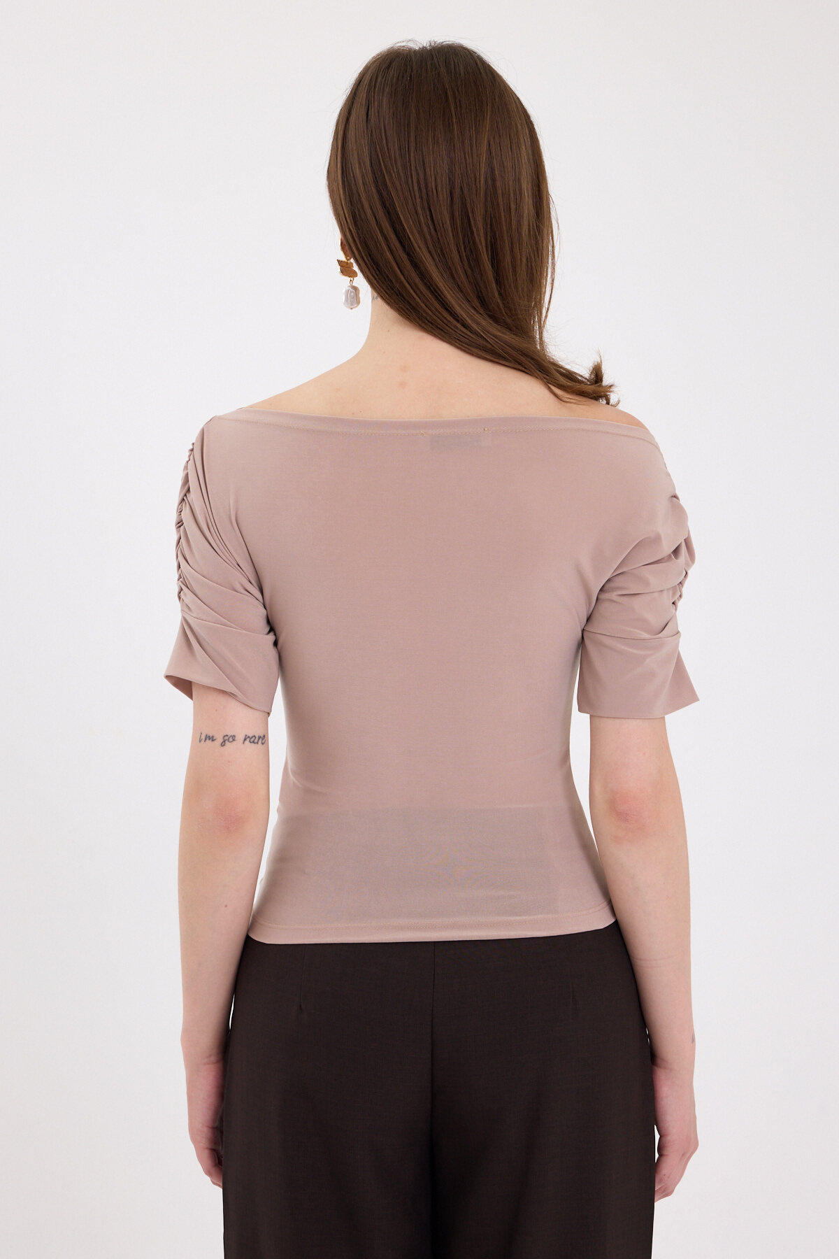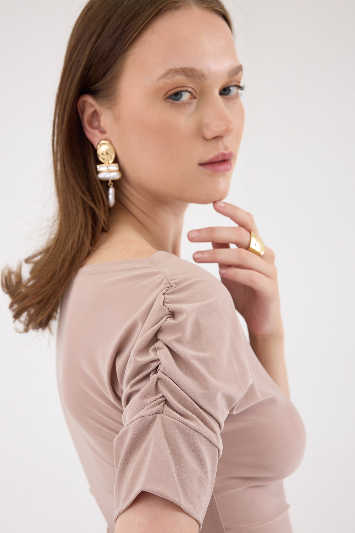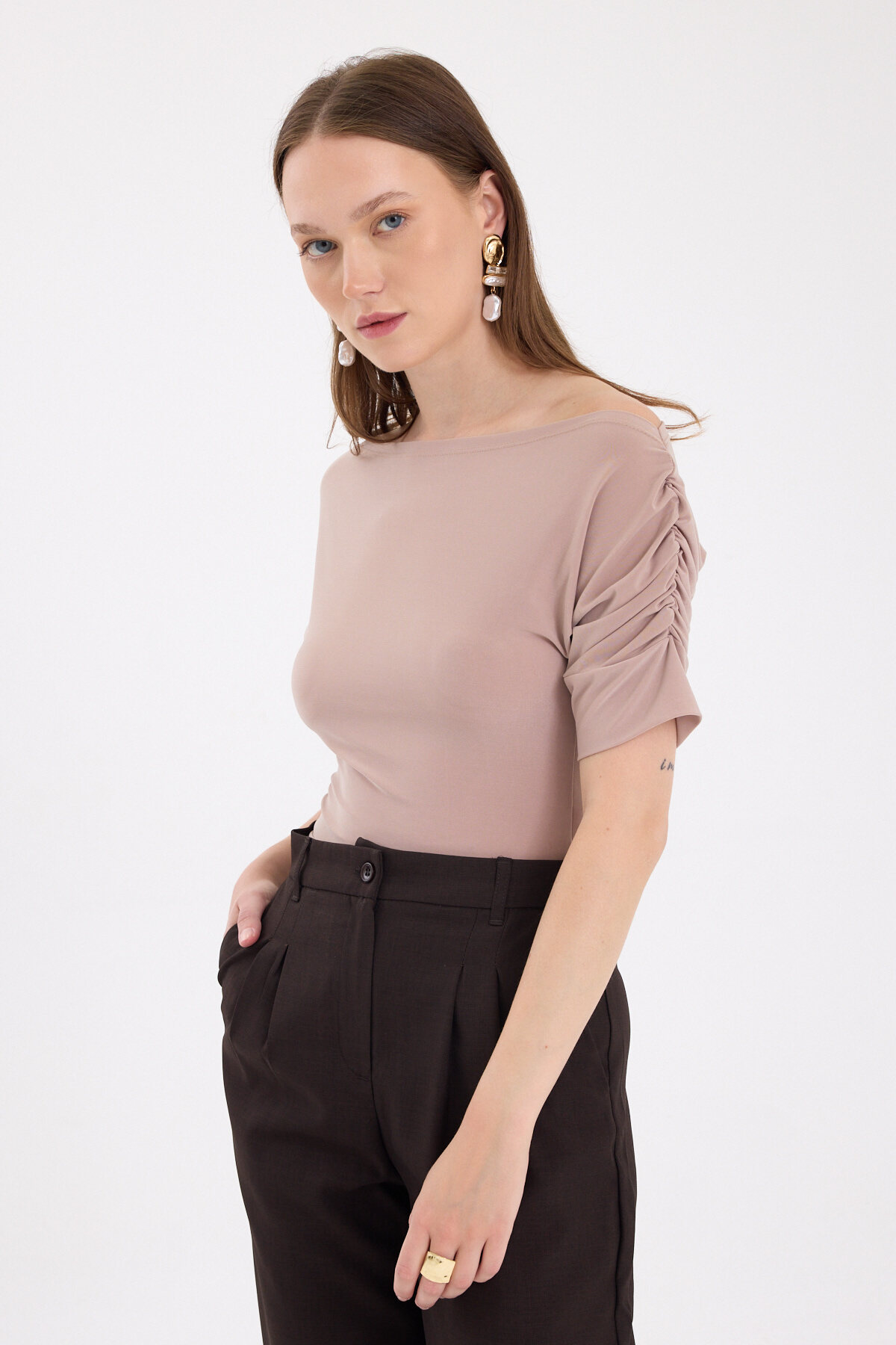 Bej Kayık Yaka Kol Büzgülü Bluz 2515