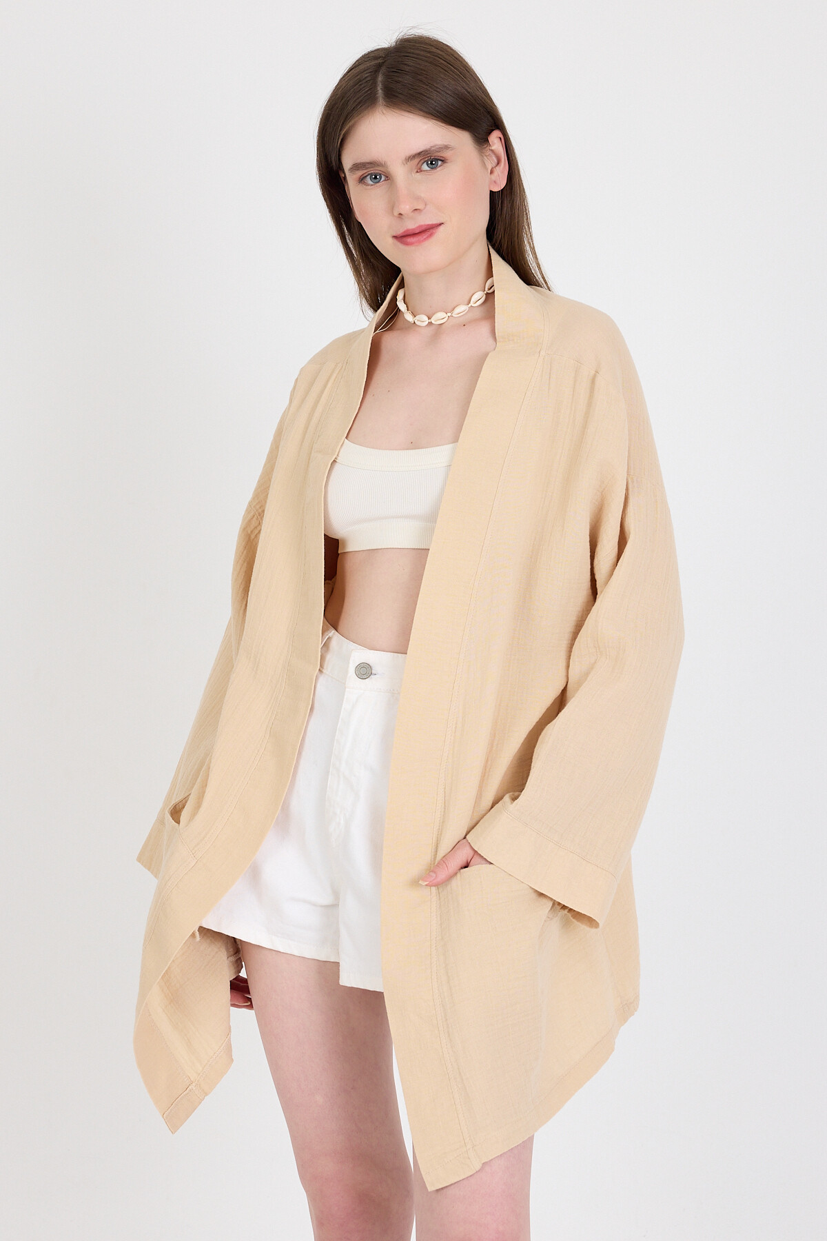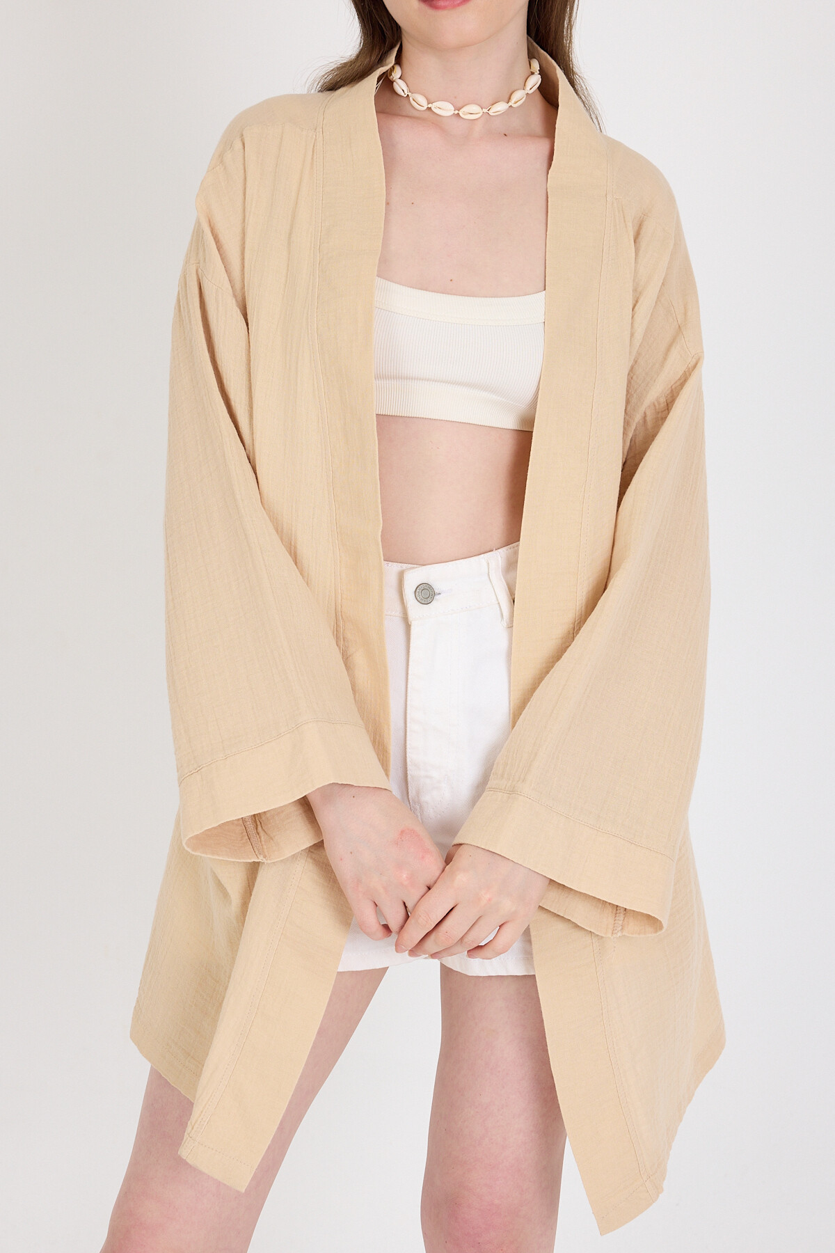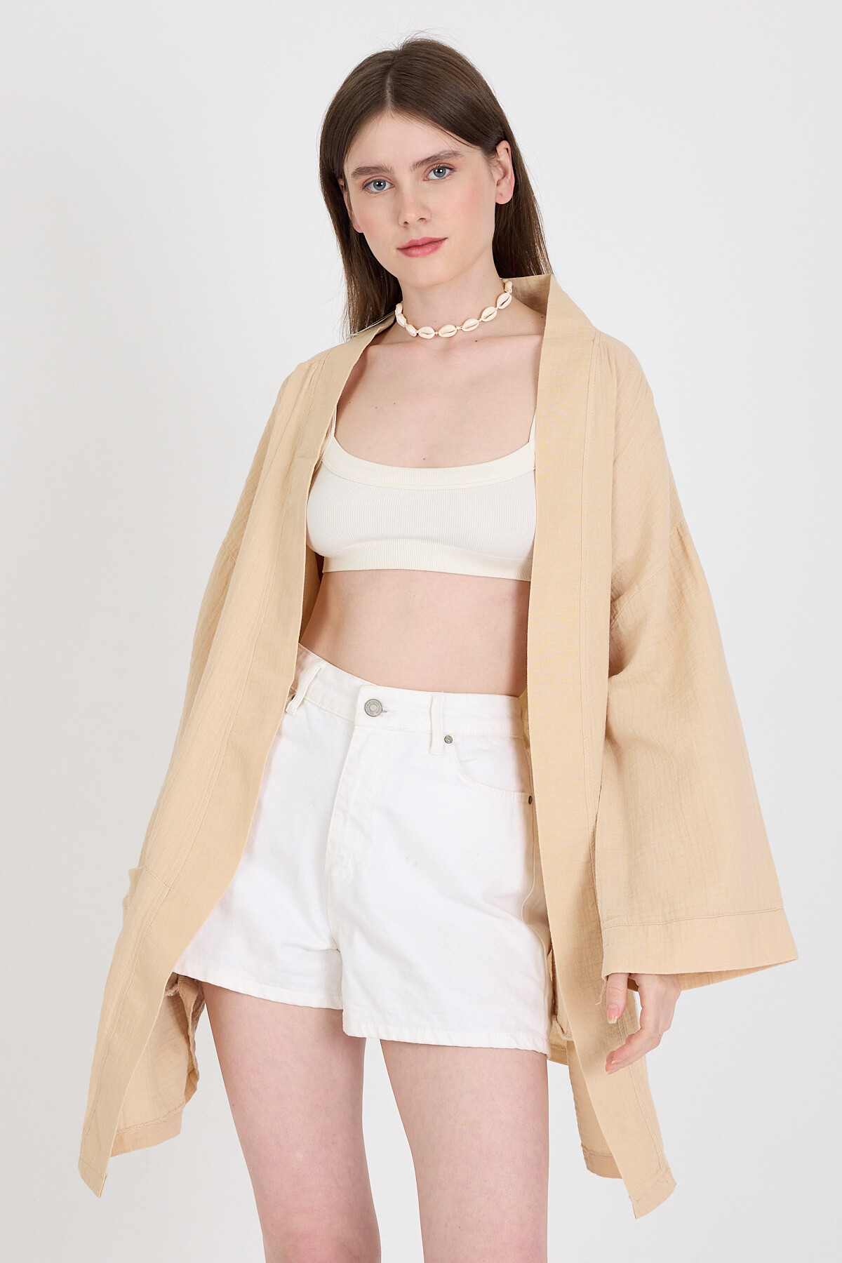 Bej Keten Görünümlü %100 Pamuk Geniş Kollu Bağlama Detaylı Kimono 4802A