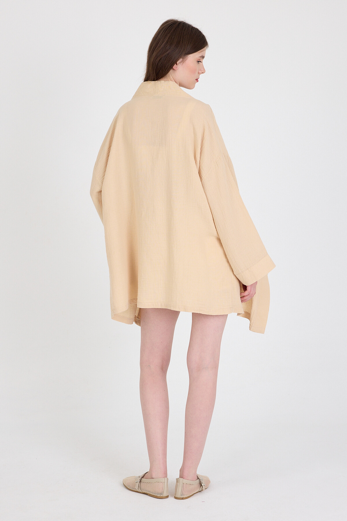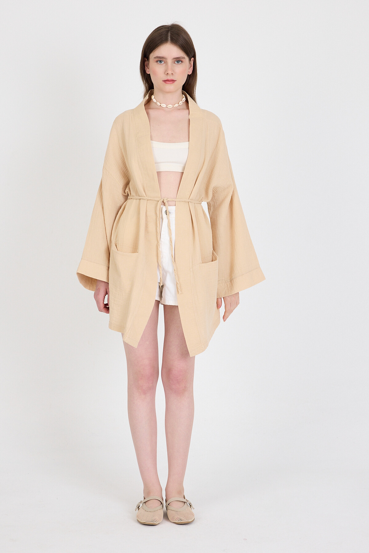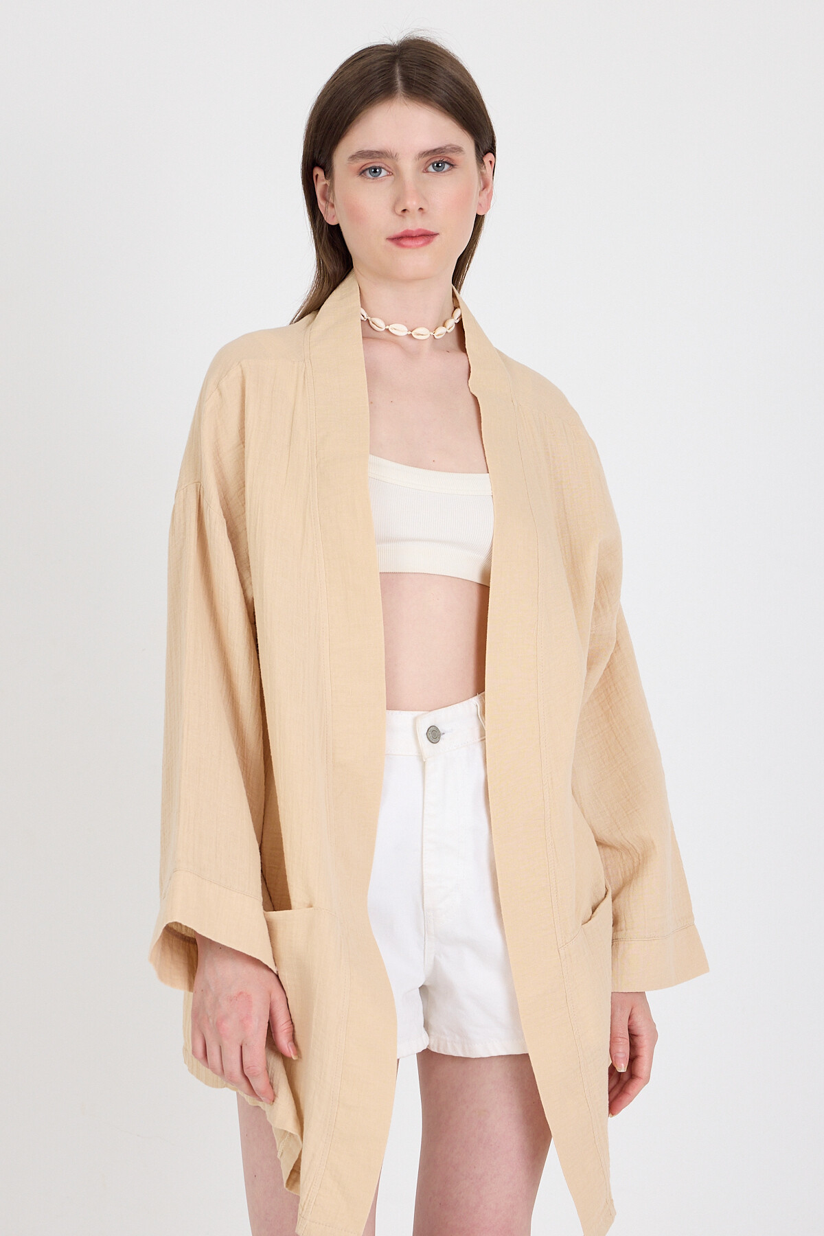 Bej Keten Görünümlü %100 Pamuk Geniş Kollu Bağlama Detaylı Kimono 4802A