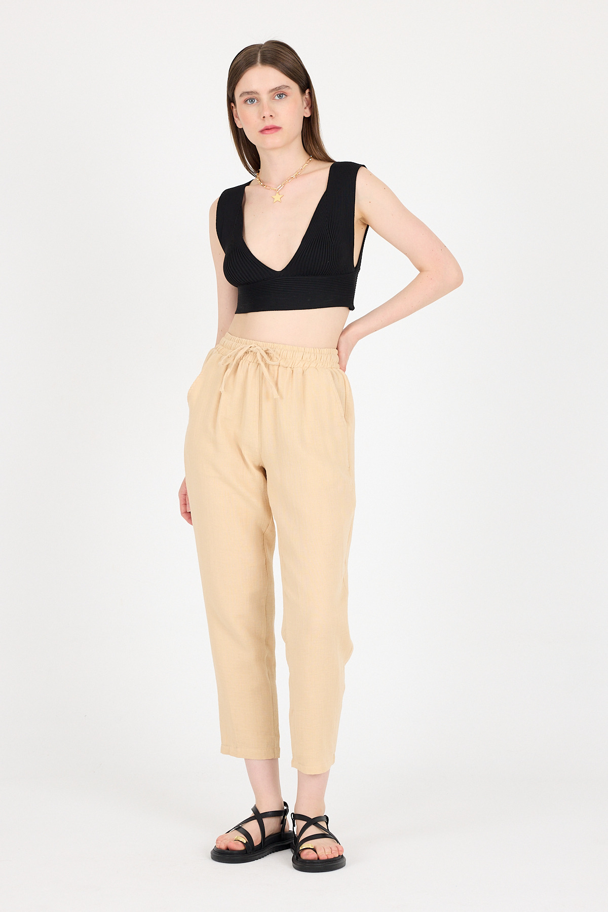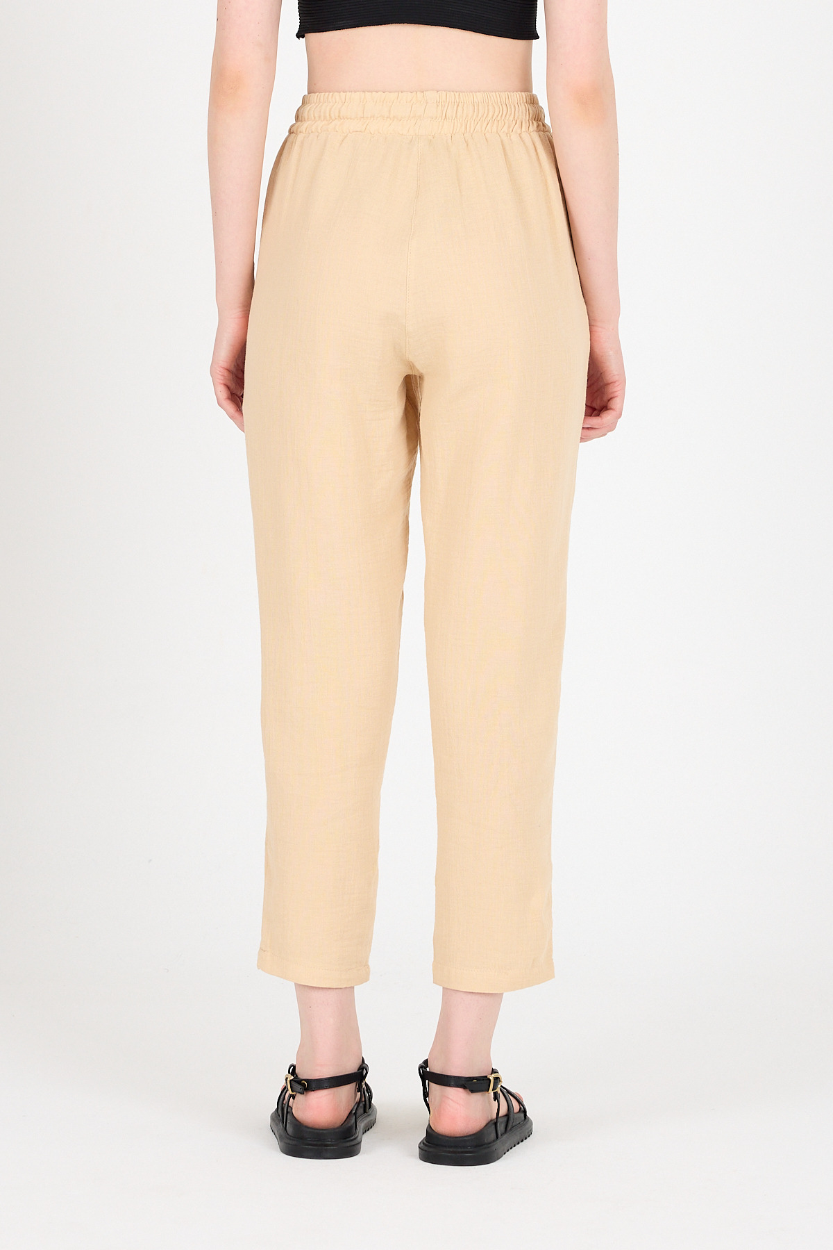 Bej Müslin %100 Pamuk Beli Lastikli Pantolon 8055A