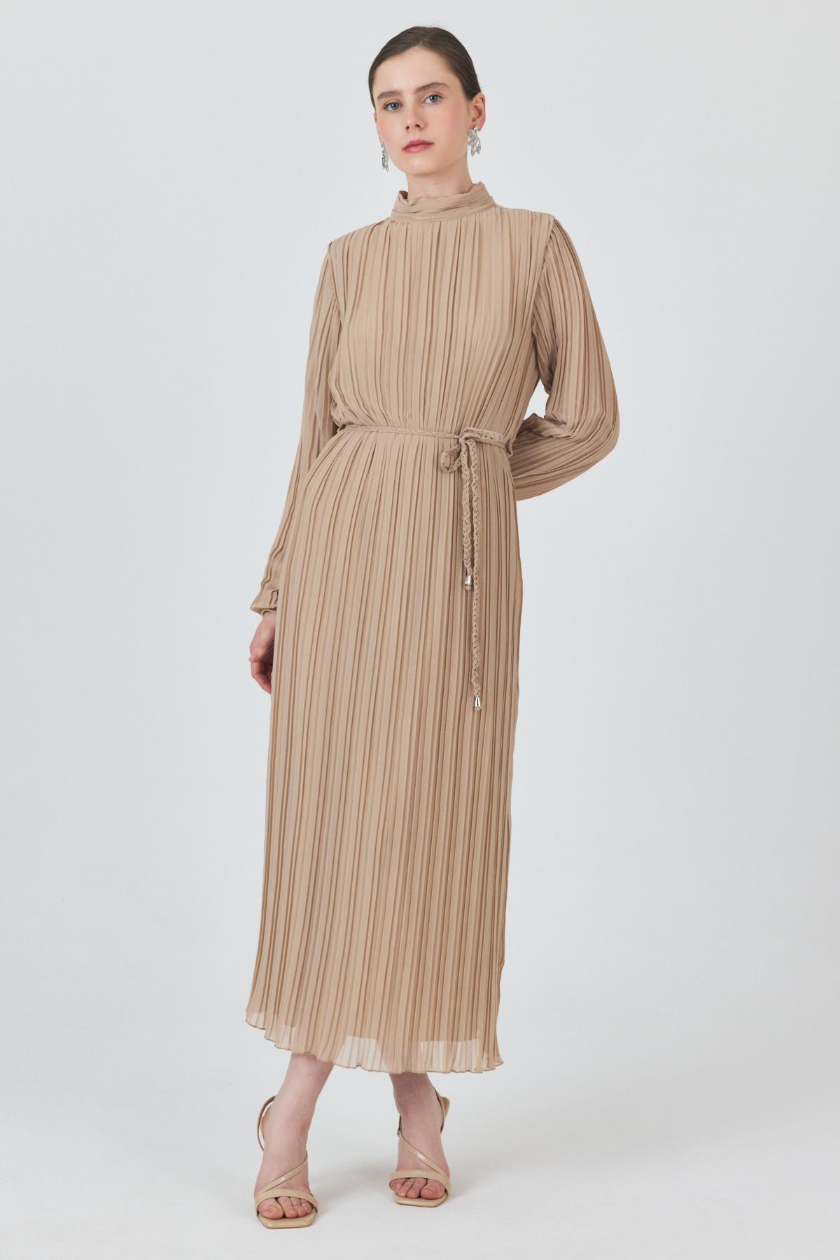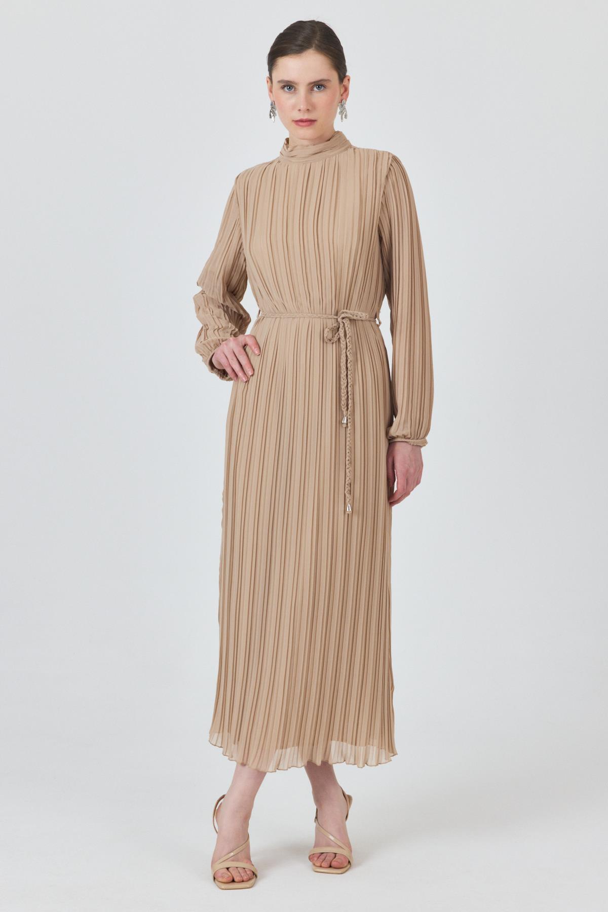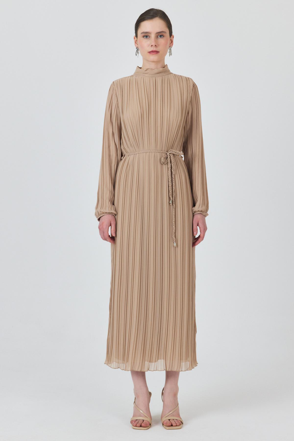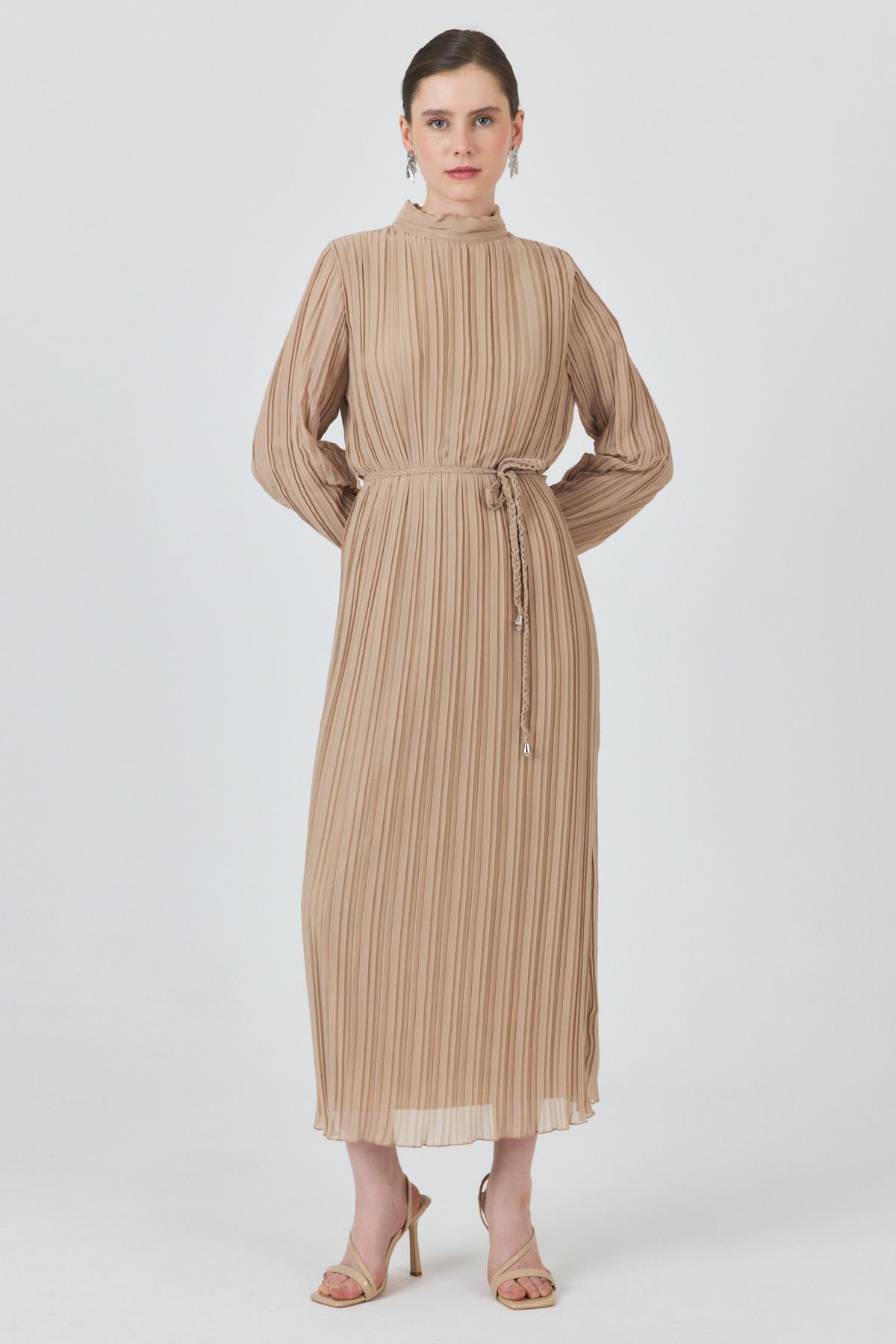Bej Pileli Uzun Kollu Kemer Detaylı Midi Boy Elbise 020