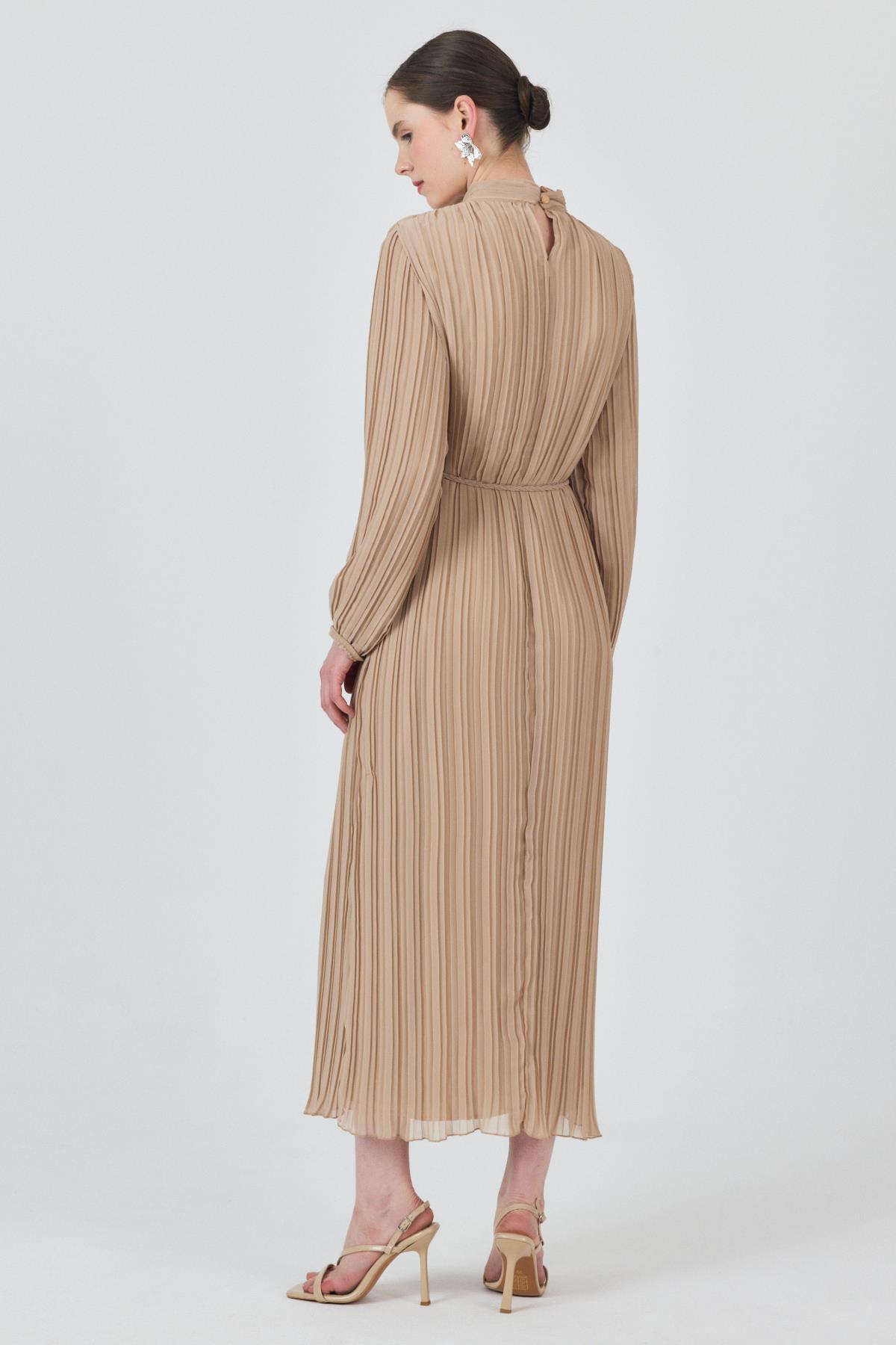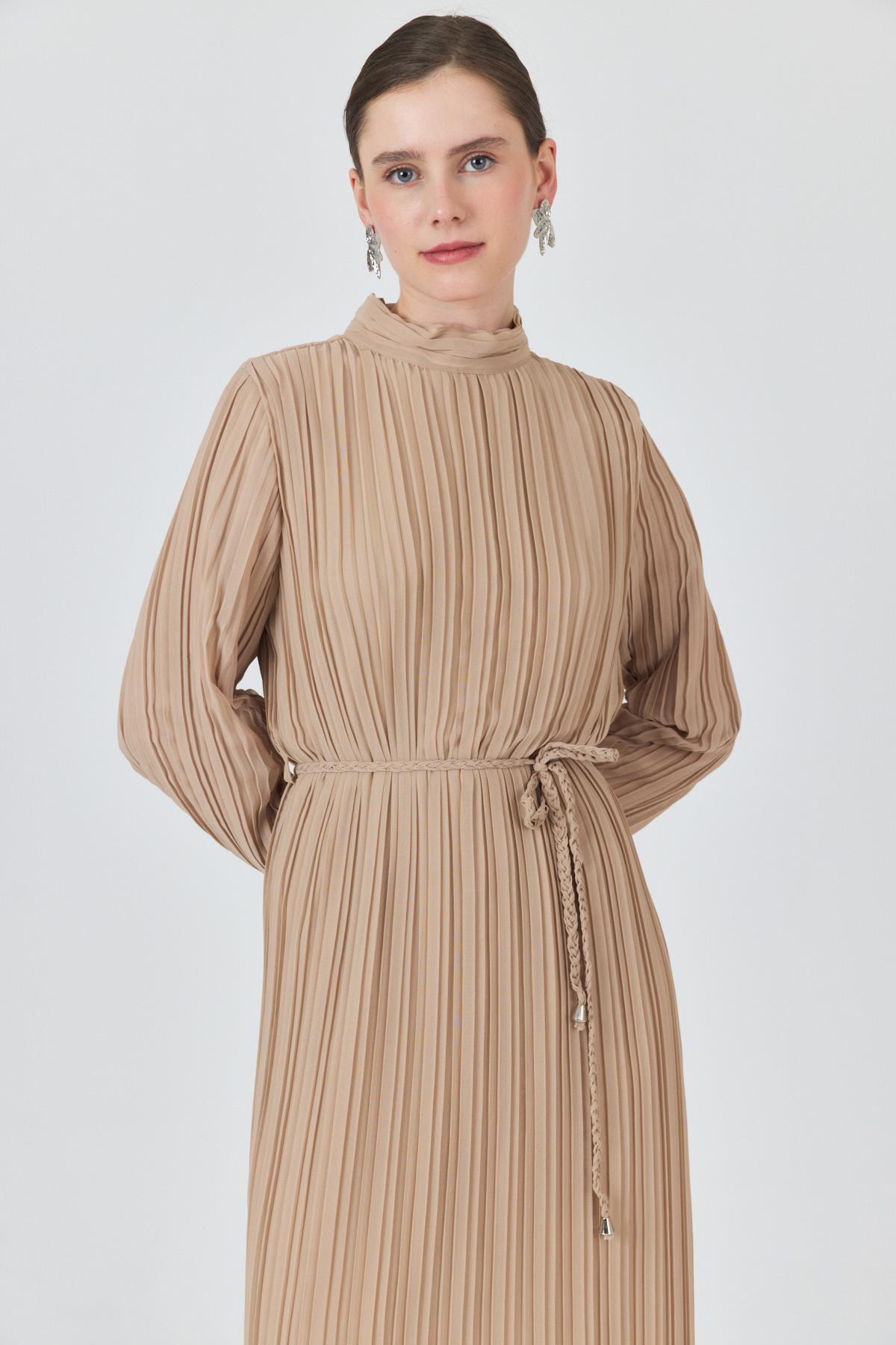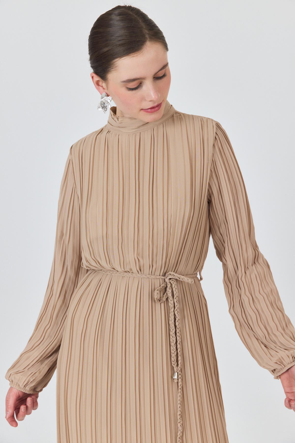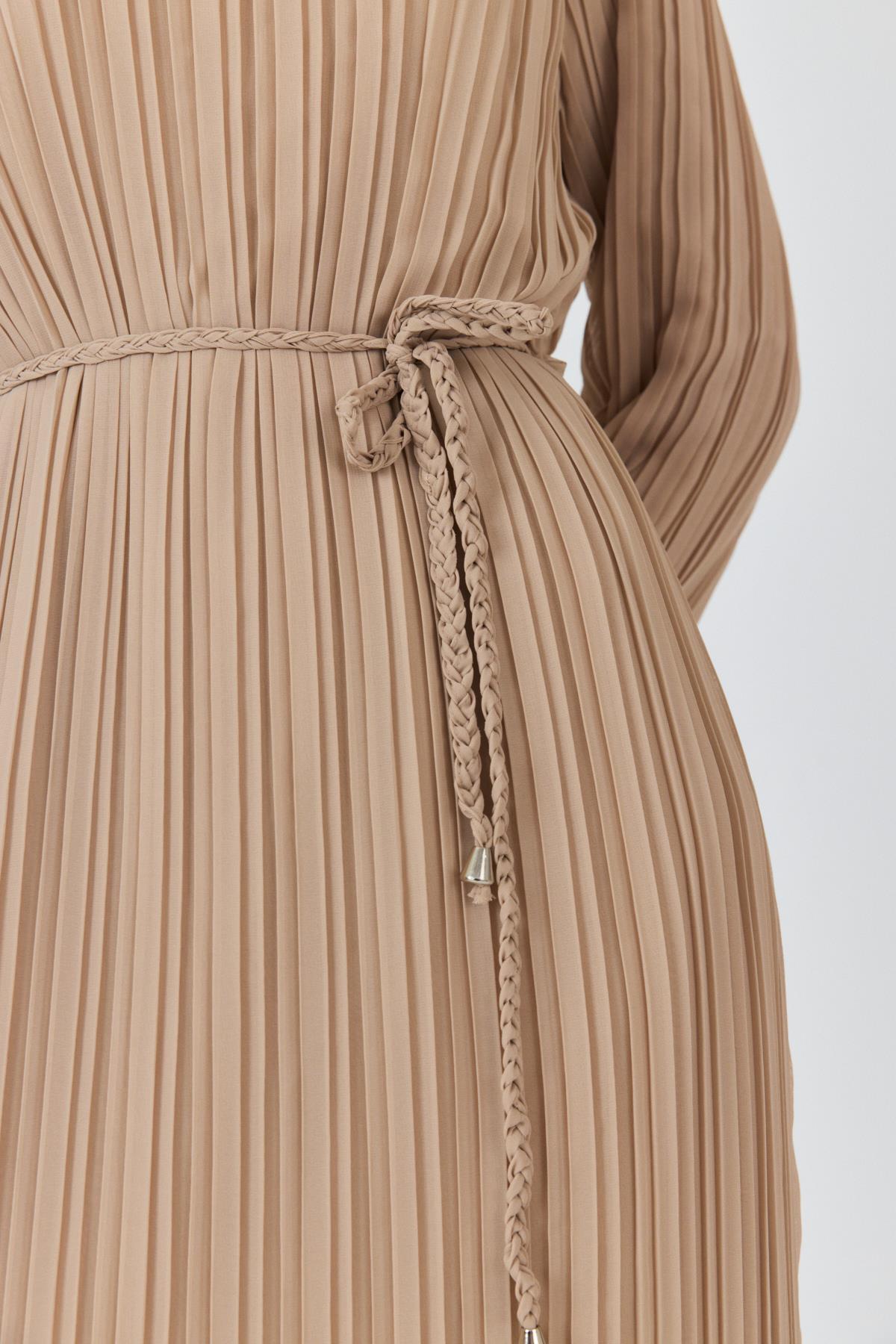 Bej Pileli Uzun Kollu Kemer Detaylı Midi Boy Elbise 020