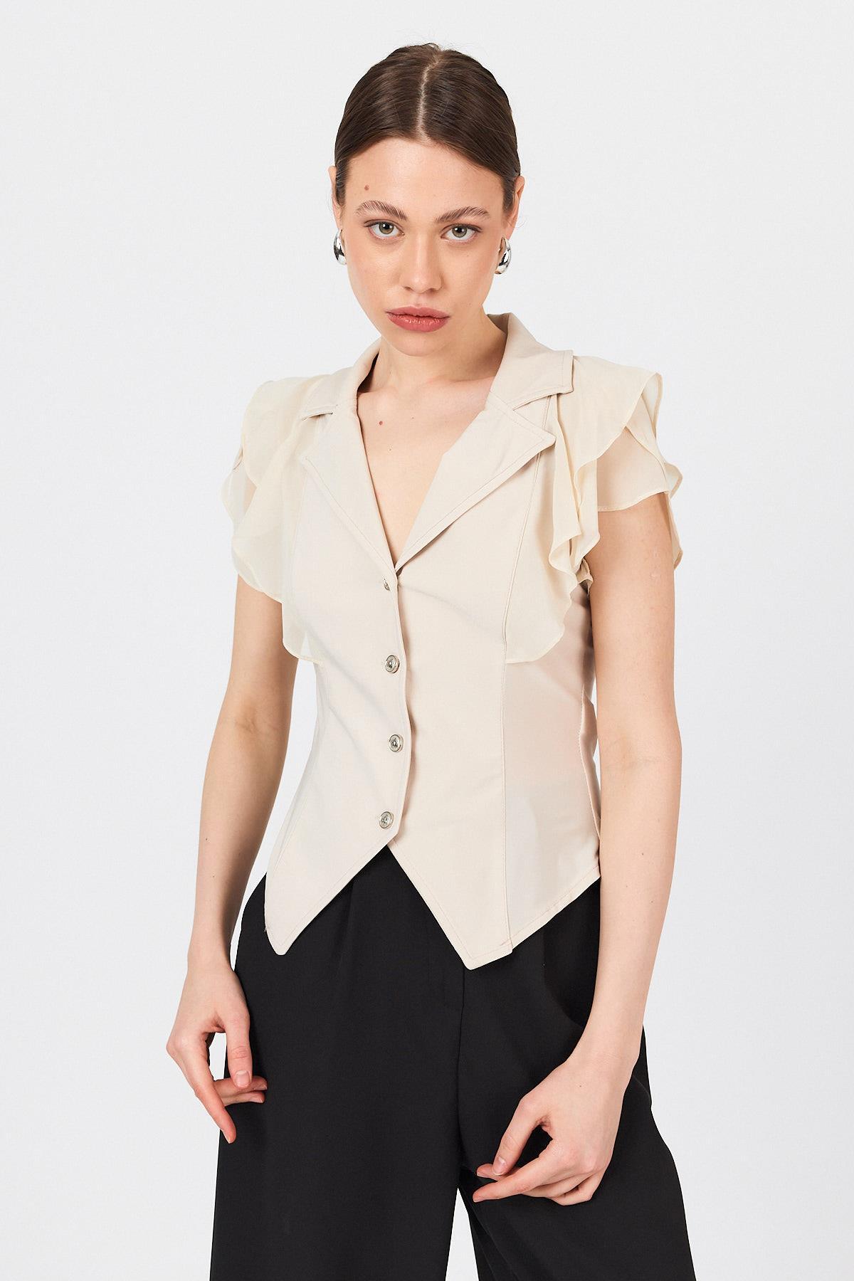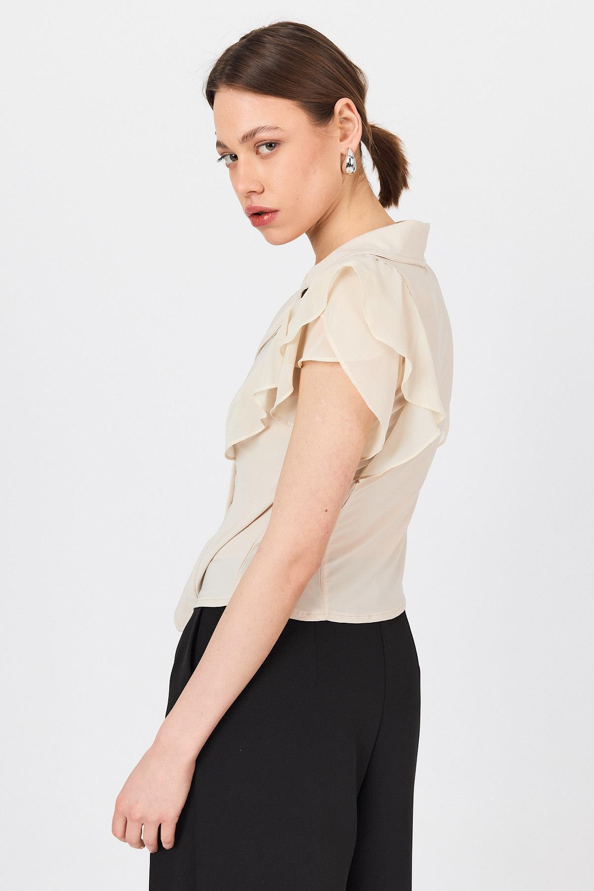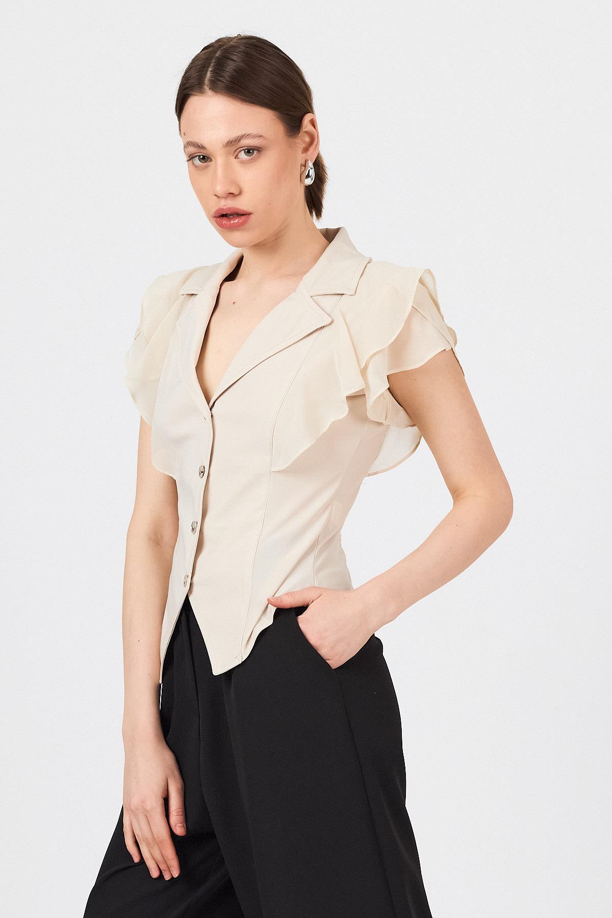 Bej Şifon Kol Detaylı Fırfırlı Düğmeli Bluz 9477