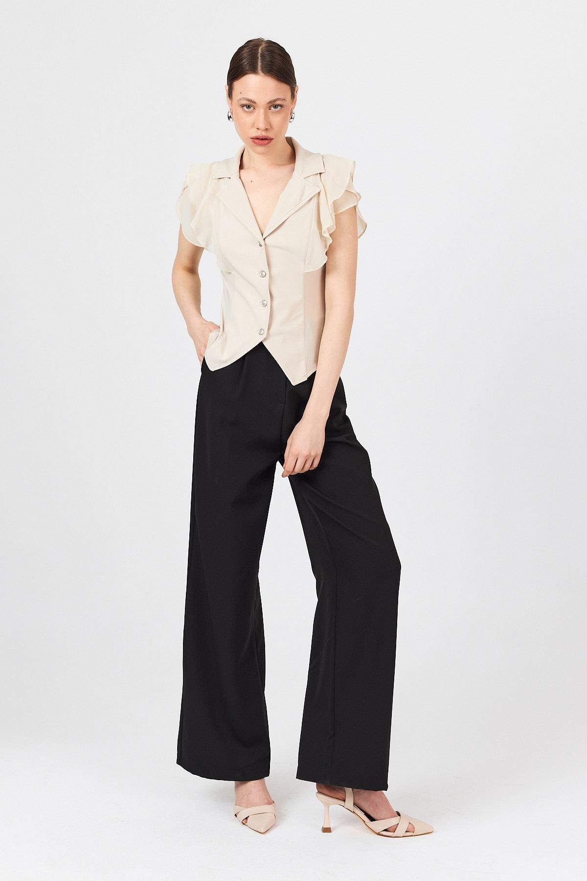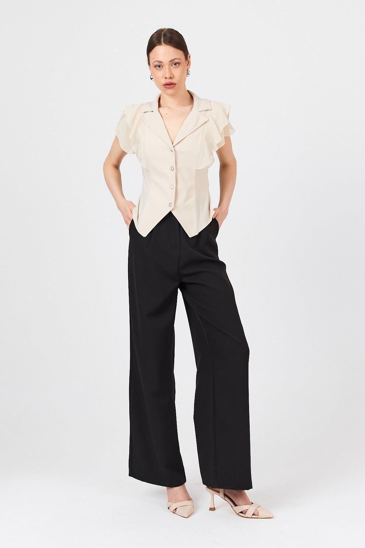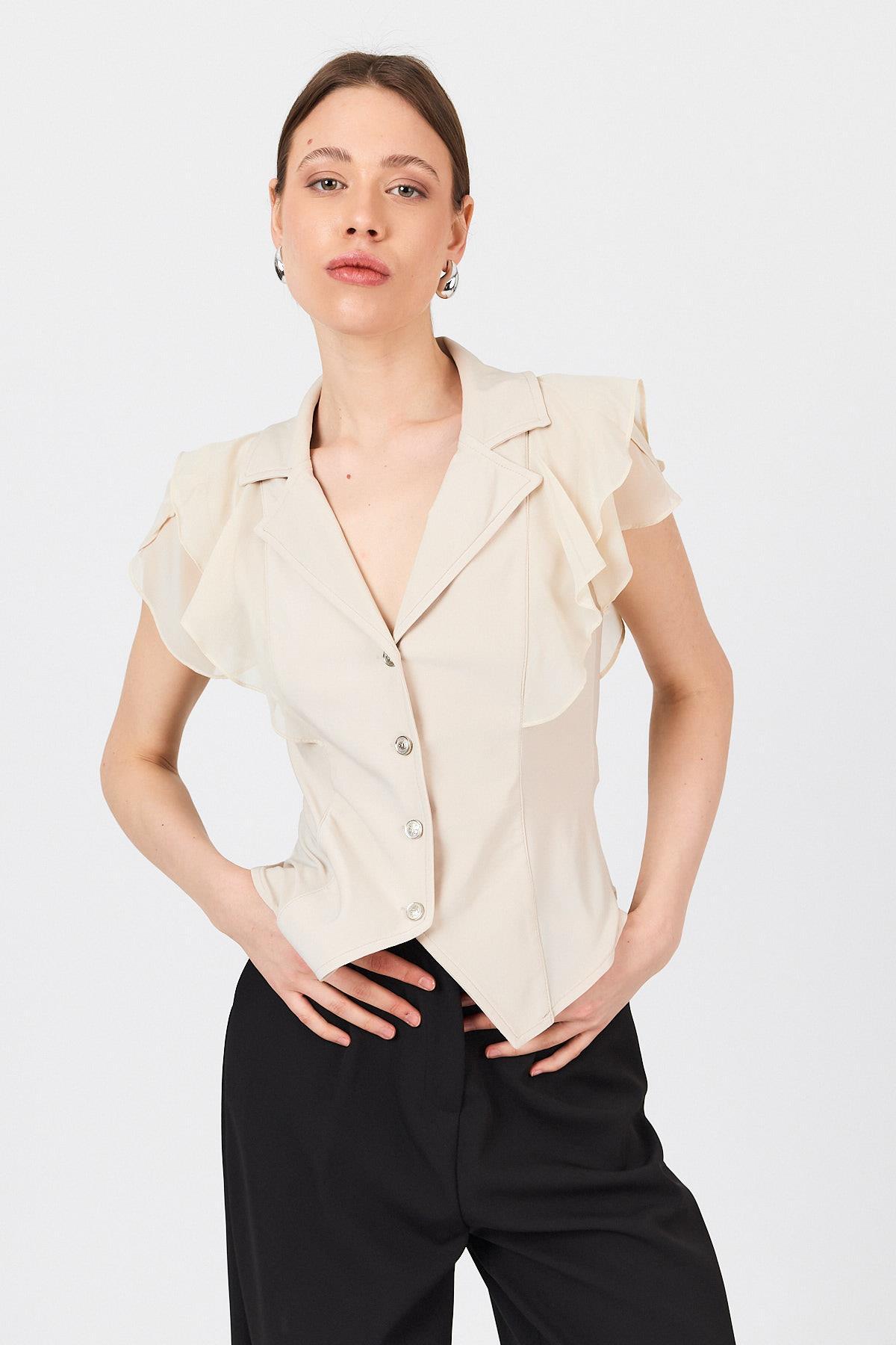 Bej Şifon Kol Detaylı Fırfırlı Düğmeli Bluz 9477