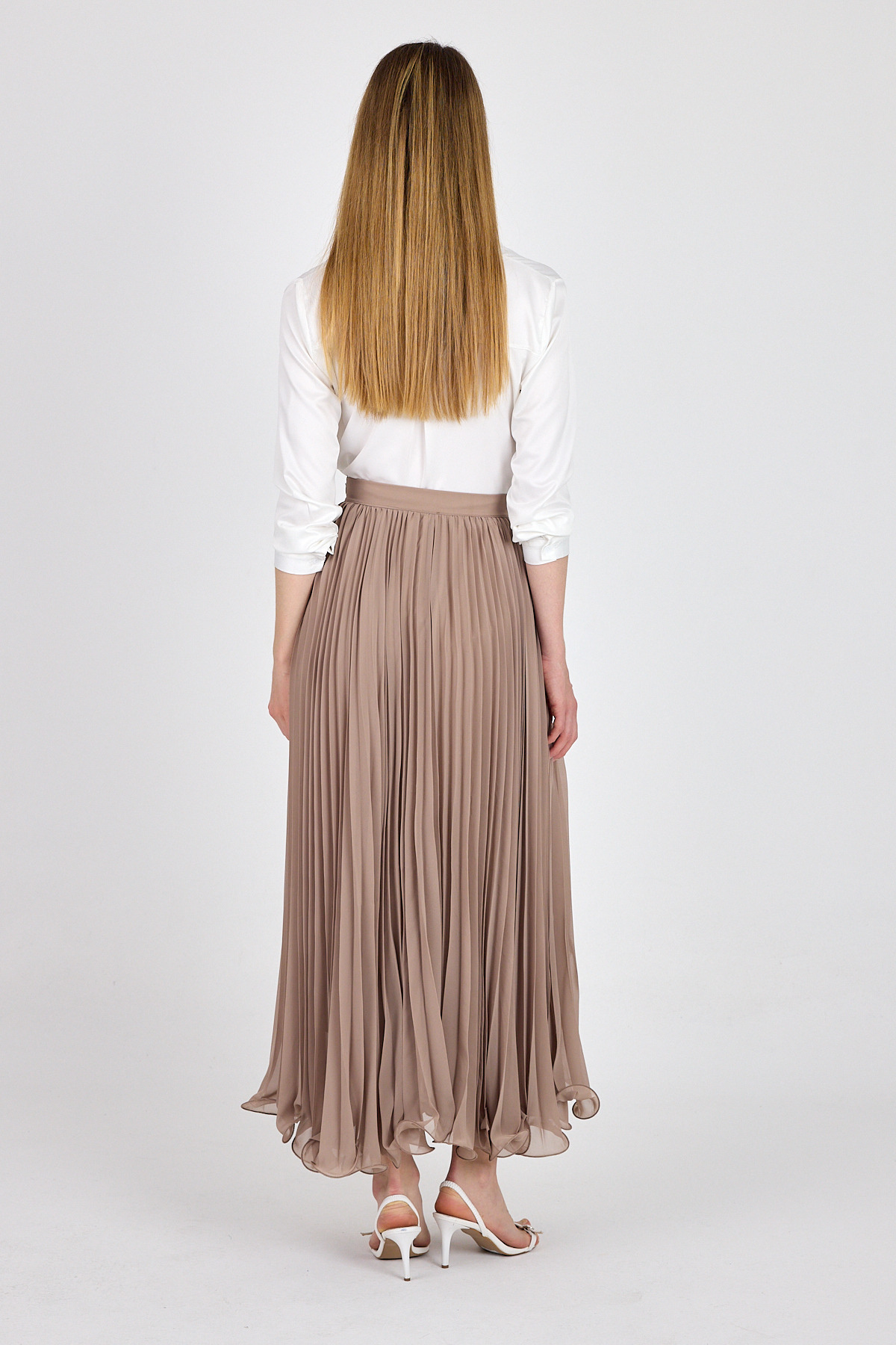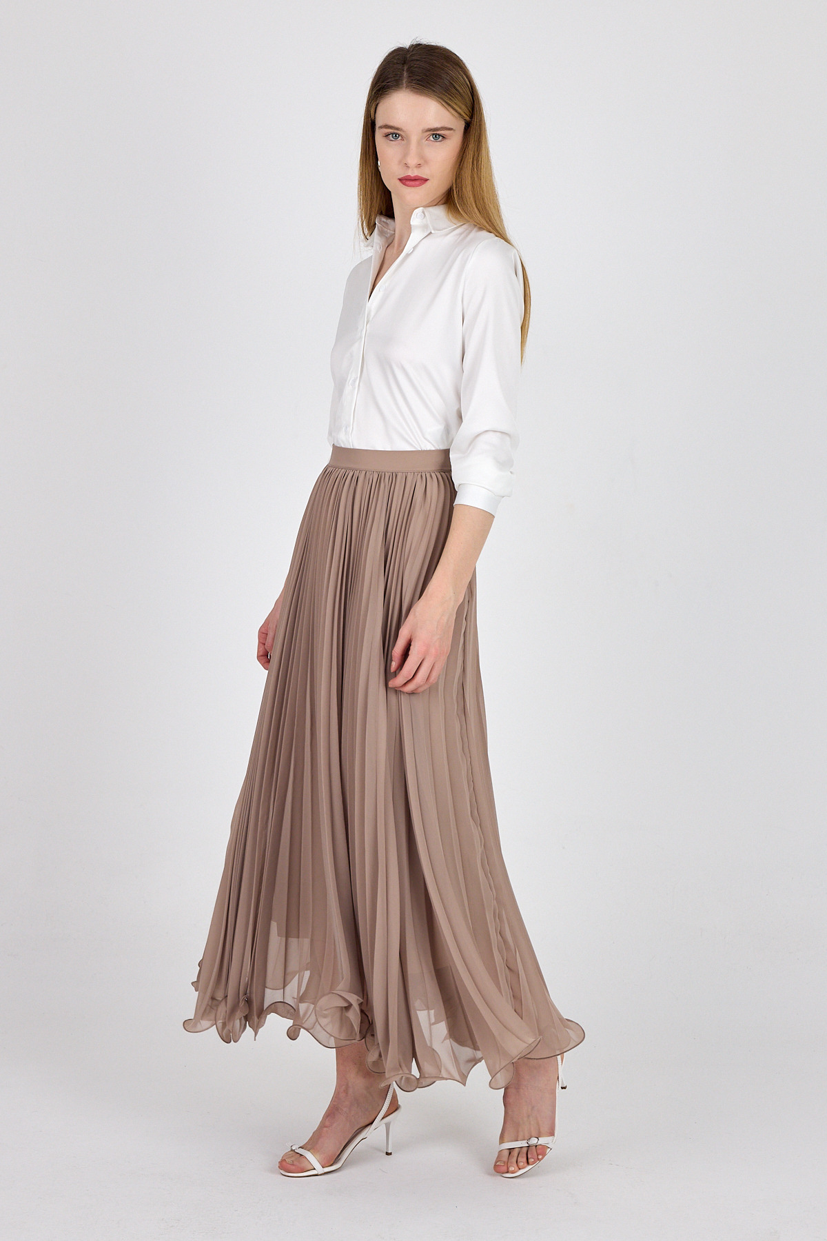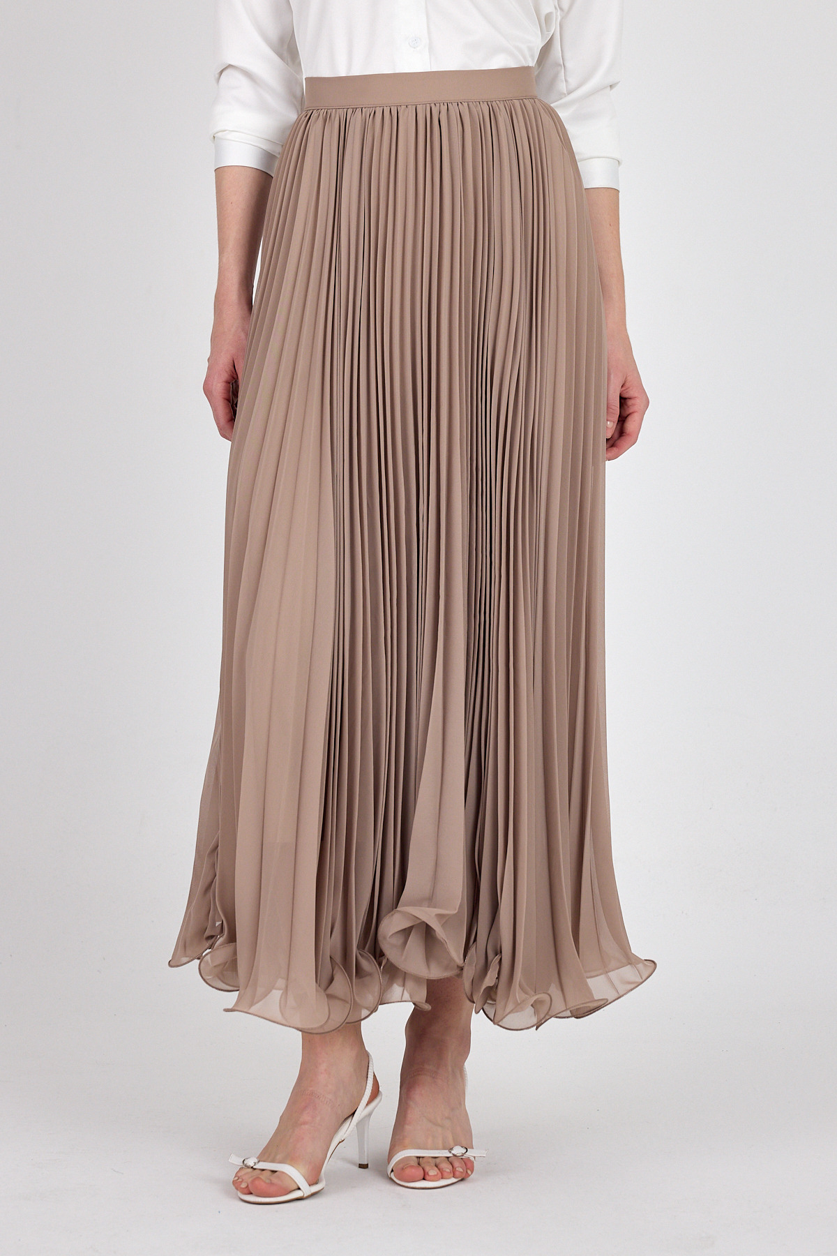 Bej Şifon Piliseli Yüksek Bel Maxi Etek 1003