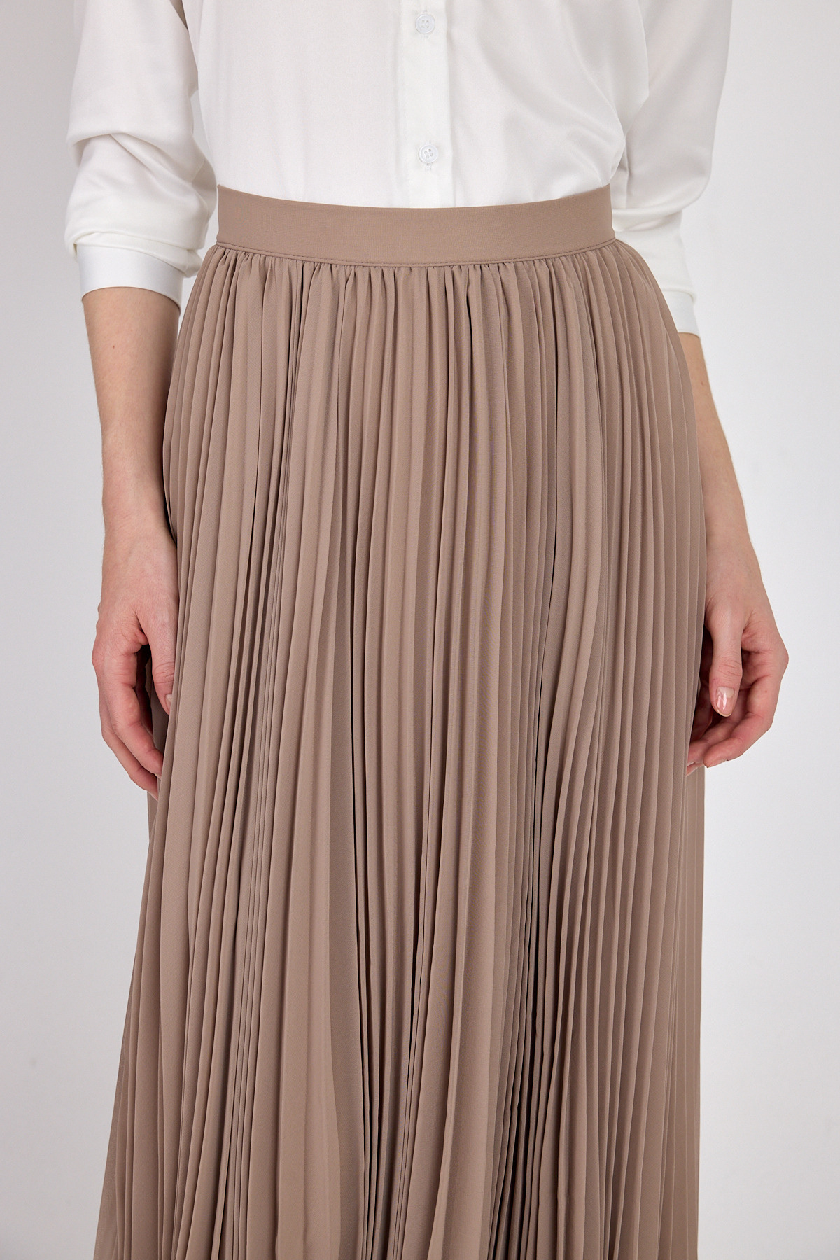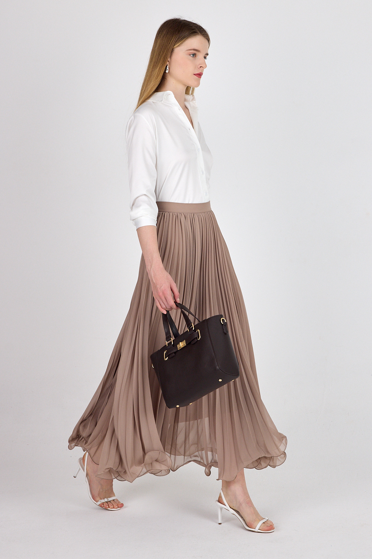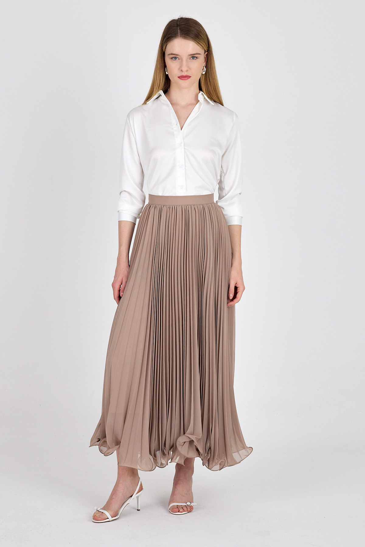 Bej Şifon Piliseli Yüksek Bel Maxi Etek 1003