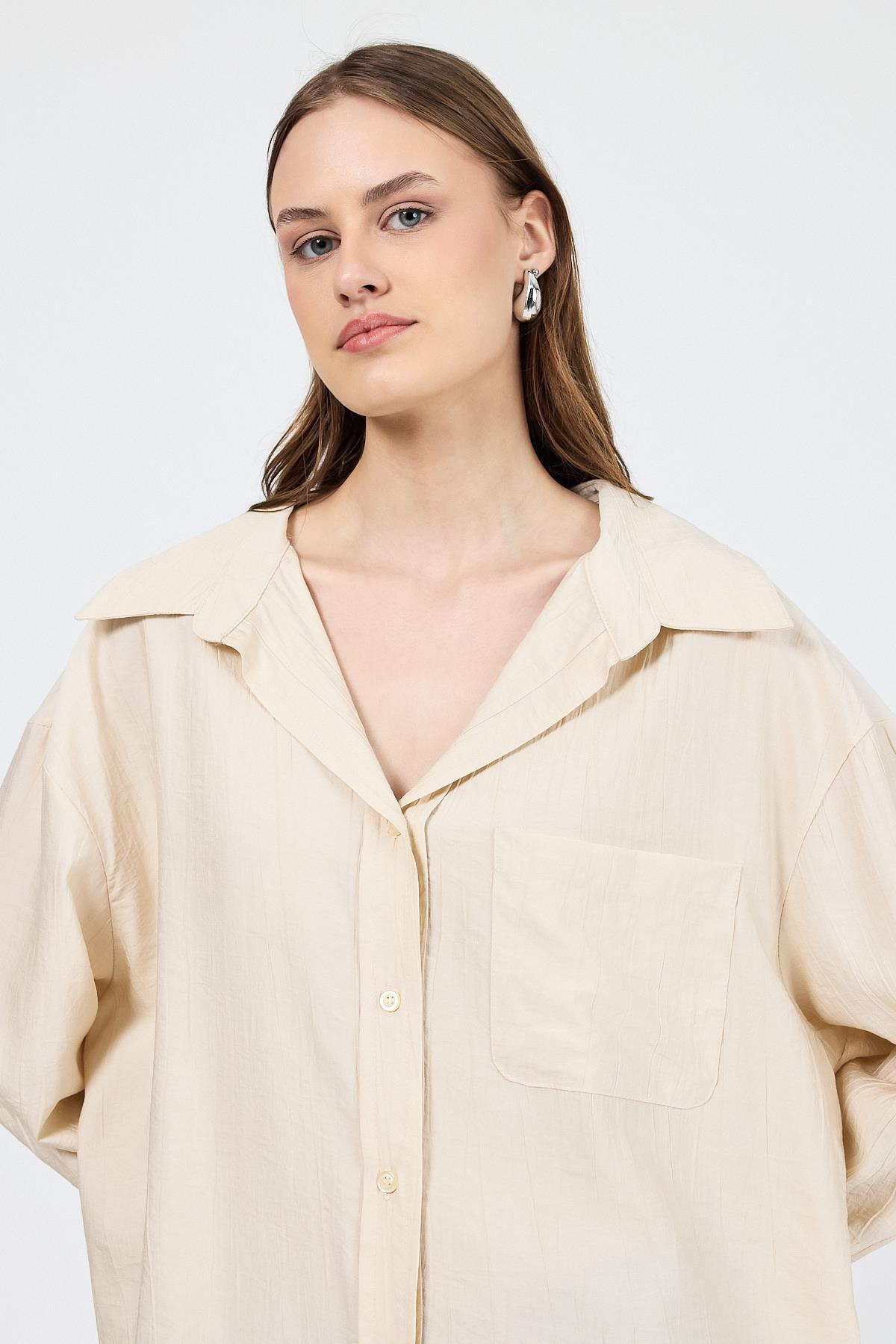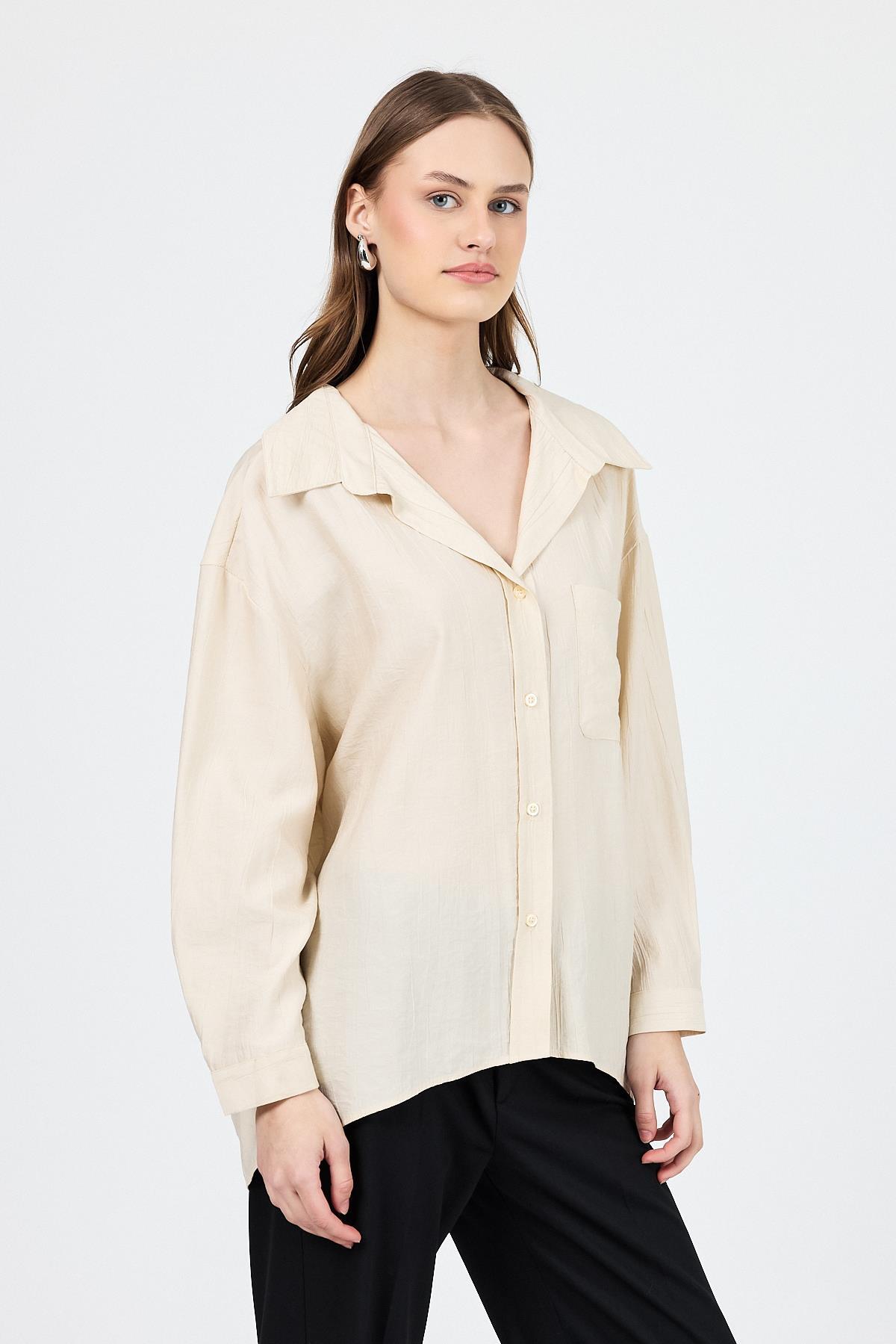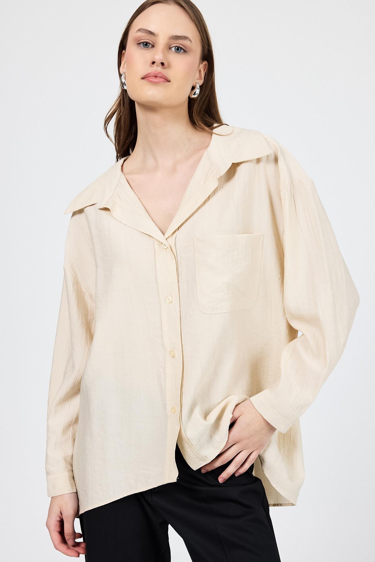 Bej Tek Cep Detaylı Dokuma Gömlek 4641A