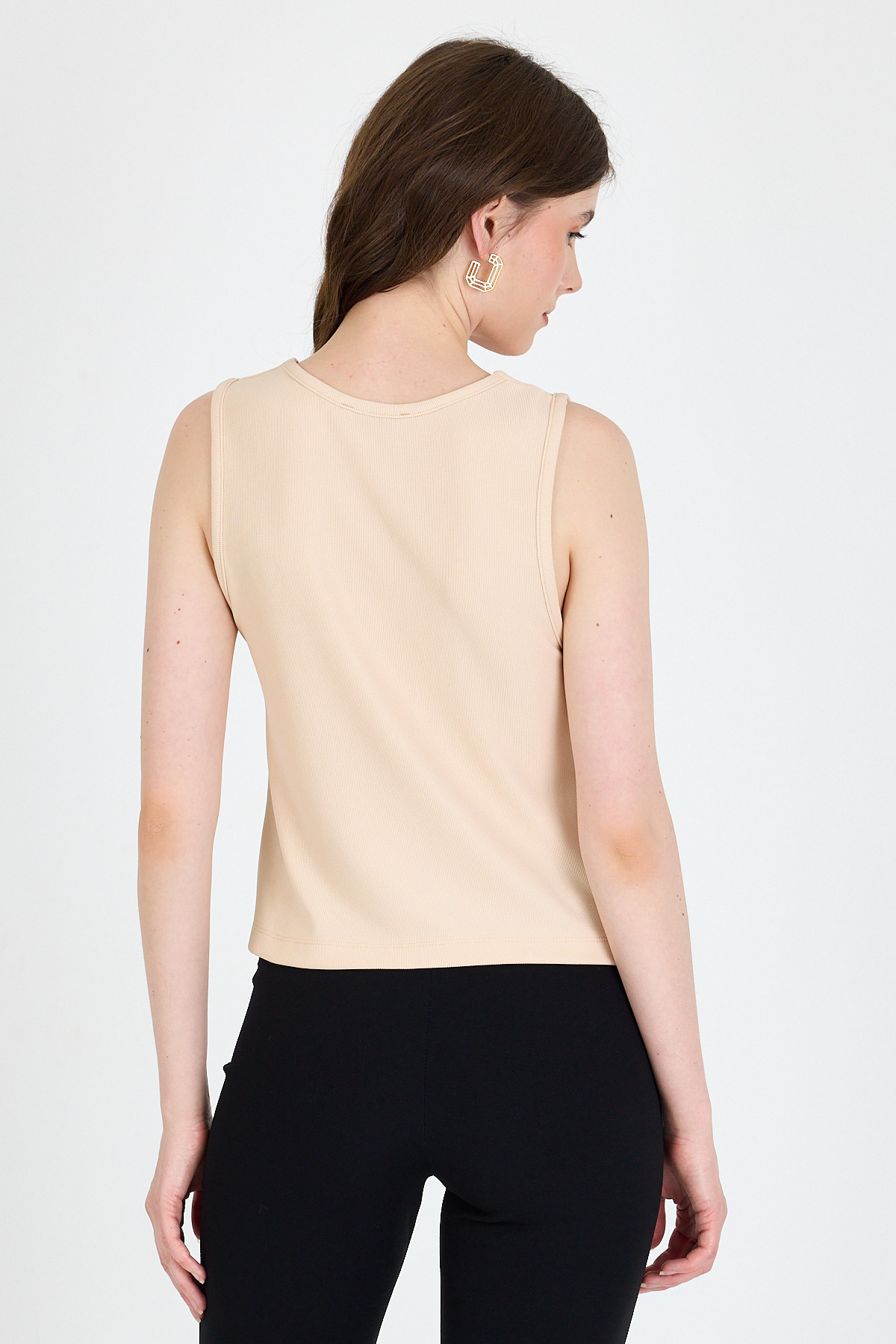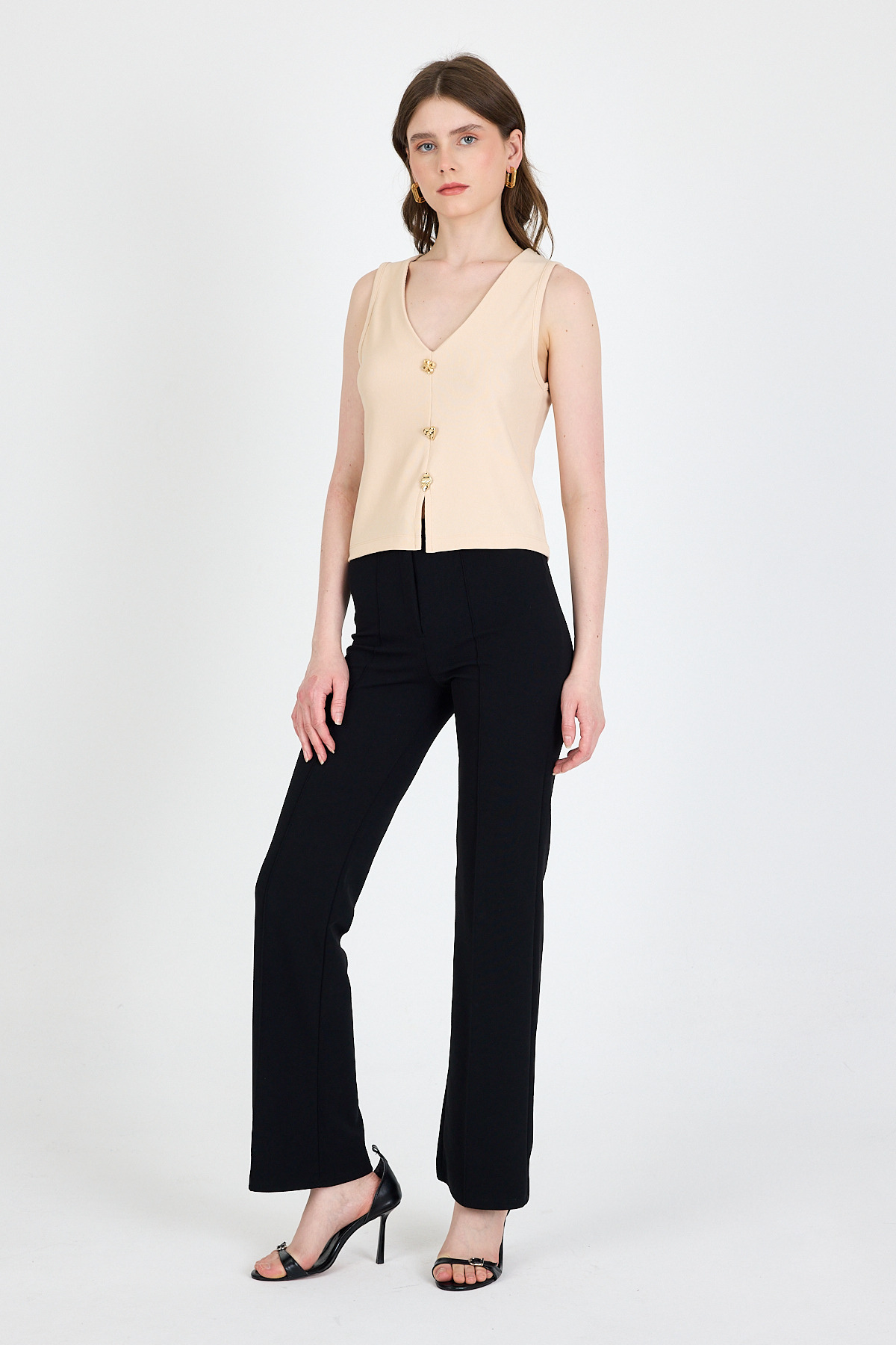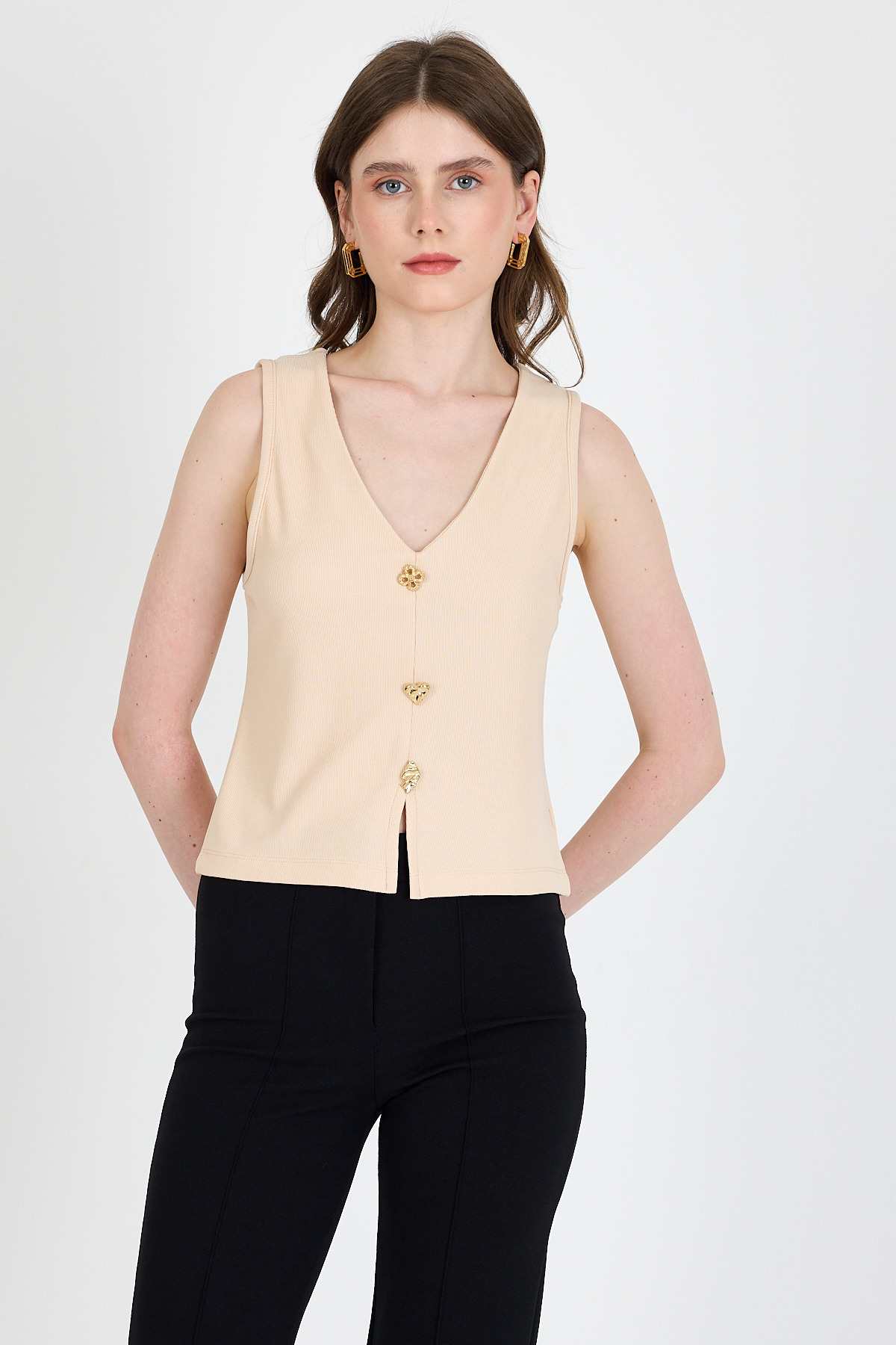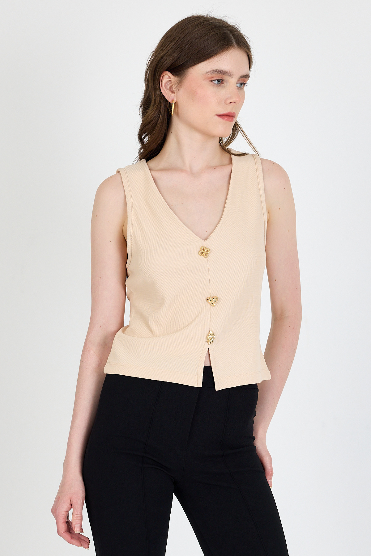 Bej V Yaka Düğmeli Kolsuz Bluz 019
