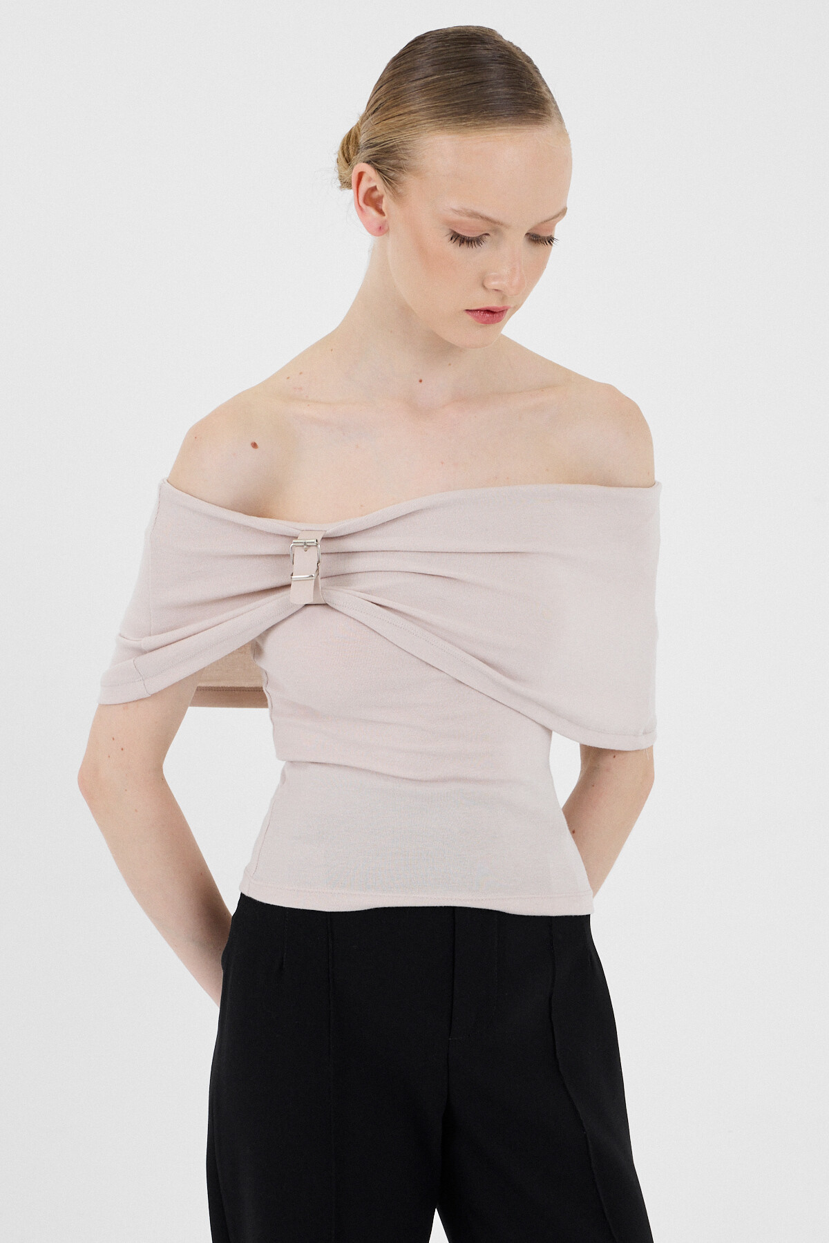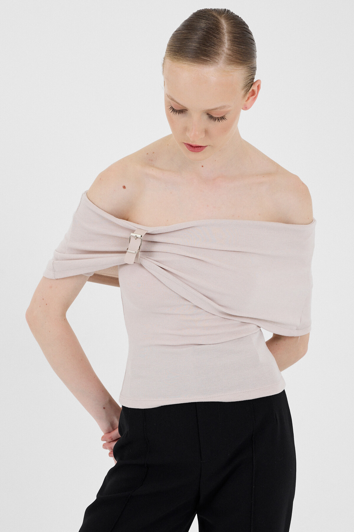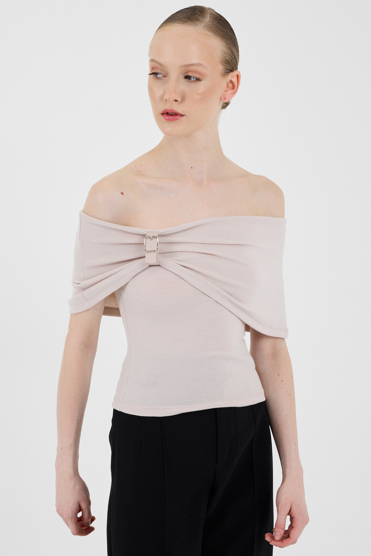 Bej Viskoz/Yumuşak Kumaş Madonna Yaka Toka Detaylı Bluz 1475