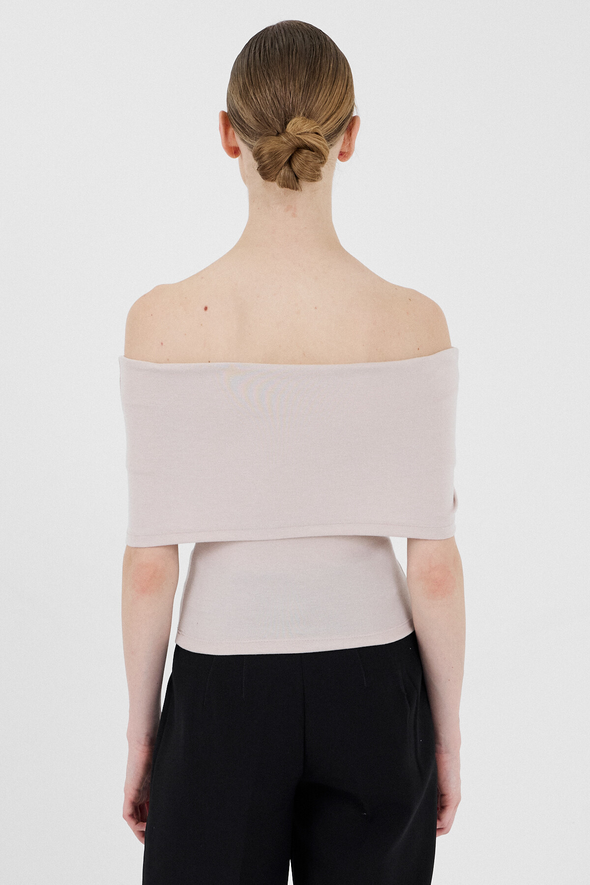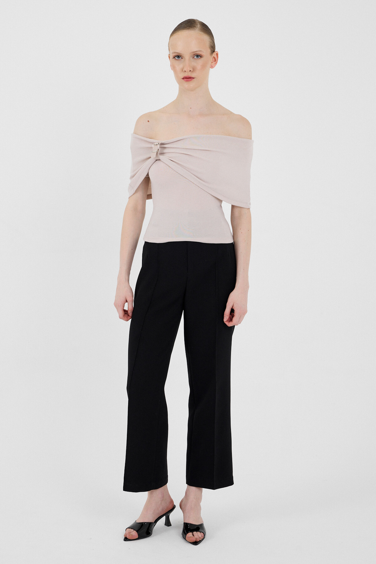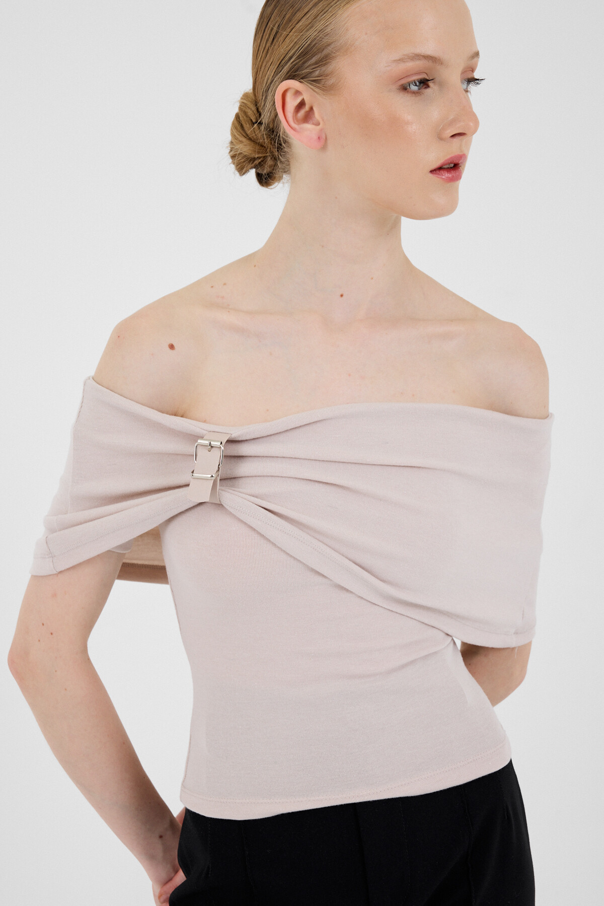 Bej Viskoz/Yumuşak Kumaş Madonna Yaka Toka Detaylı Bluz 1475