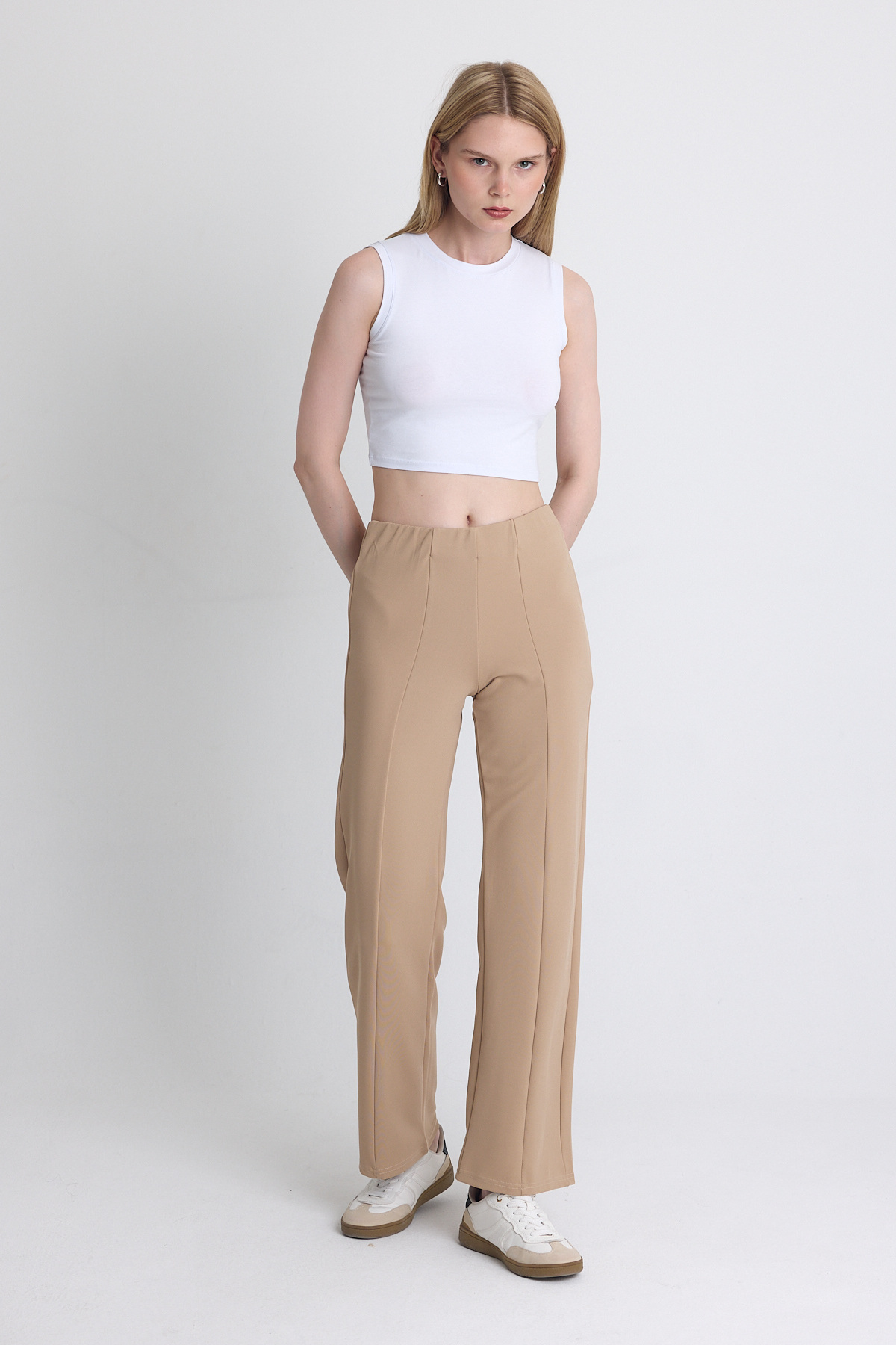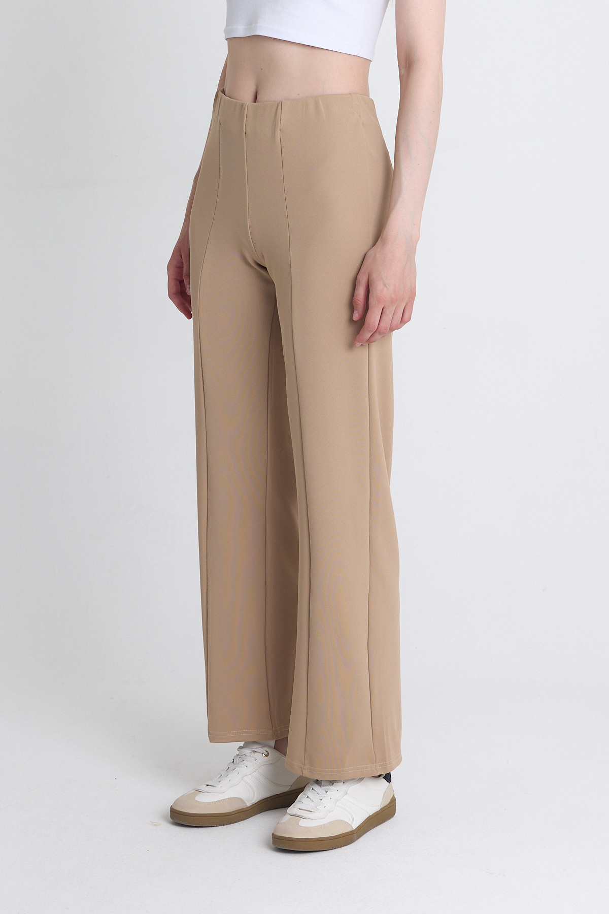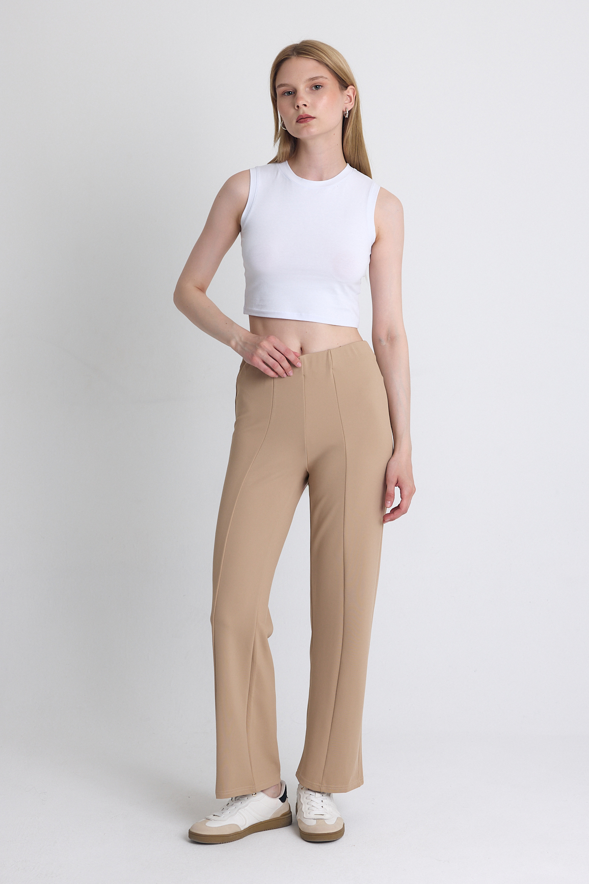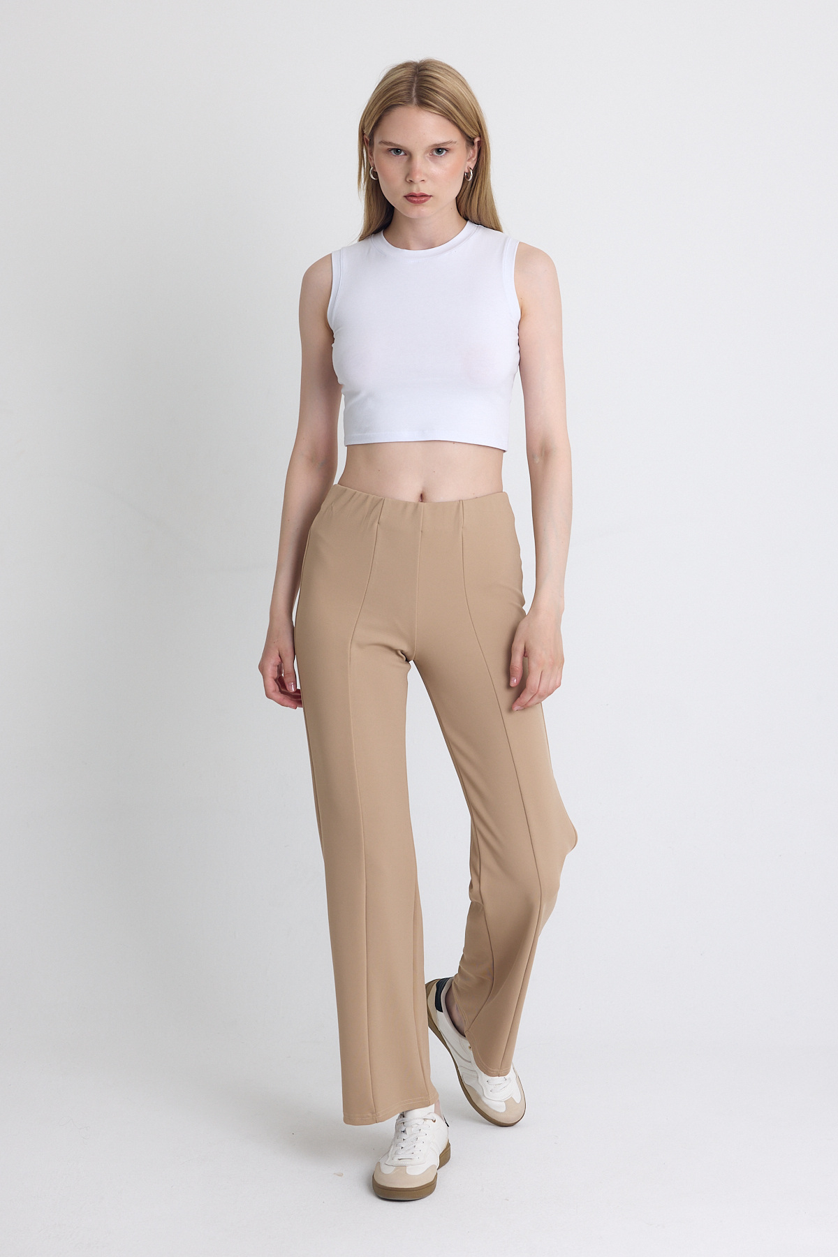 Bej Yüksek Bel Dikiş Detaylı Tayt Pantolon 1002