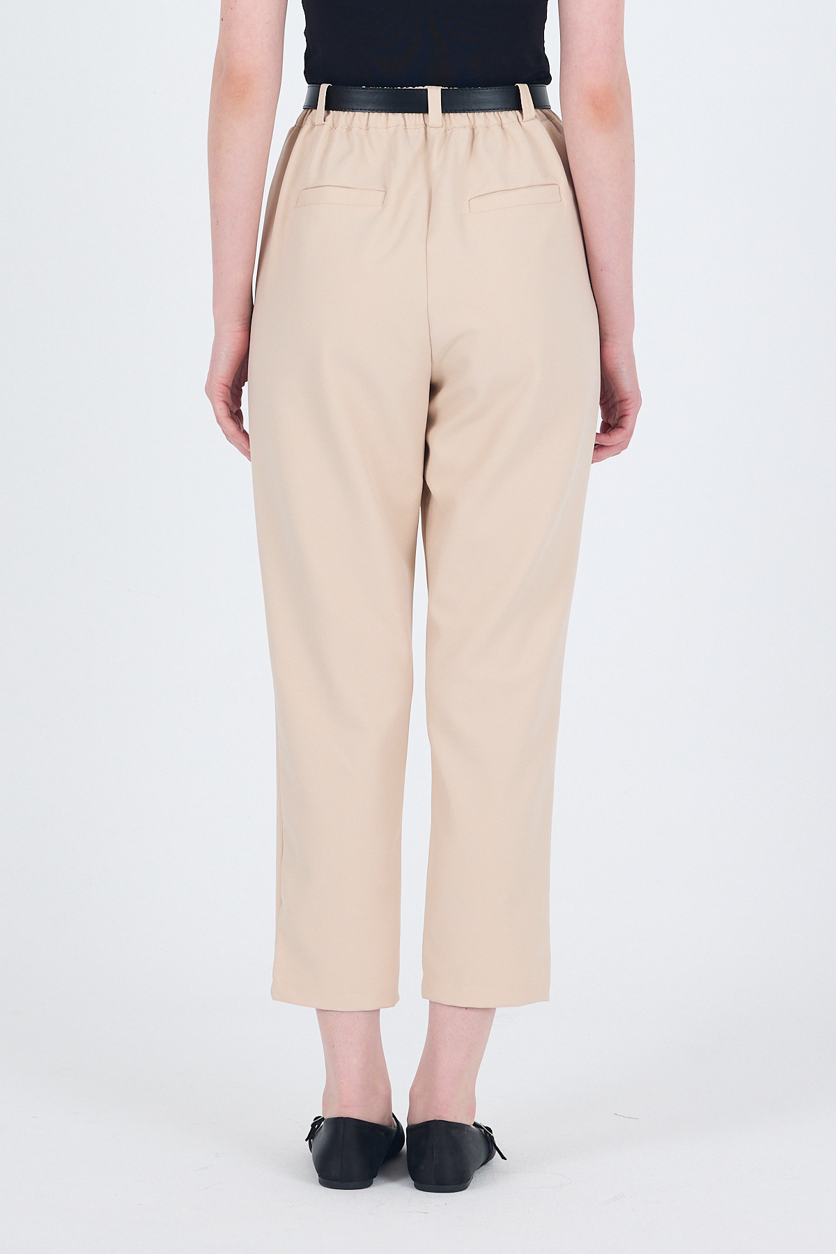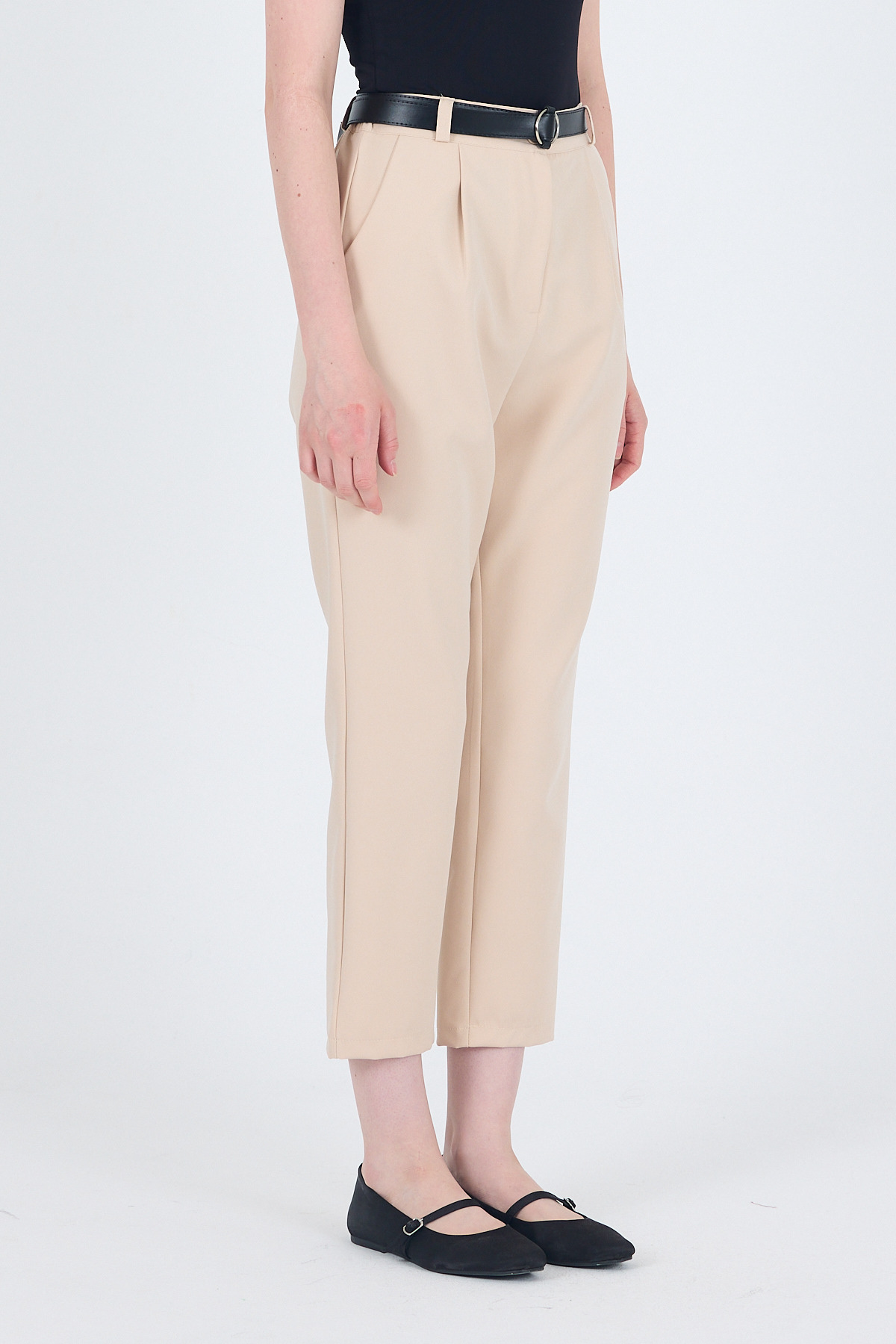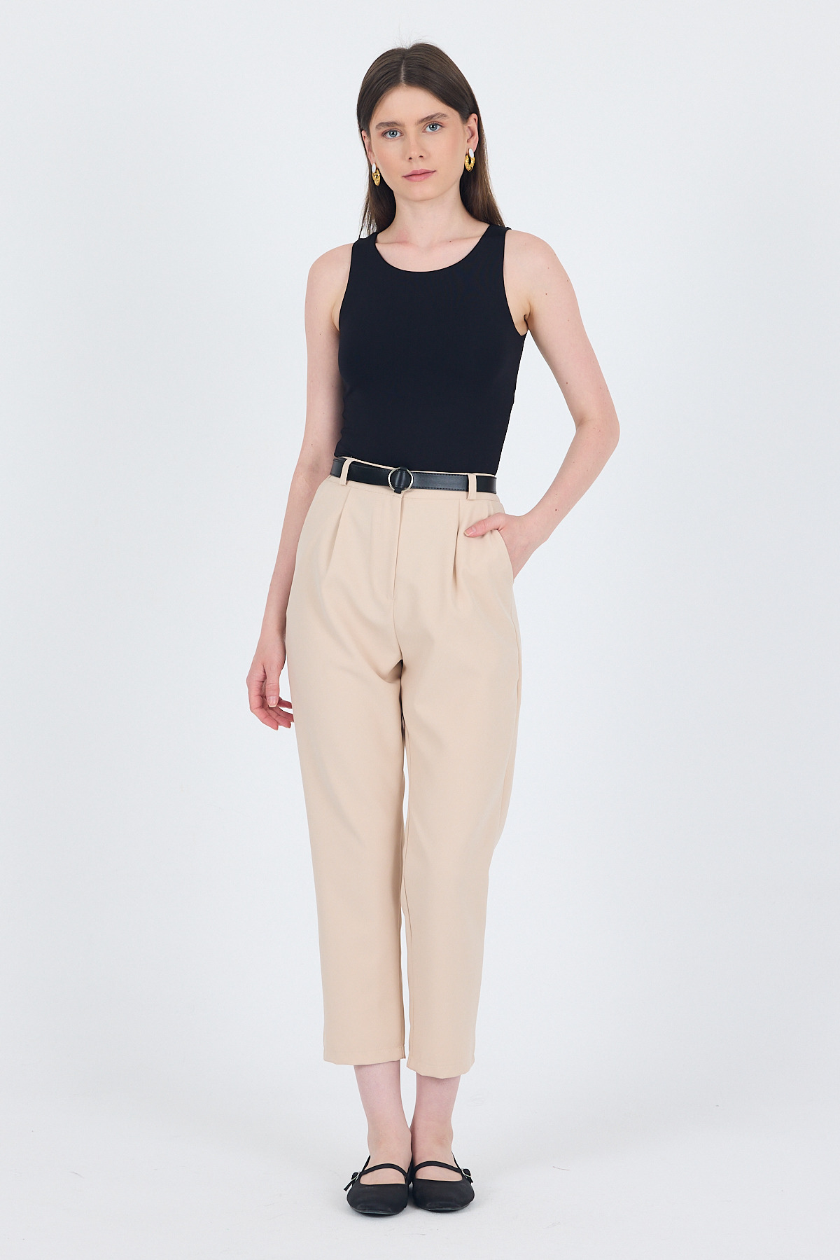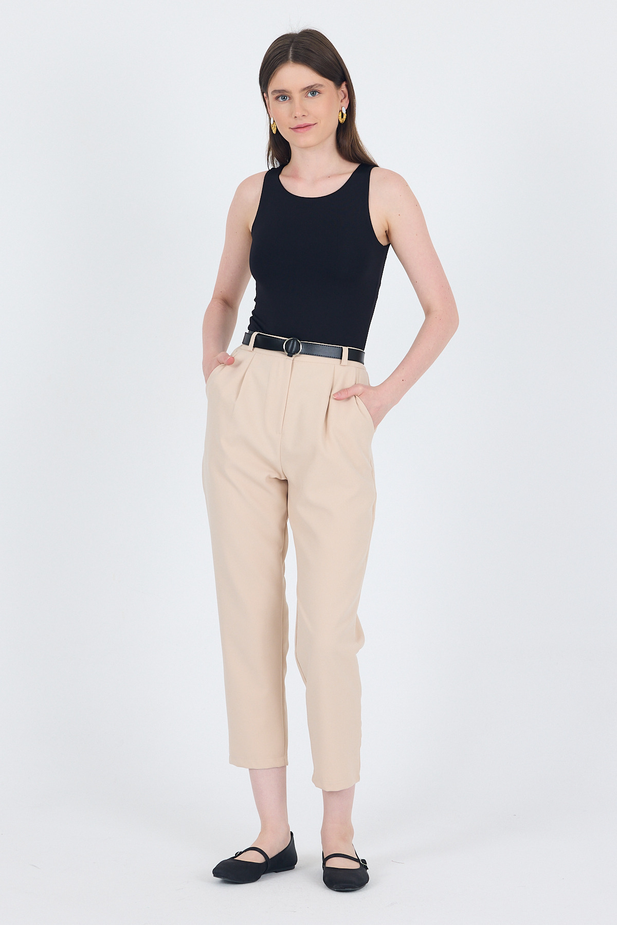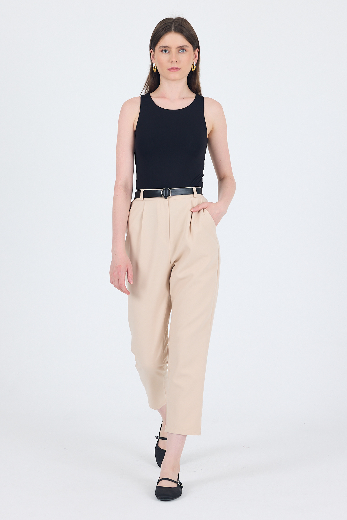 Bej Yüksek Bel Kemerli Havuç Kesim Pantolon 6418A
