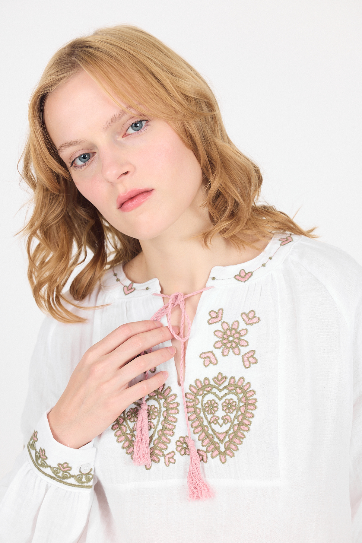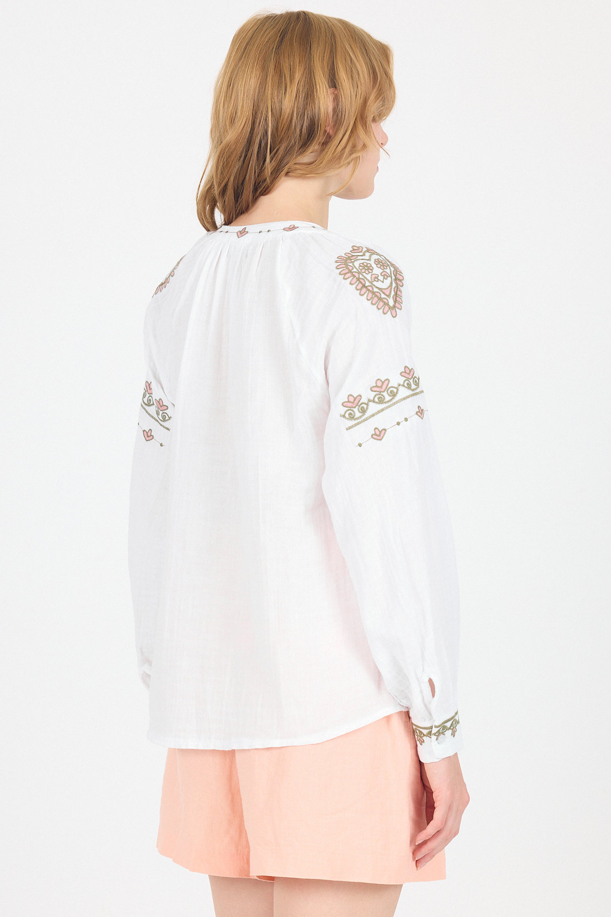 Beyaz %100 Pamuk Etnik Nakış Detaylı Müslin Gömlek 6323