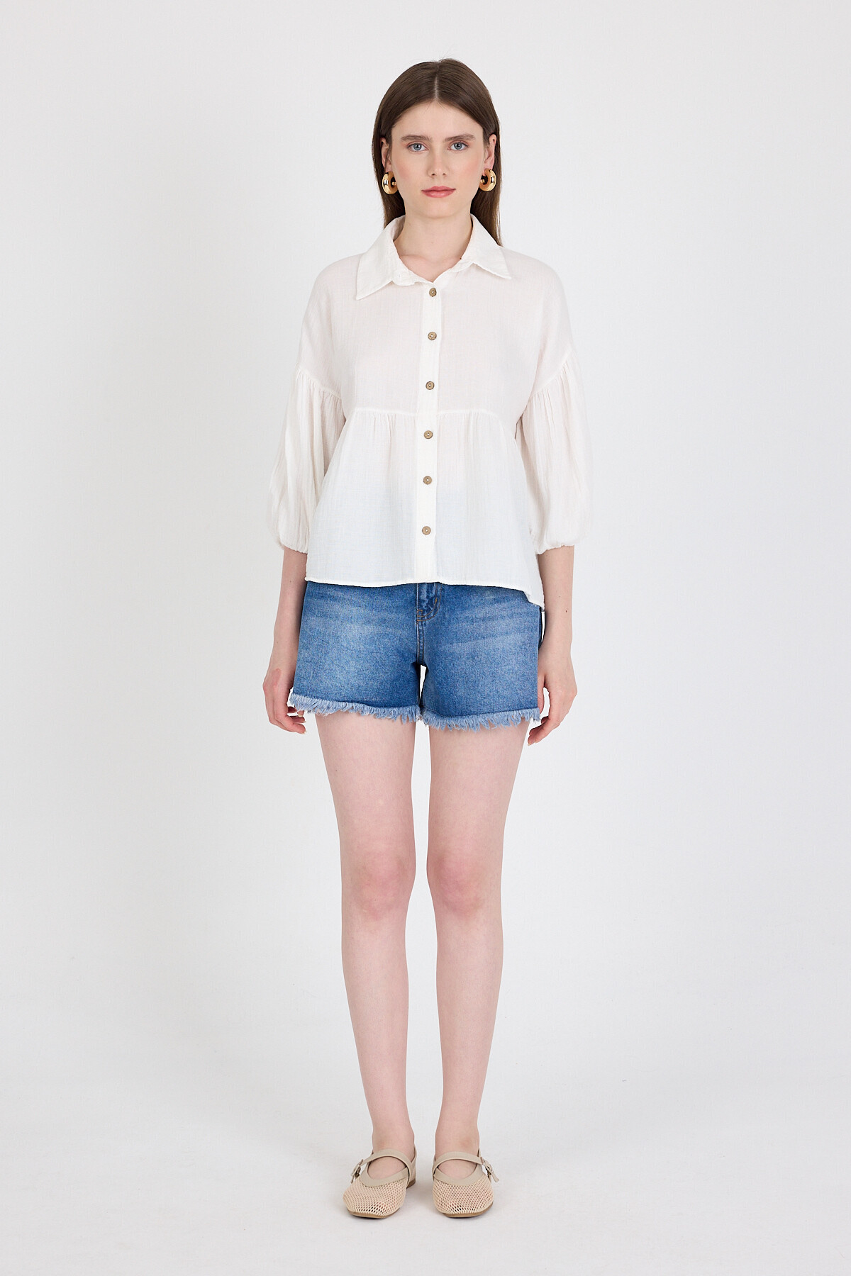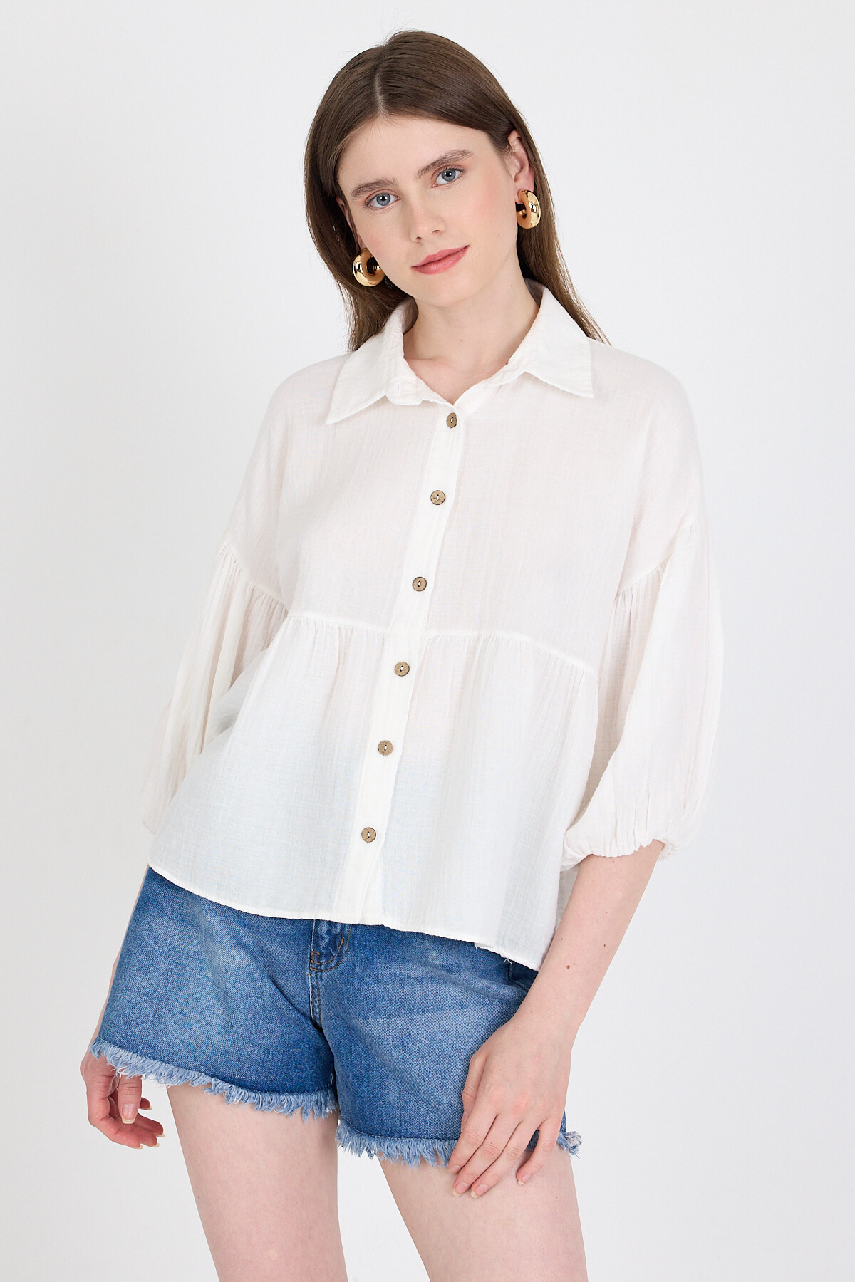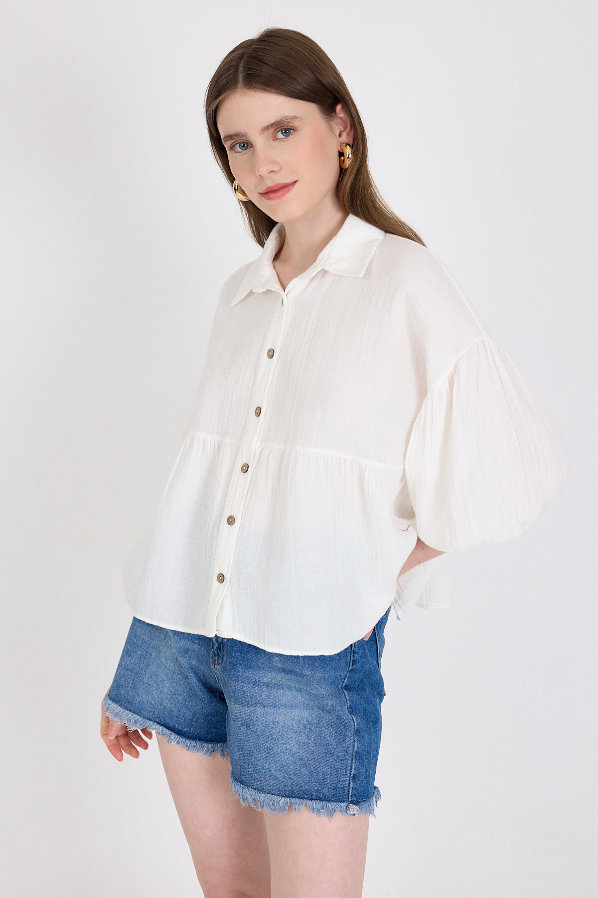 Beyaz %100 Pamuk Keten Görünümlü Düğmeli Gömlek 4783A