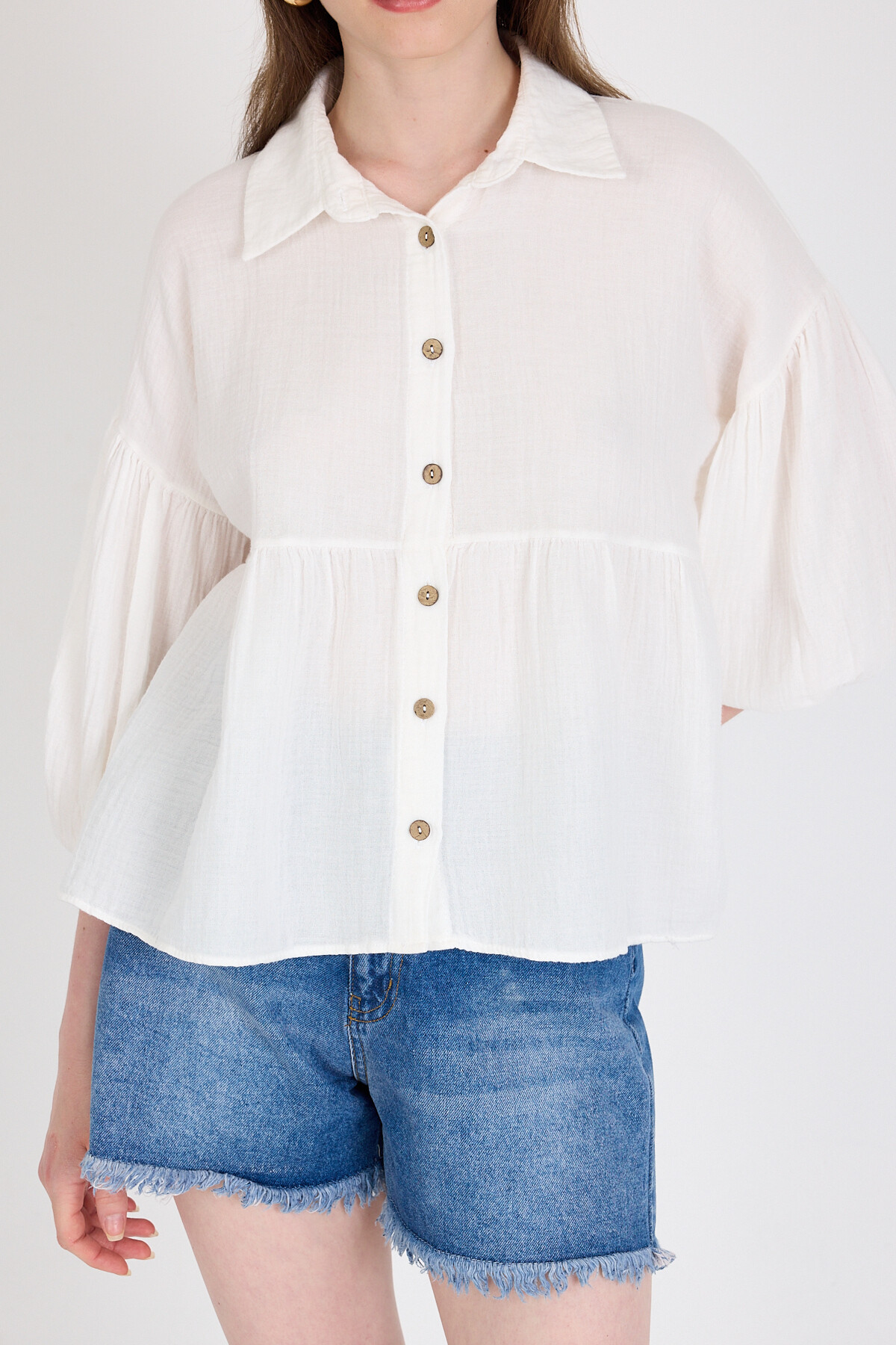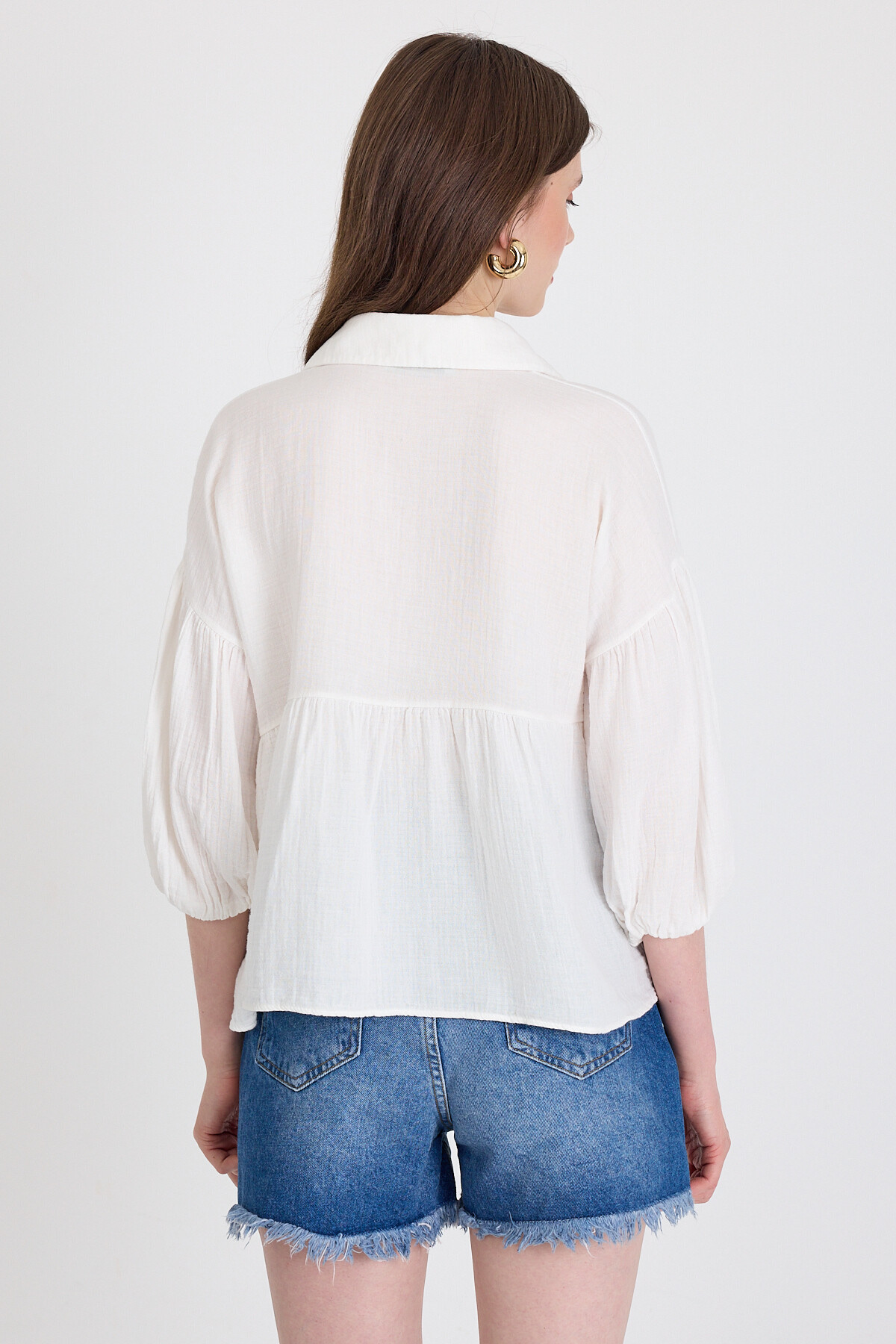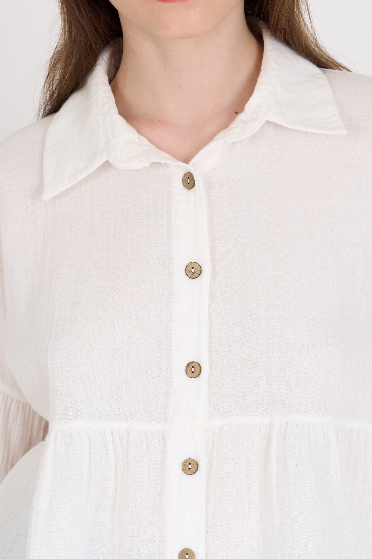 Beyaz %100 Pamuk Keten Görünümlü Düğmeli Gömlek 4783A