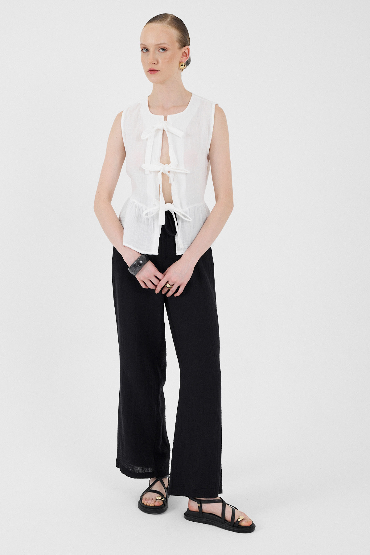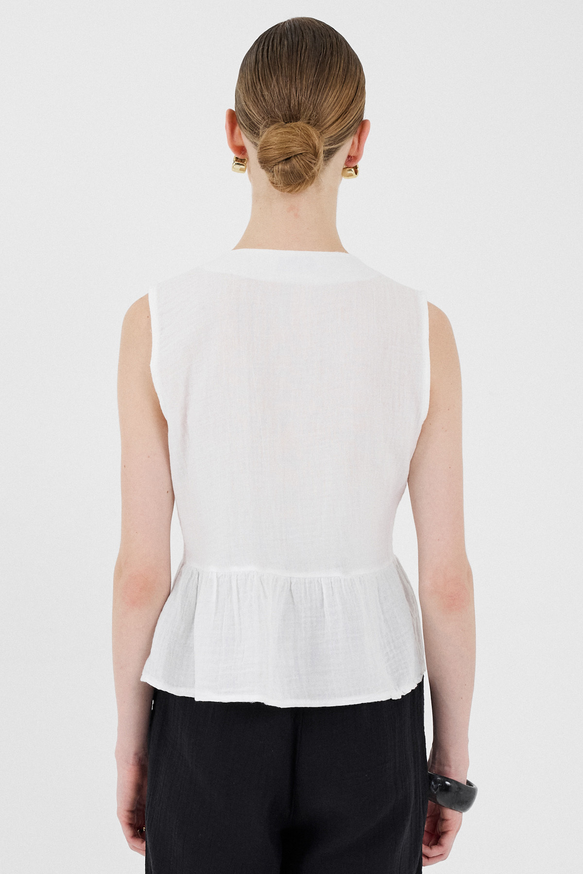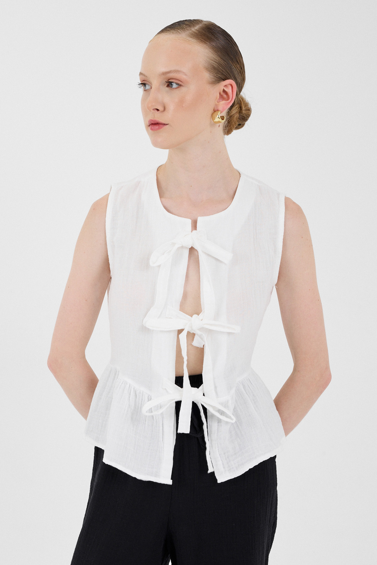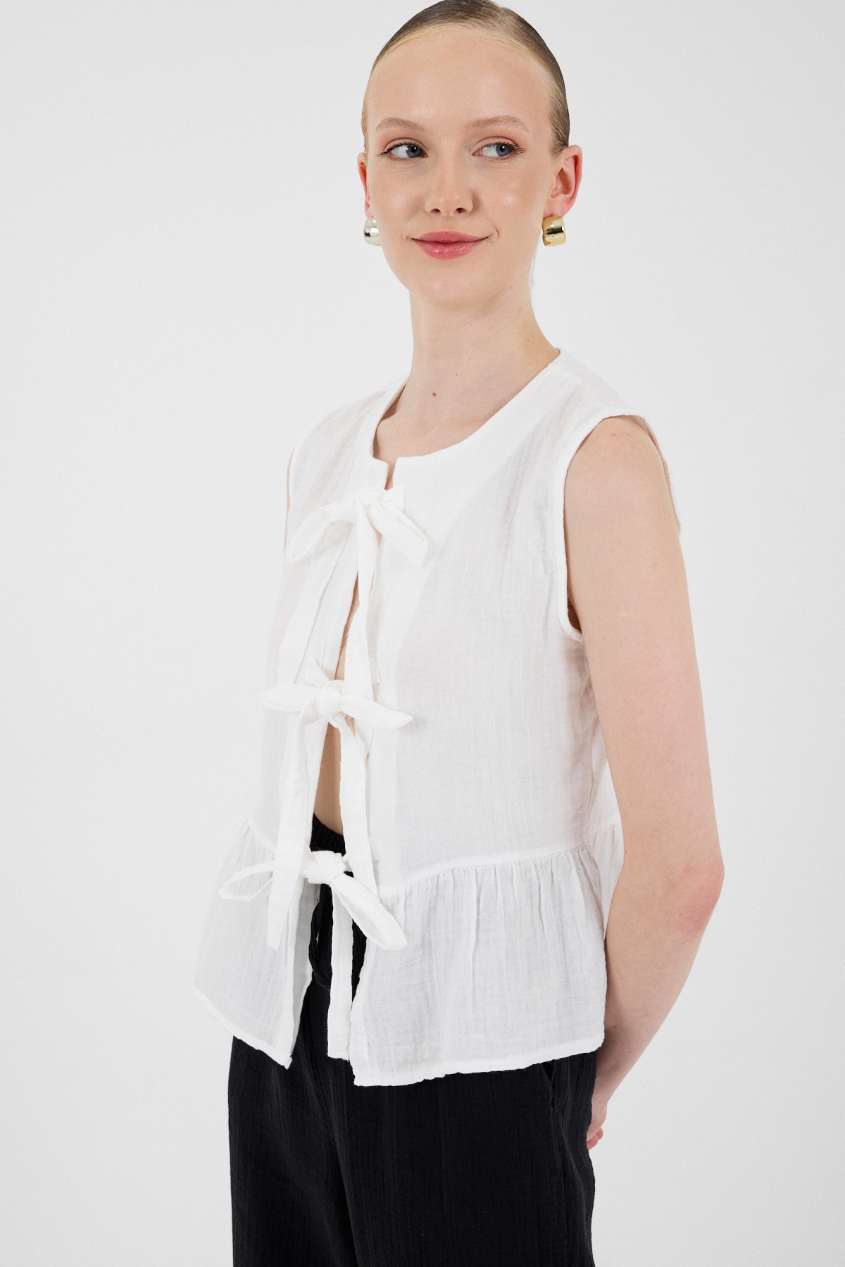 Beyaz %100 Pamuk Müslin Fırfır ve Bağlama Detaylı Bluz 4827A