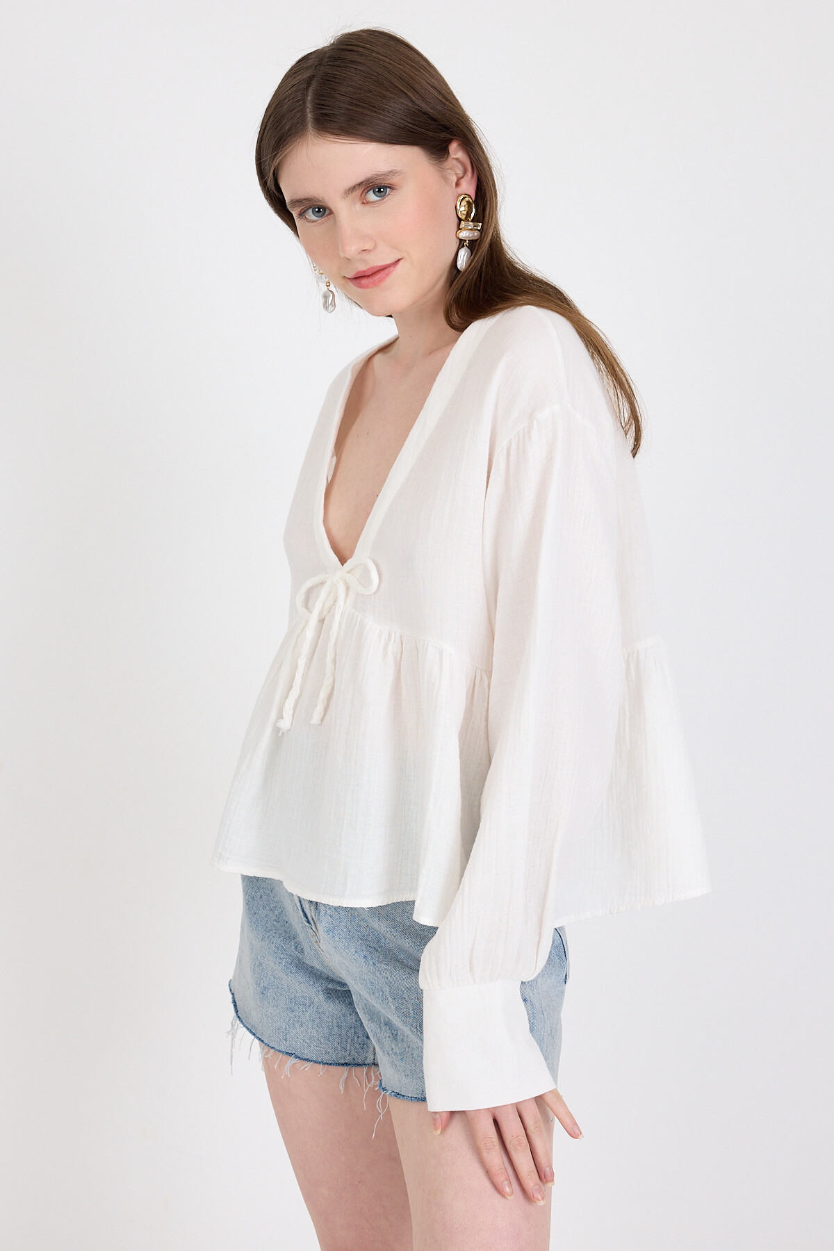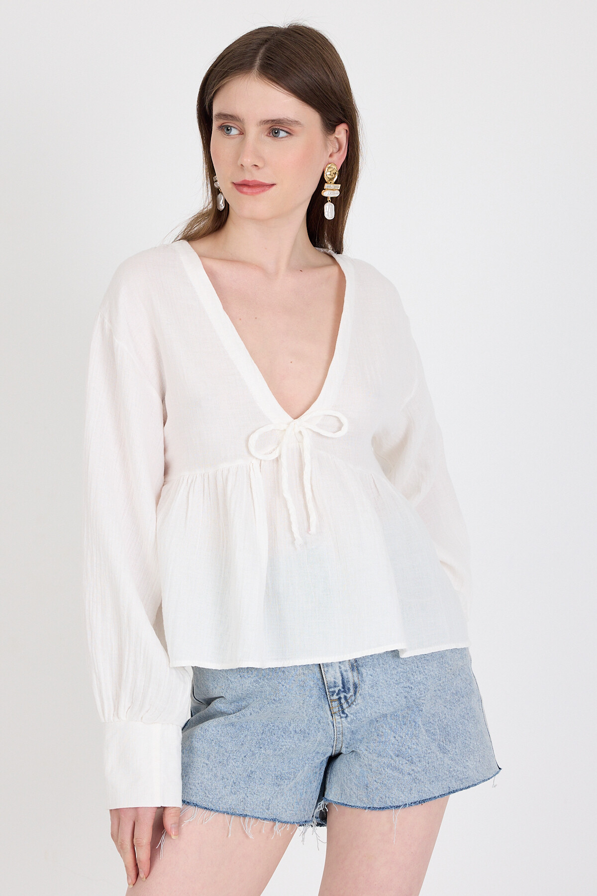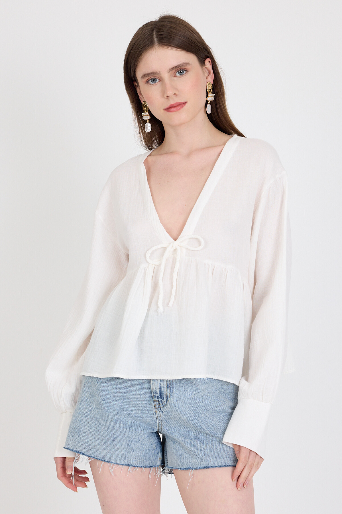 Beyaz %100 Pamuk V Yaka Ön Bağlama Detaylı Bluz 4784A