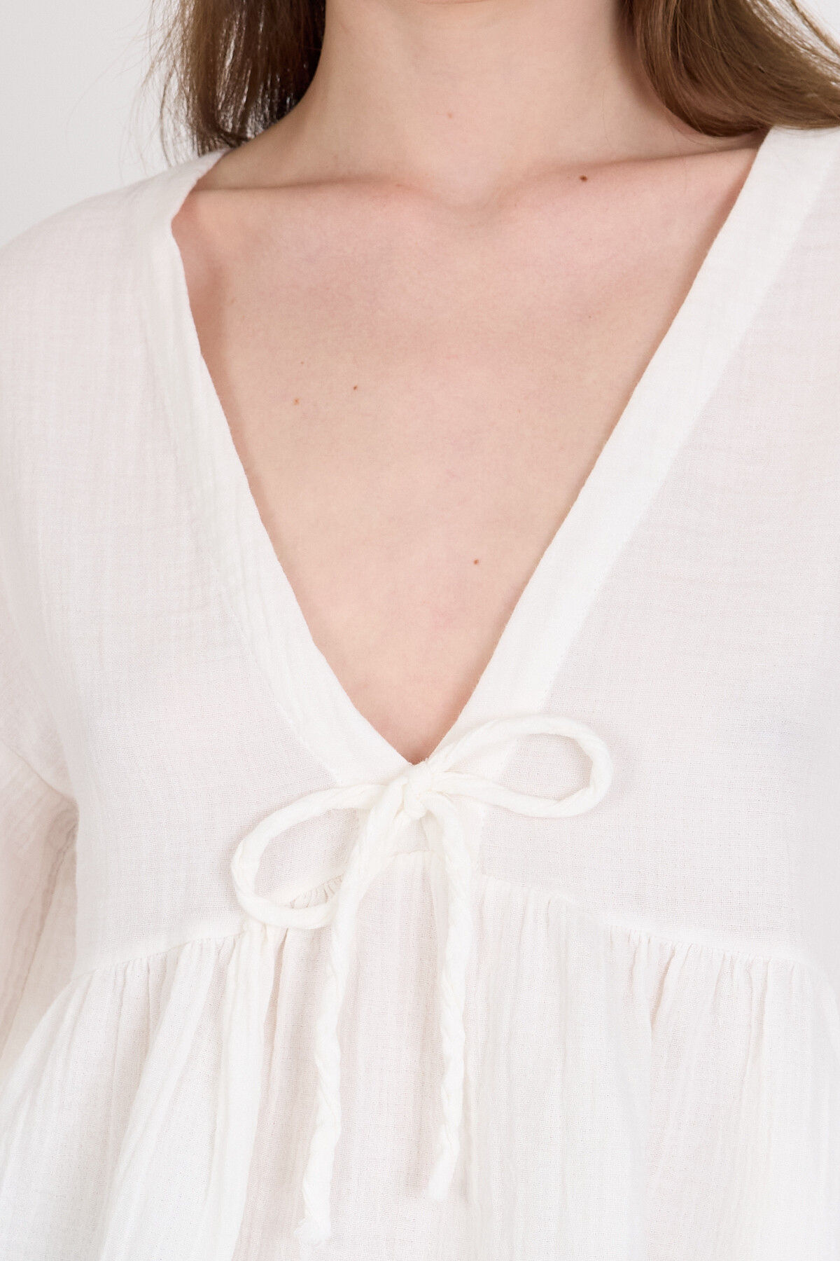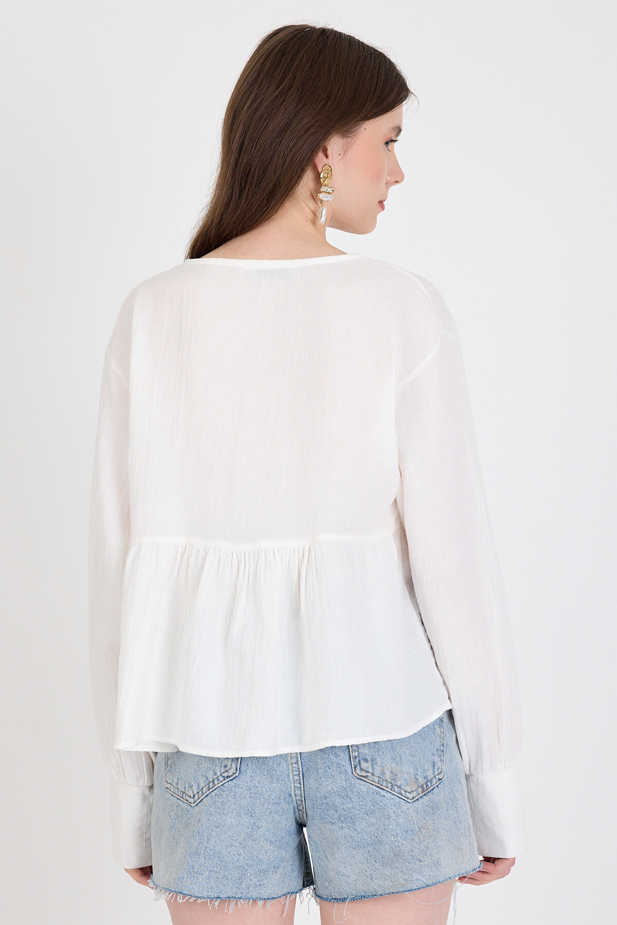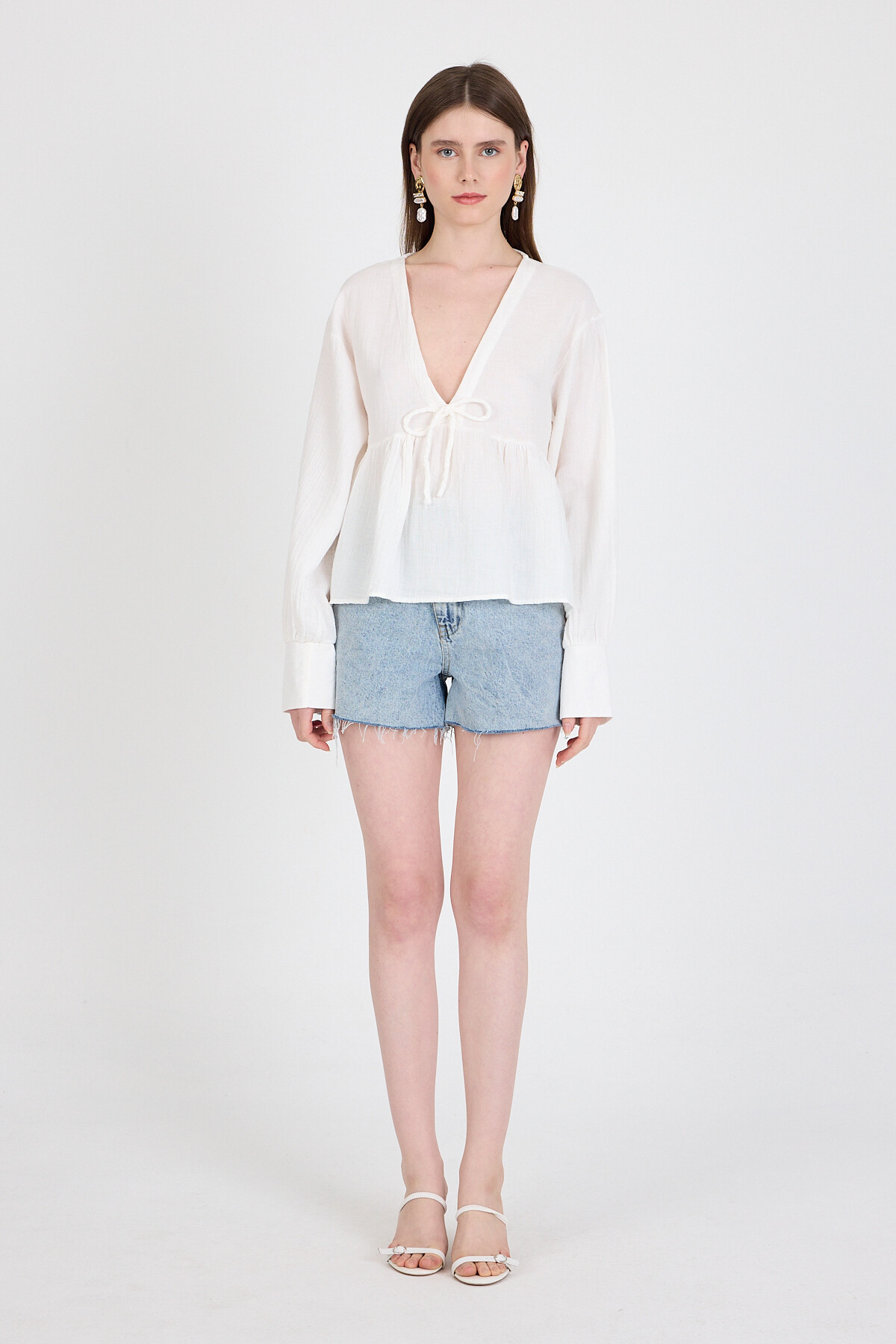 Beyaz %100 Pamuk V Yaka Ön Bağlama Detaylı Bluz 4784A