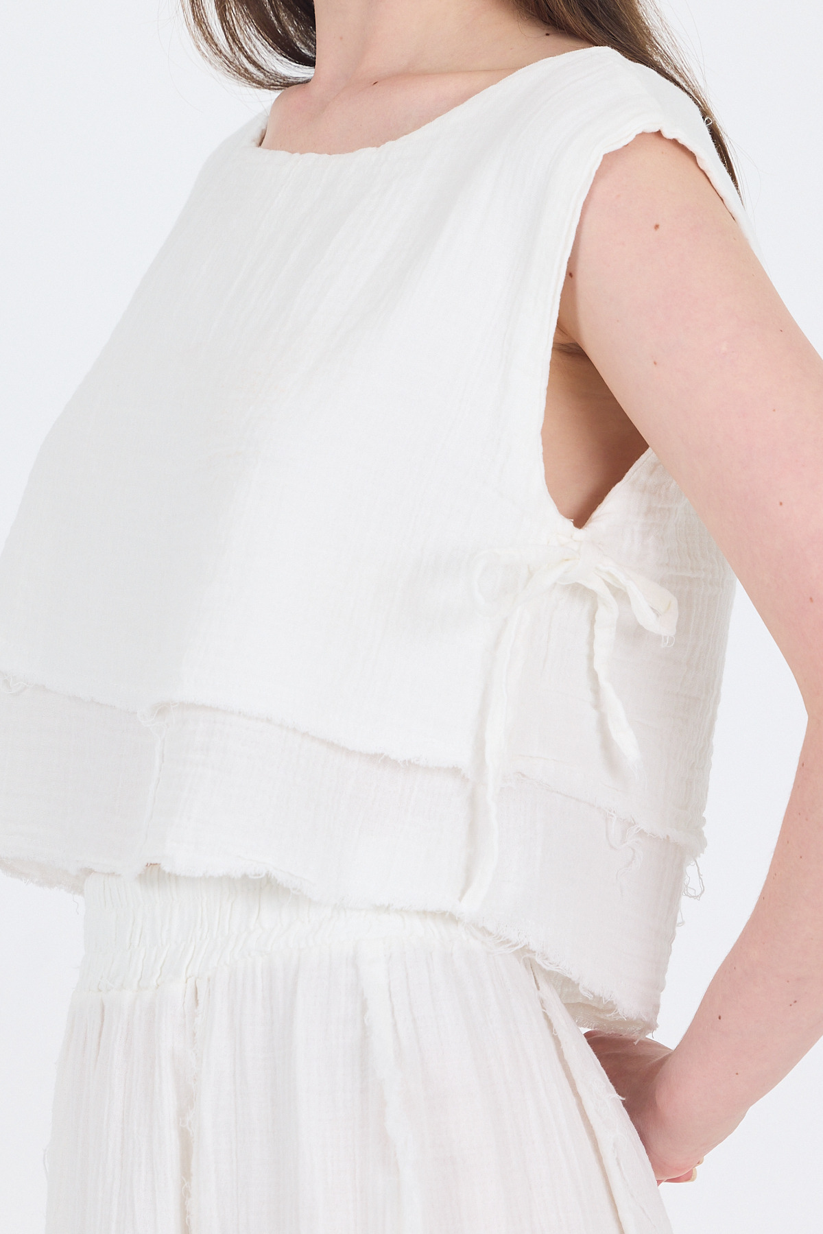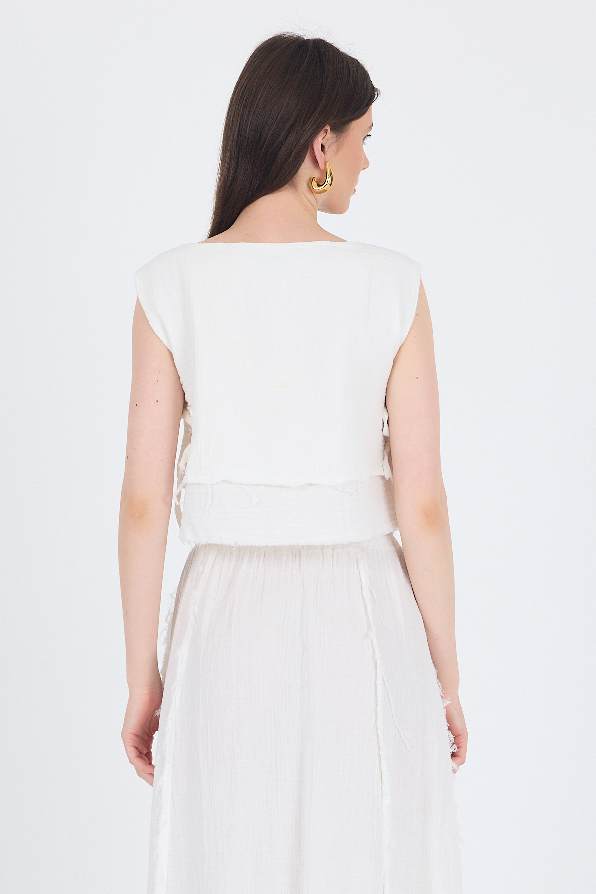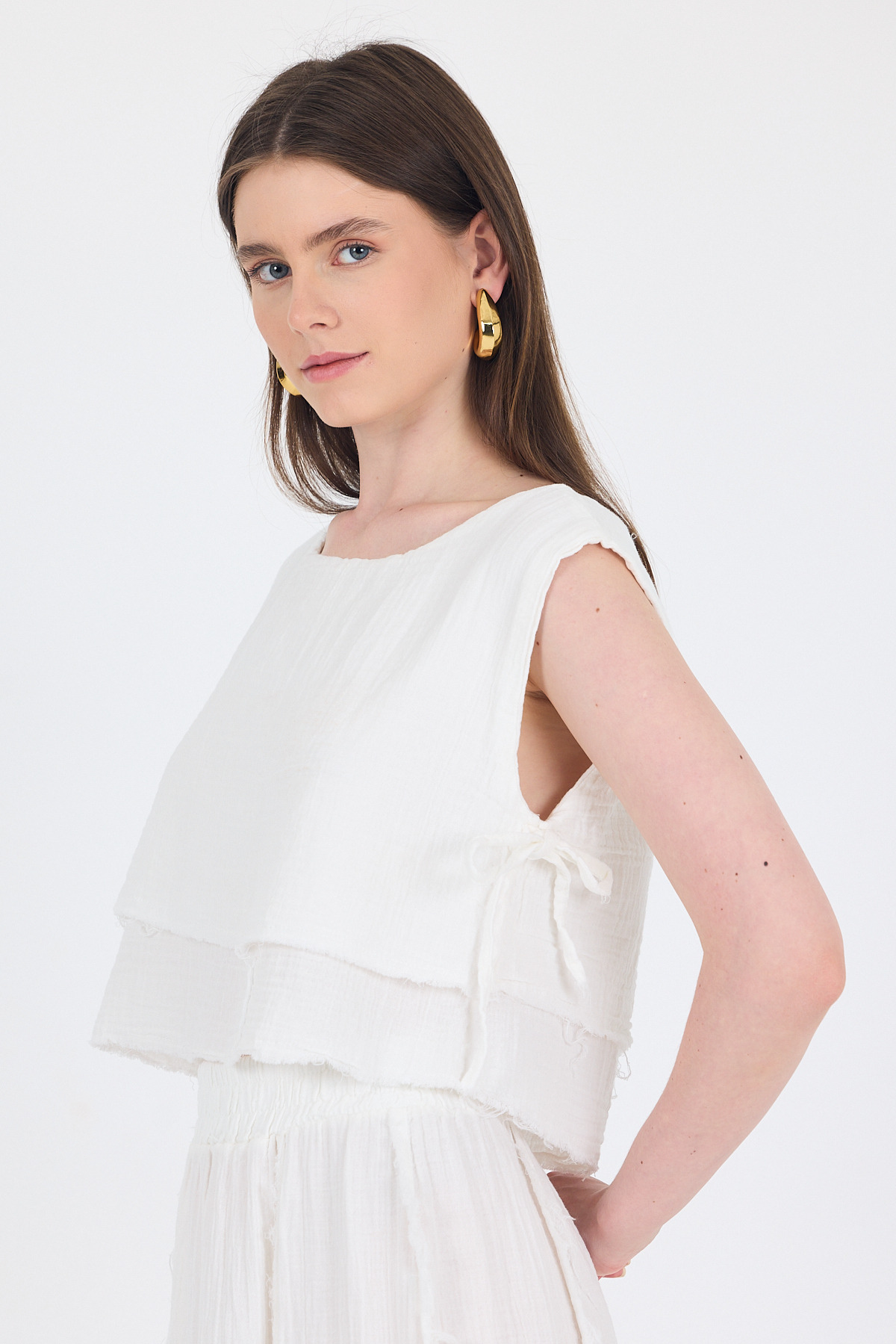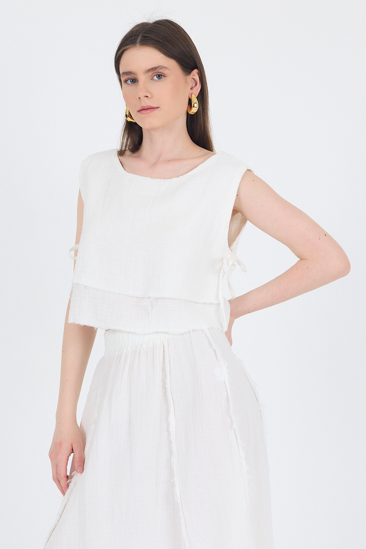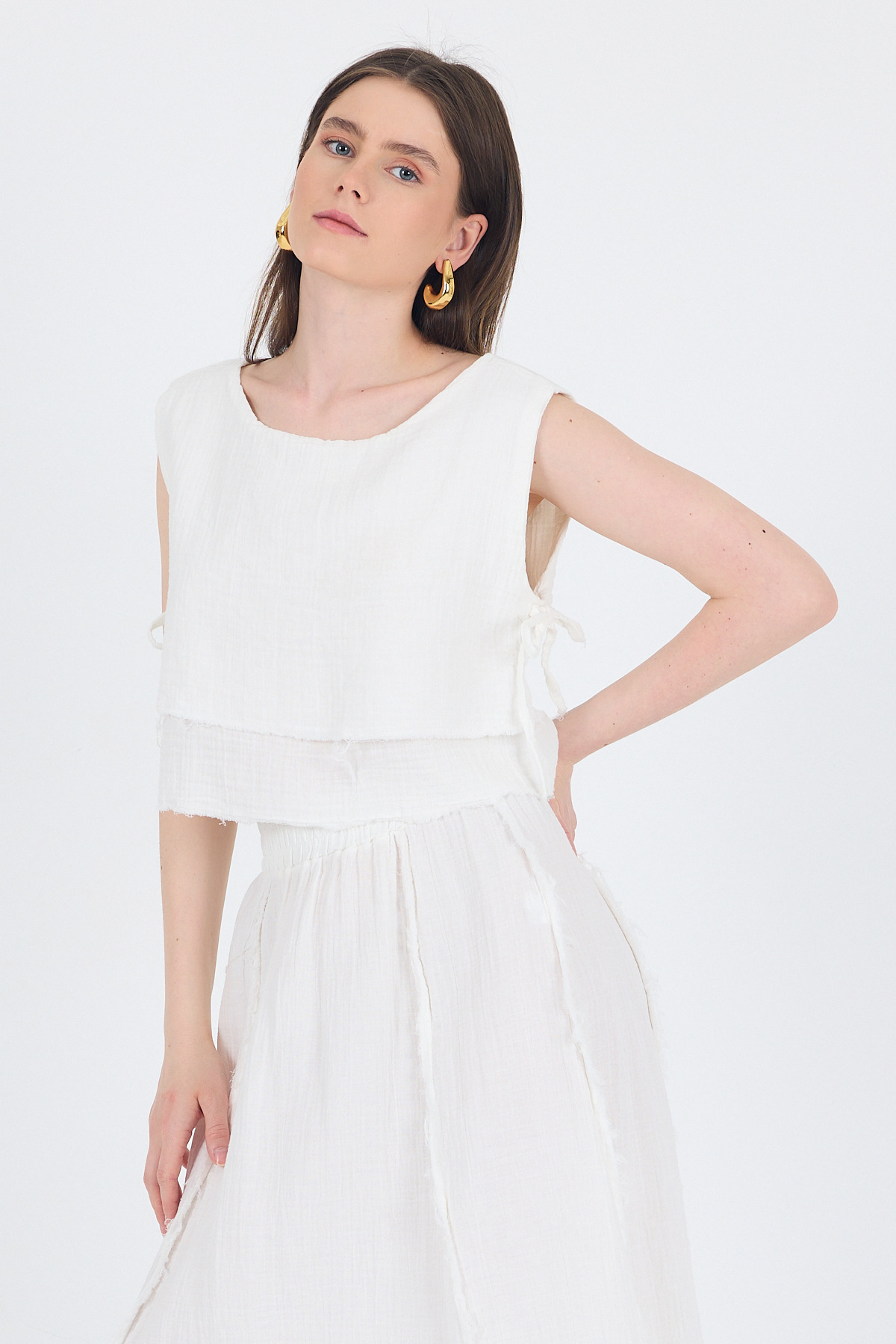 Beyaz %100 Pamuk Yan Bağlama Detaylı Müslin Bluz 7041