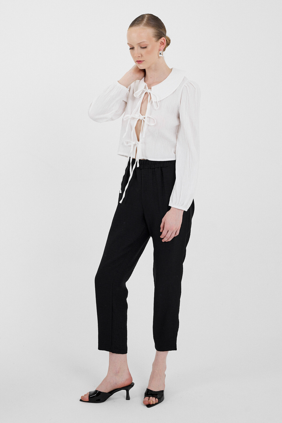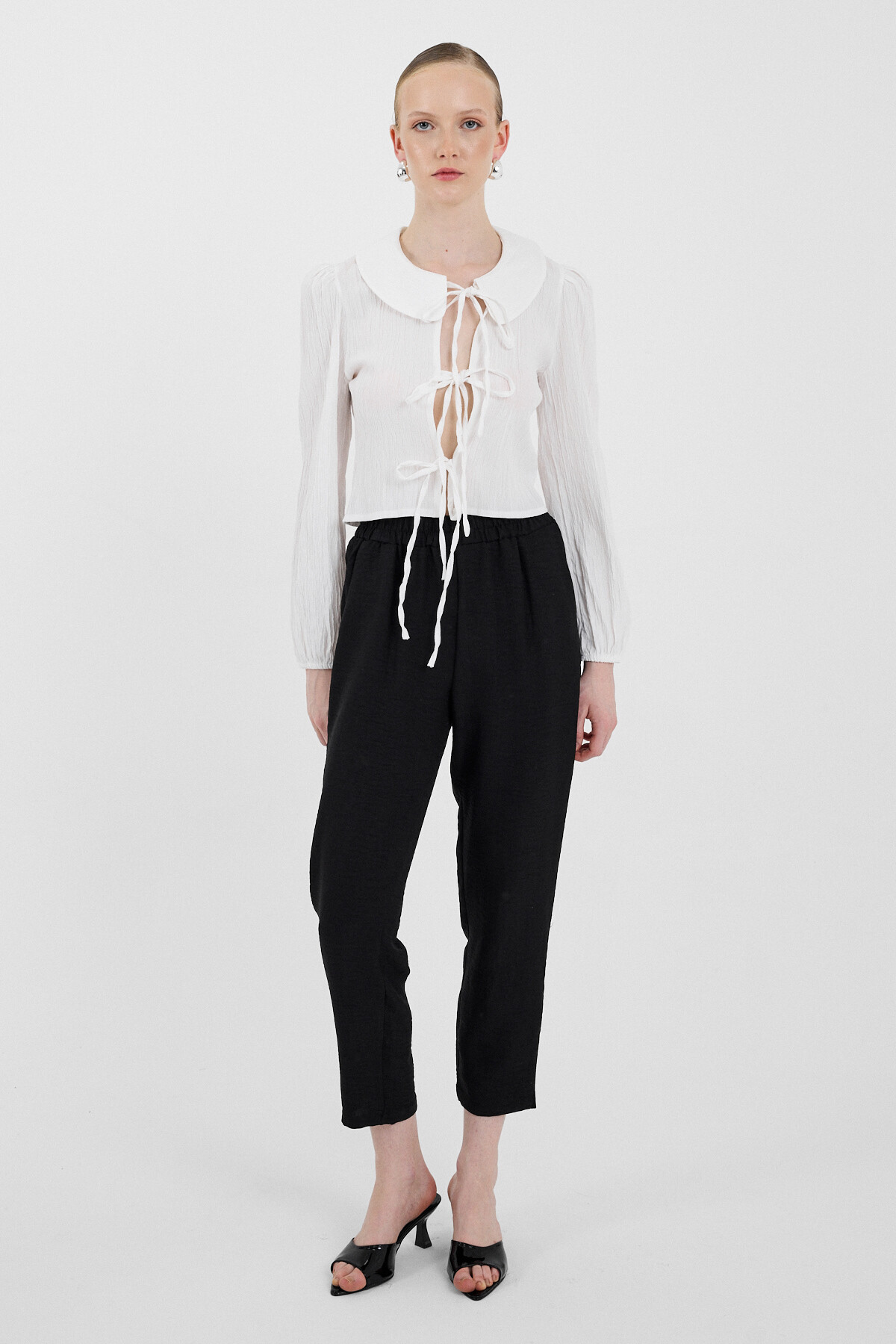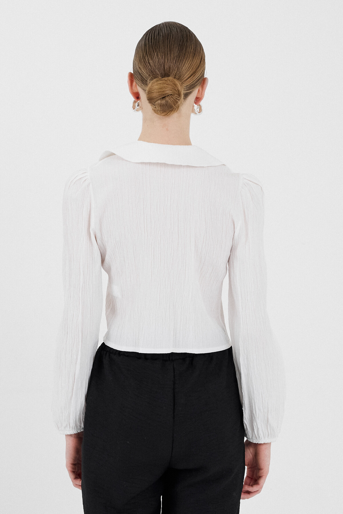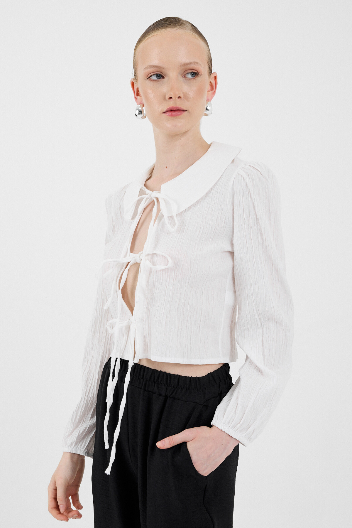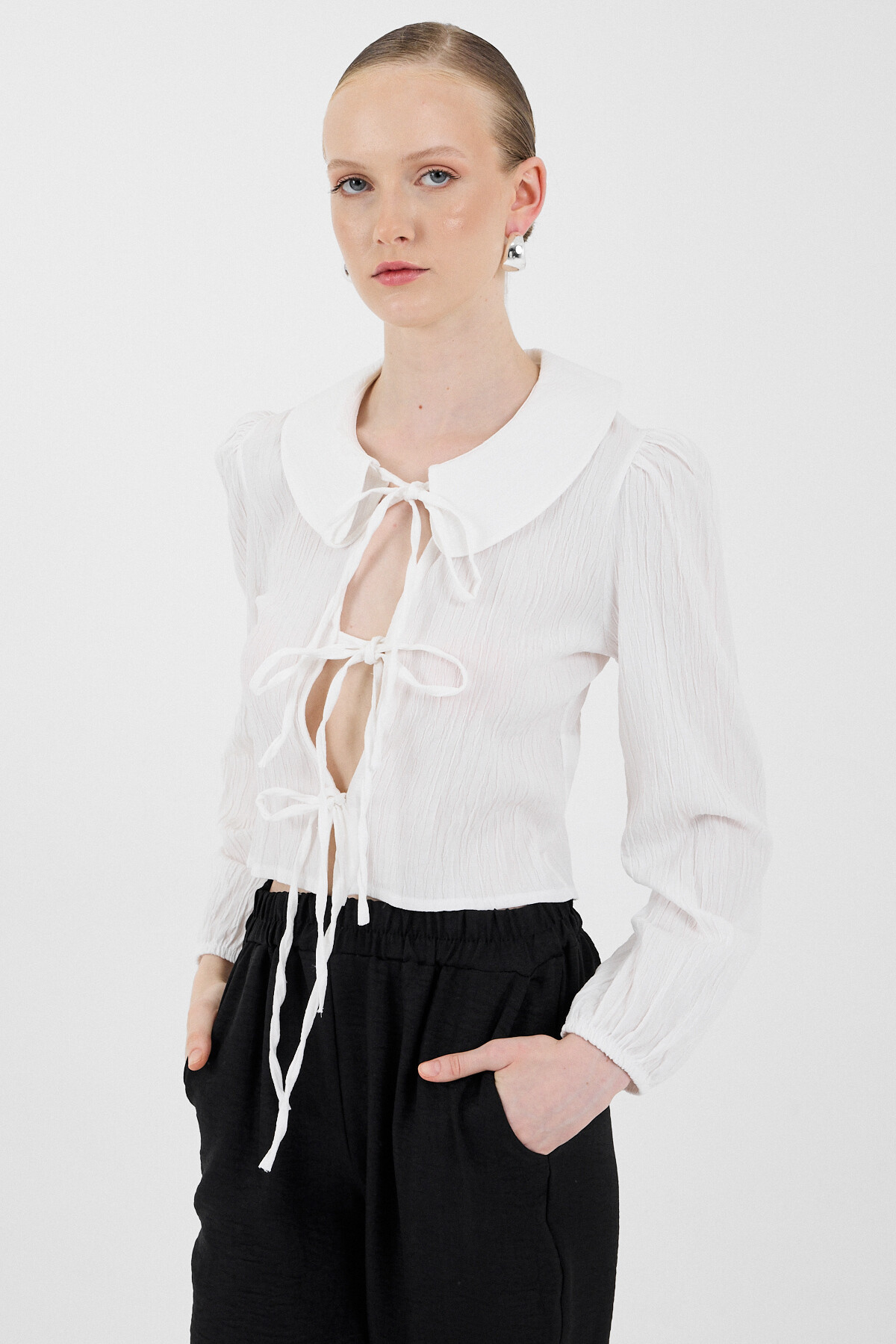 Beyaz Bağlama Detaylı Bebe Yaka Uzun Kollu Bluz 8020A