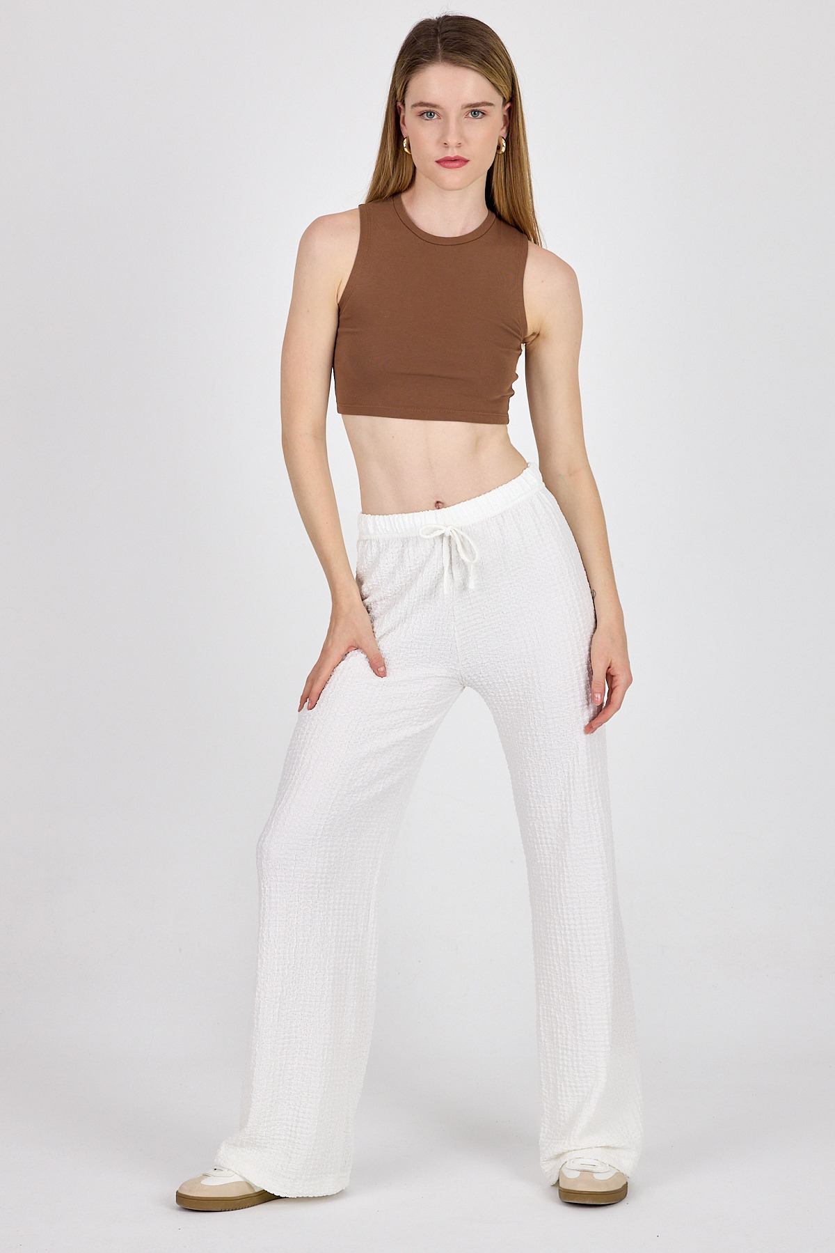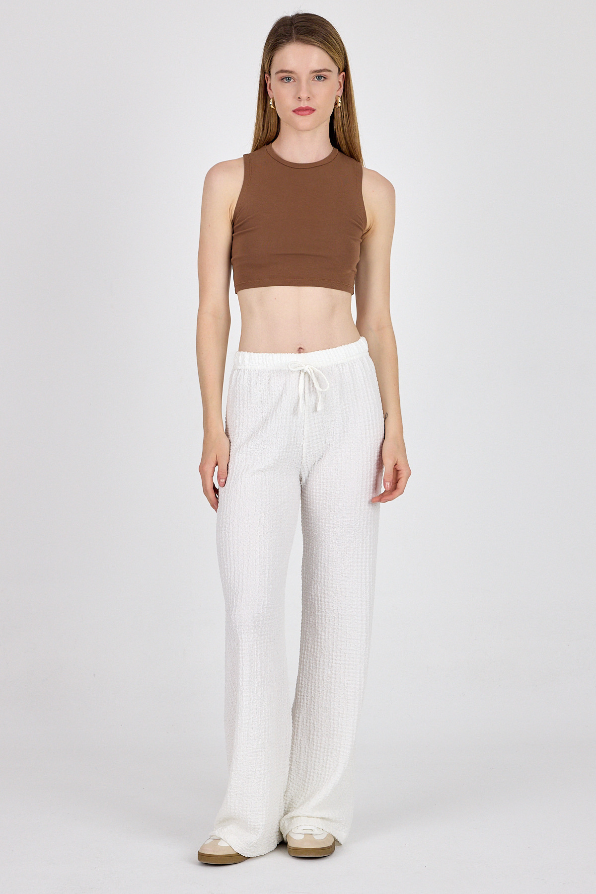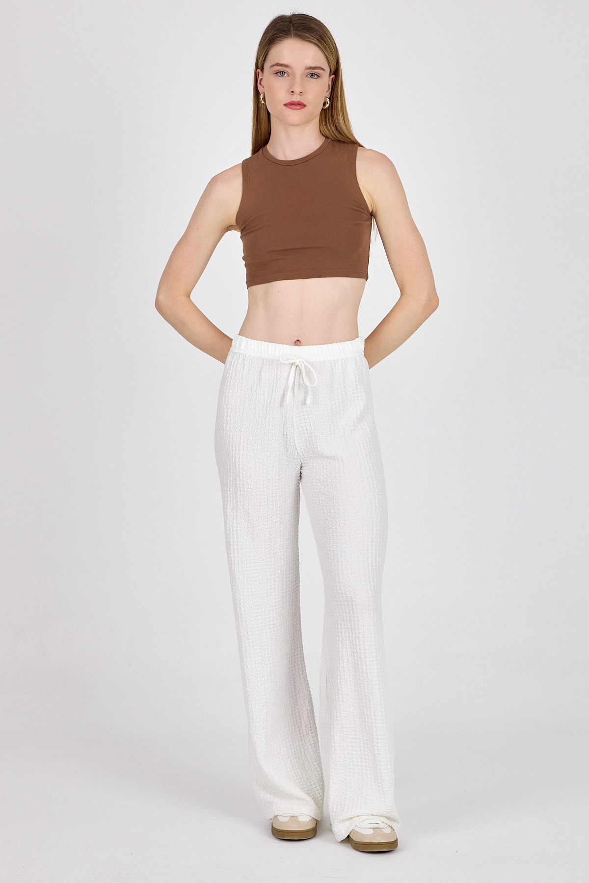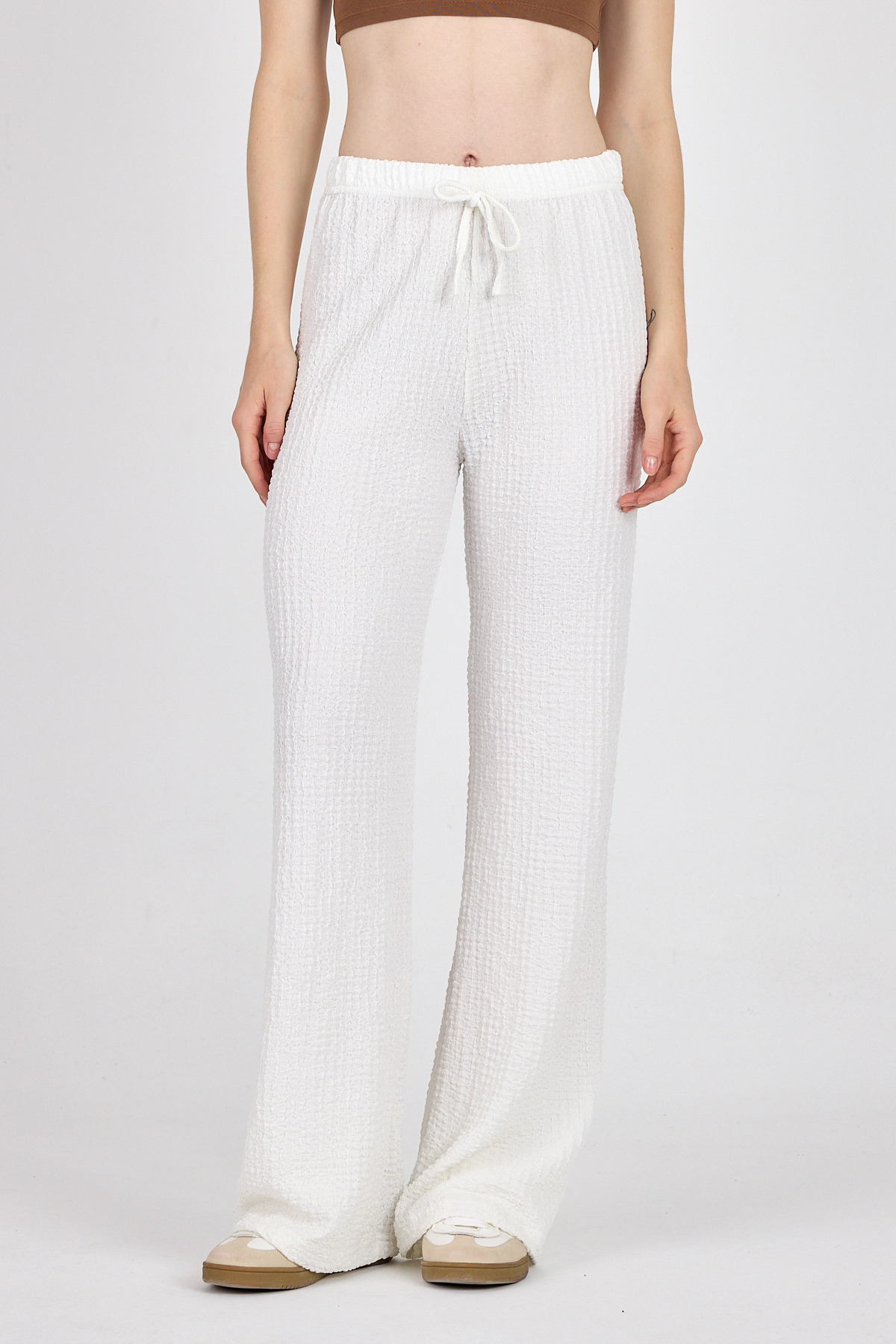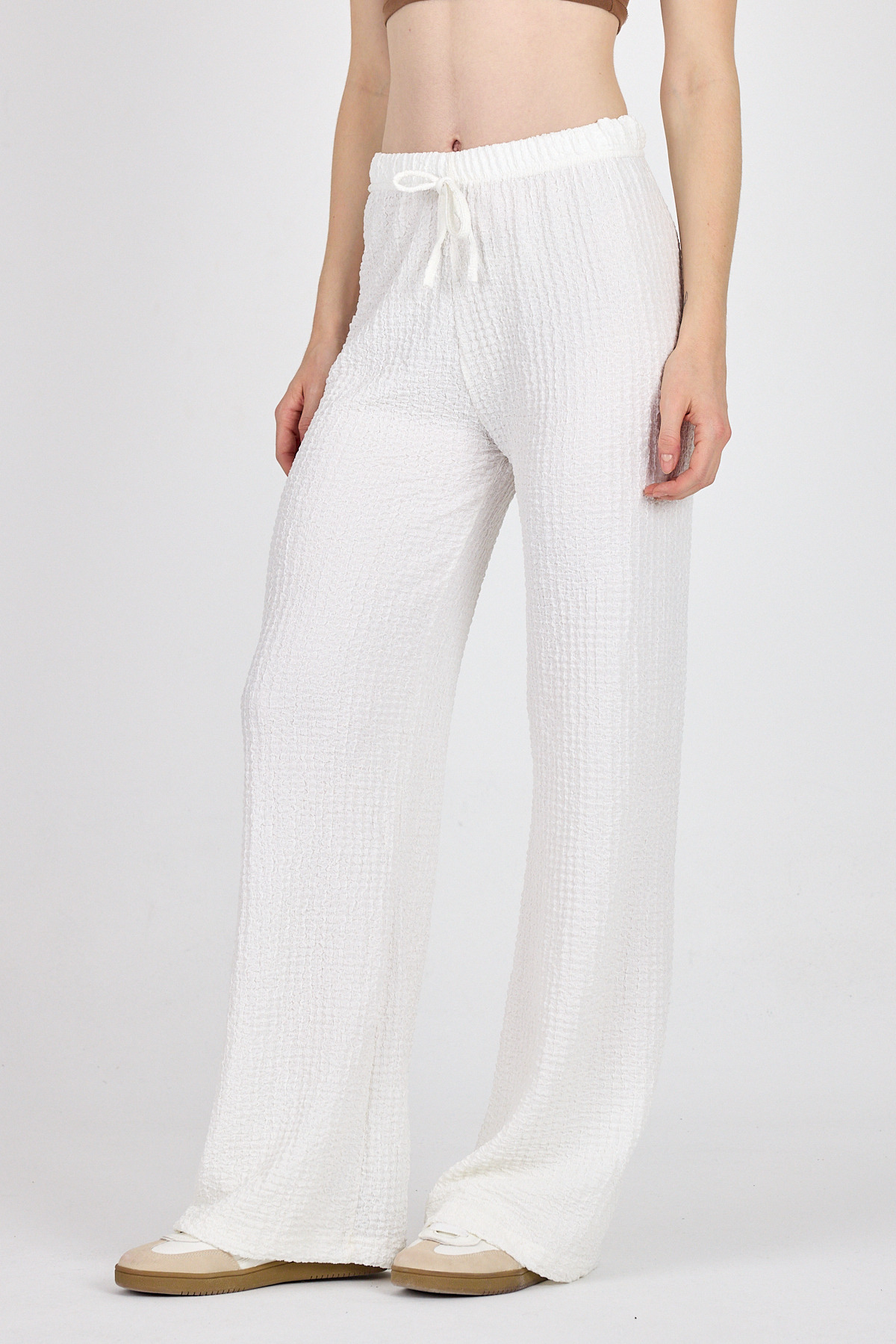 Beyaz Bel Lastikli Geniş Paça Dökümlü Pantolon 326