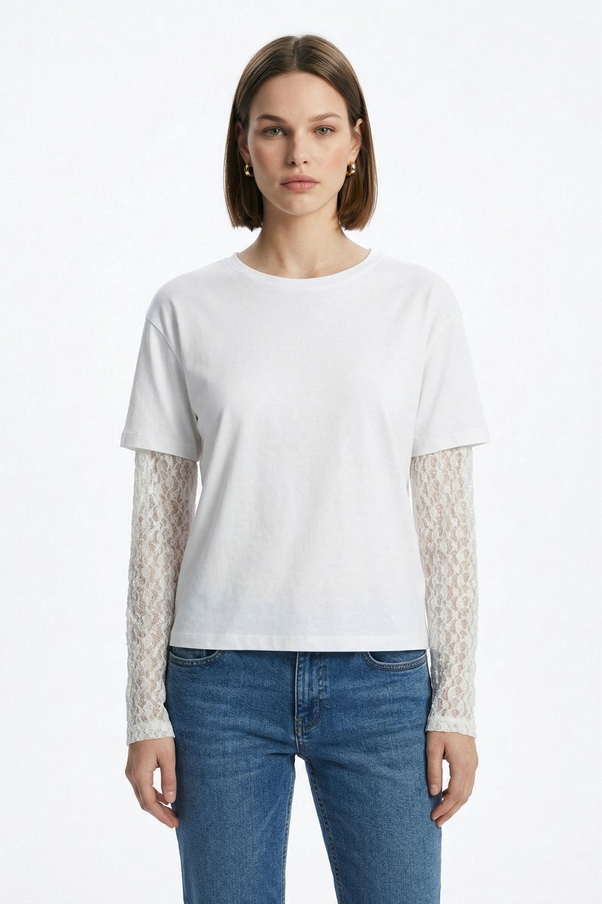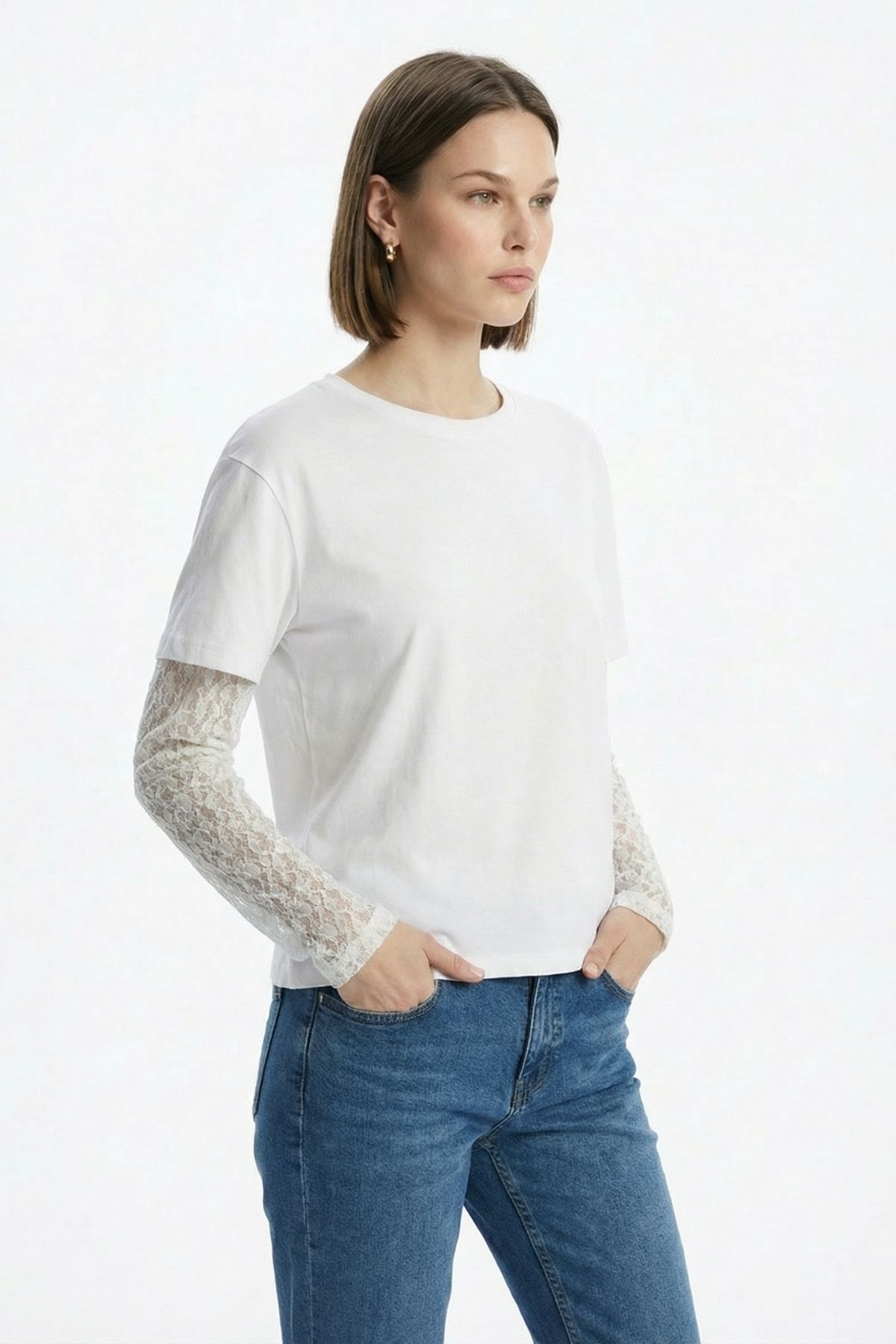 Beyaz Dantel Uzun Kol Tişört 12006