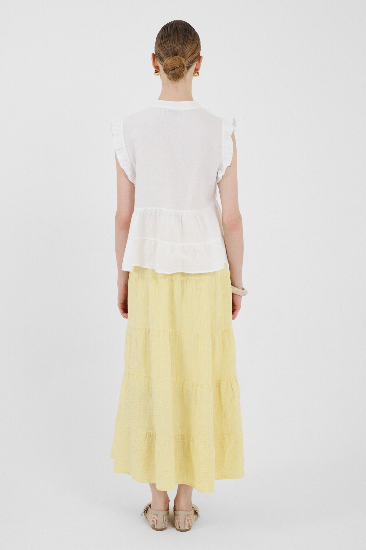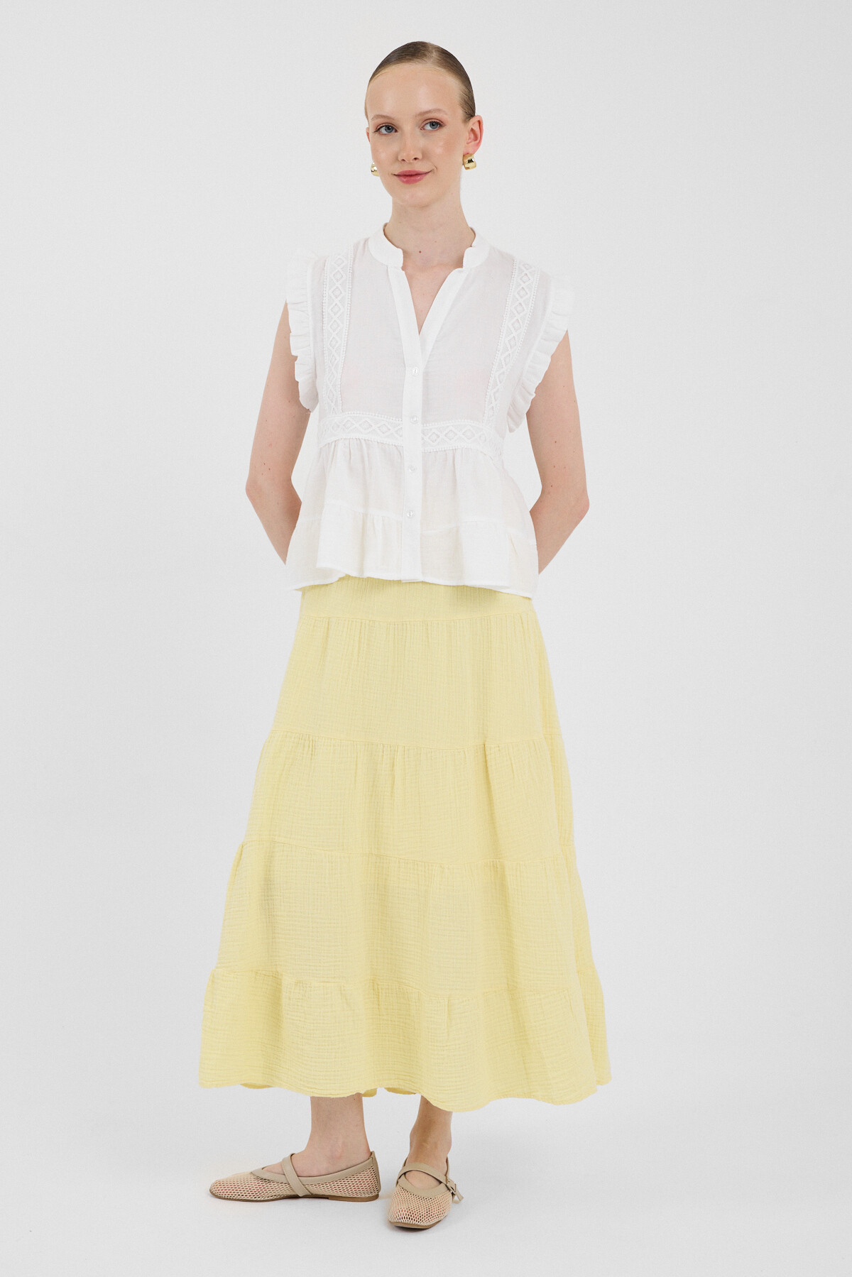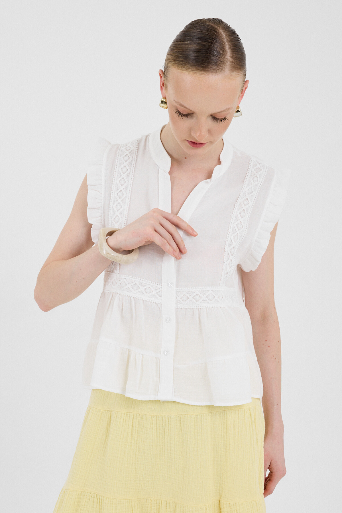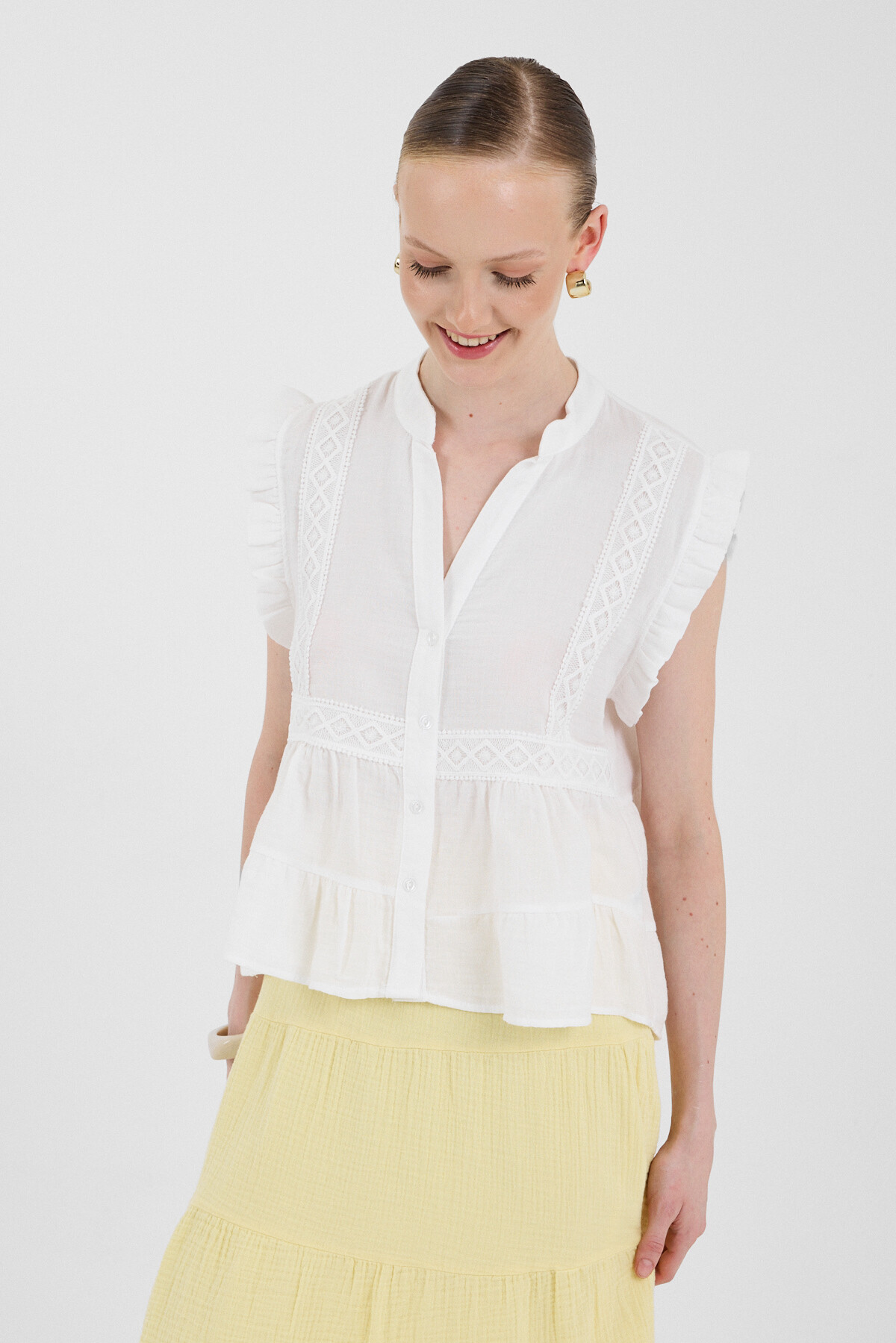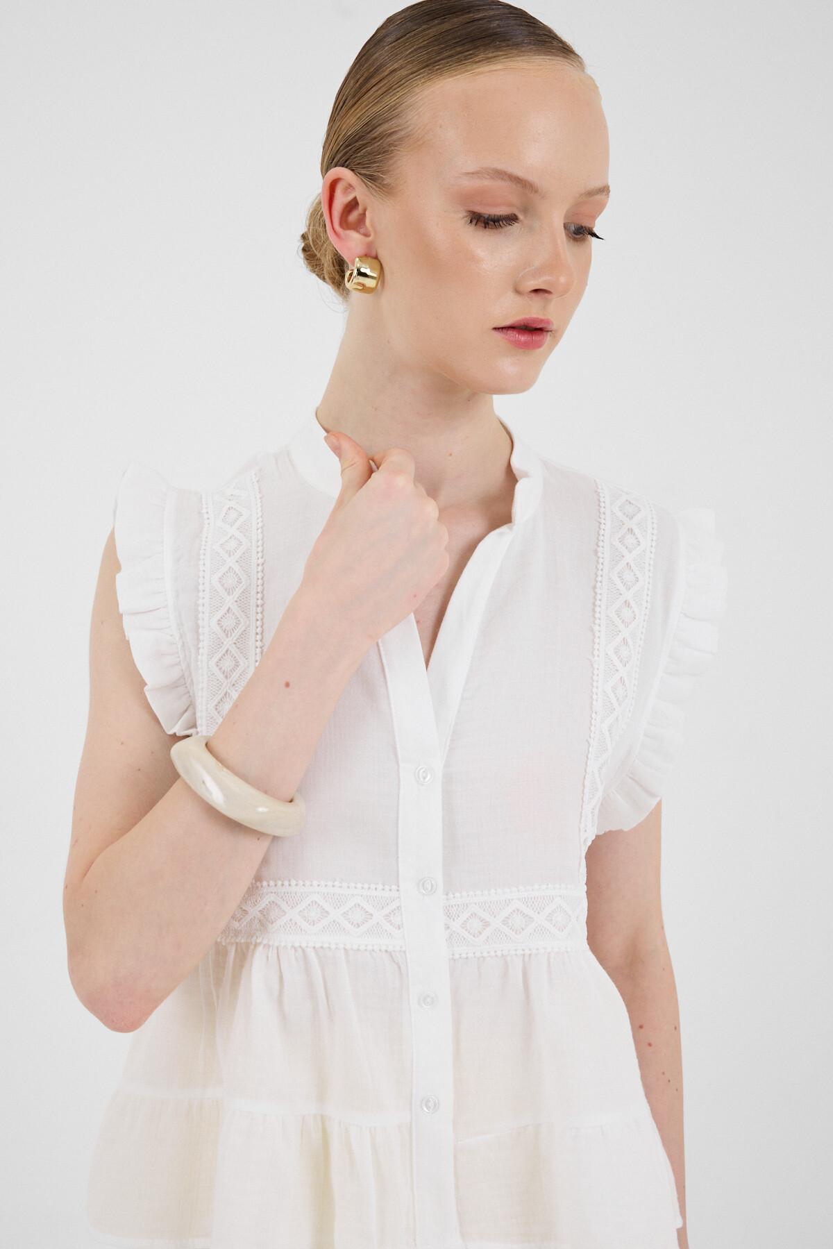 Beyaz Fırfır Kollu Dantel Detaylı %100 Pamuk Müslin Bluz 8039A