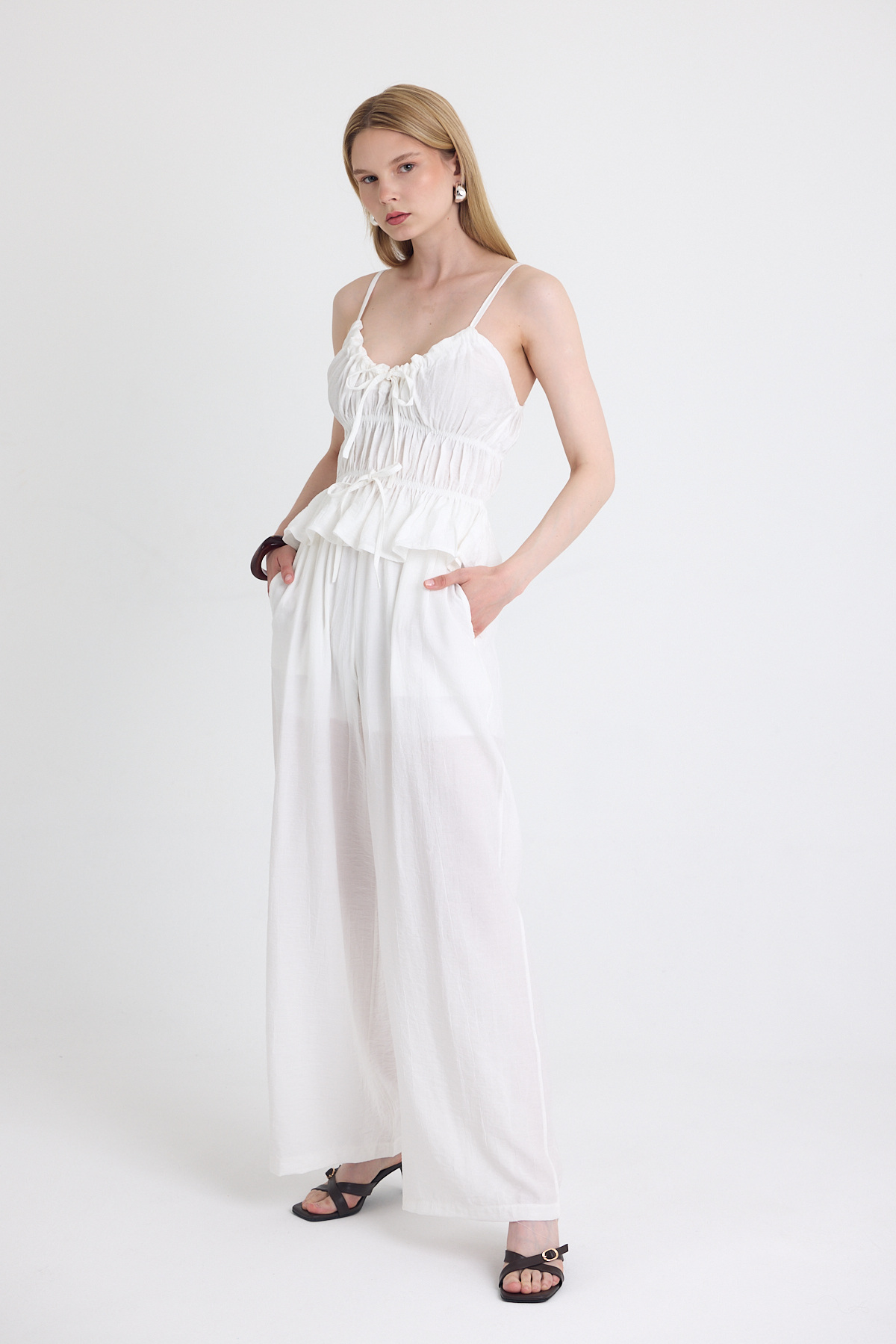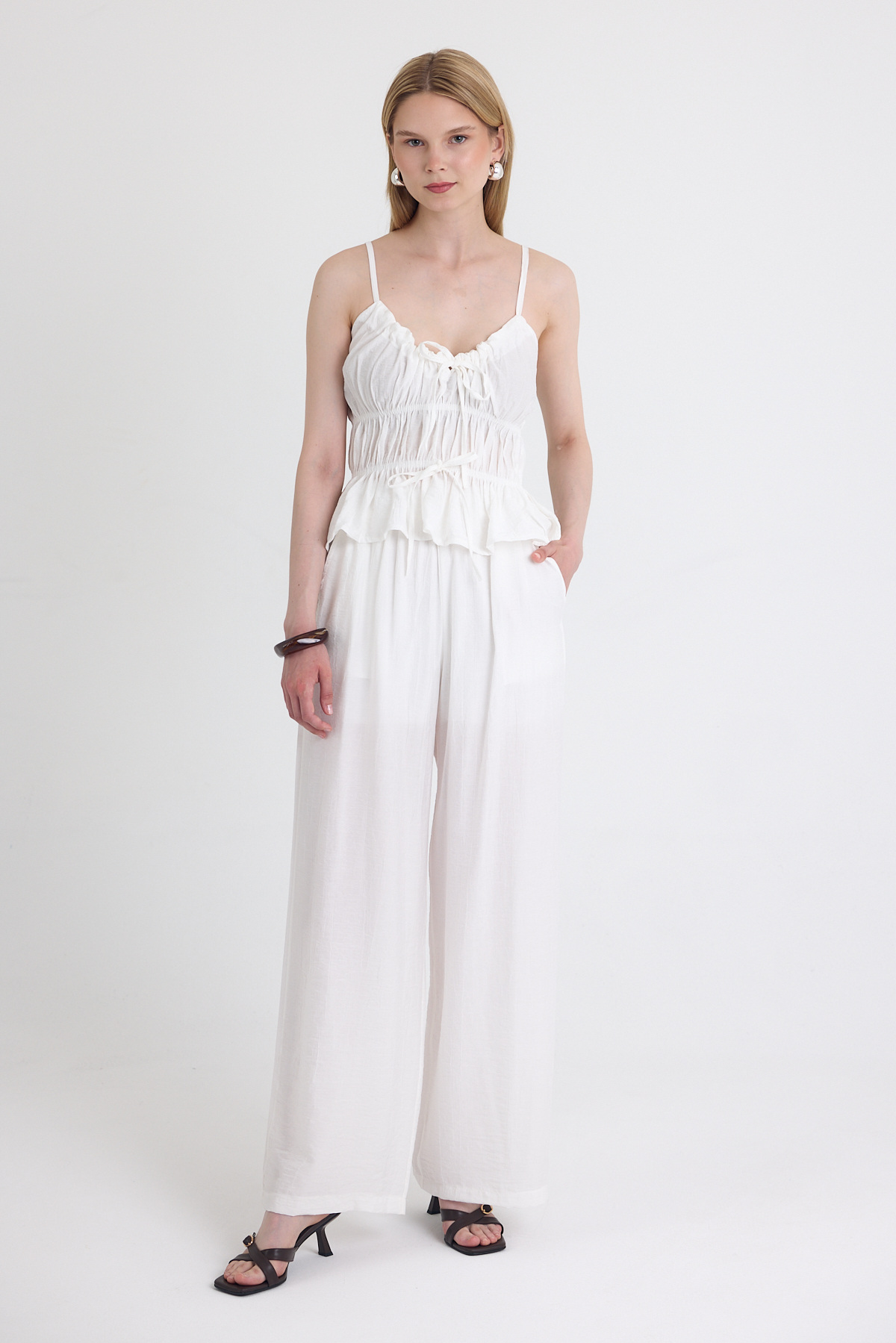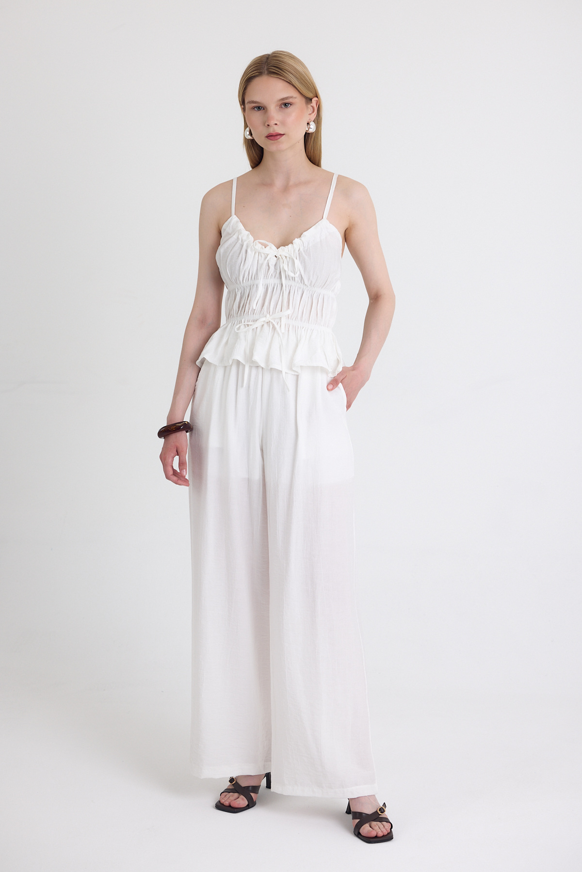 Beyaz Fırfırlı Askılı Bluz ve Geniş Paça Pantolon Takımı 5216