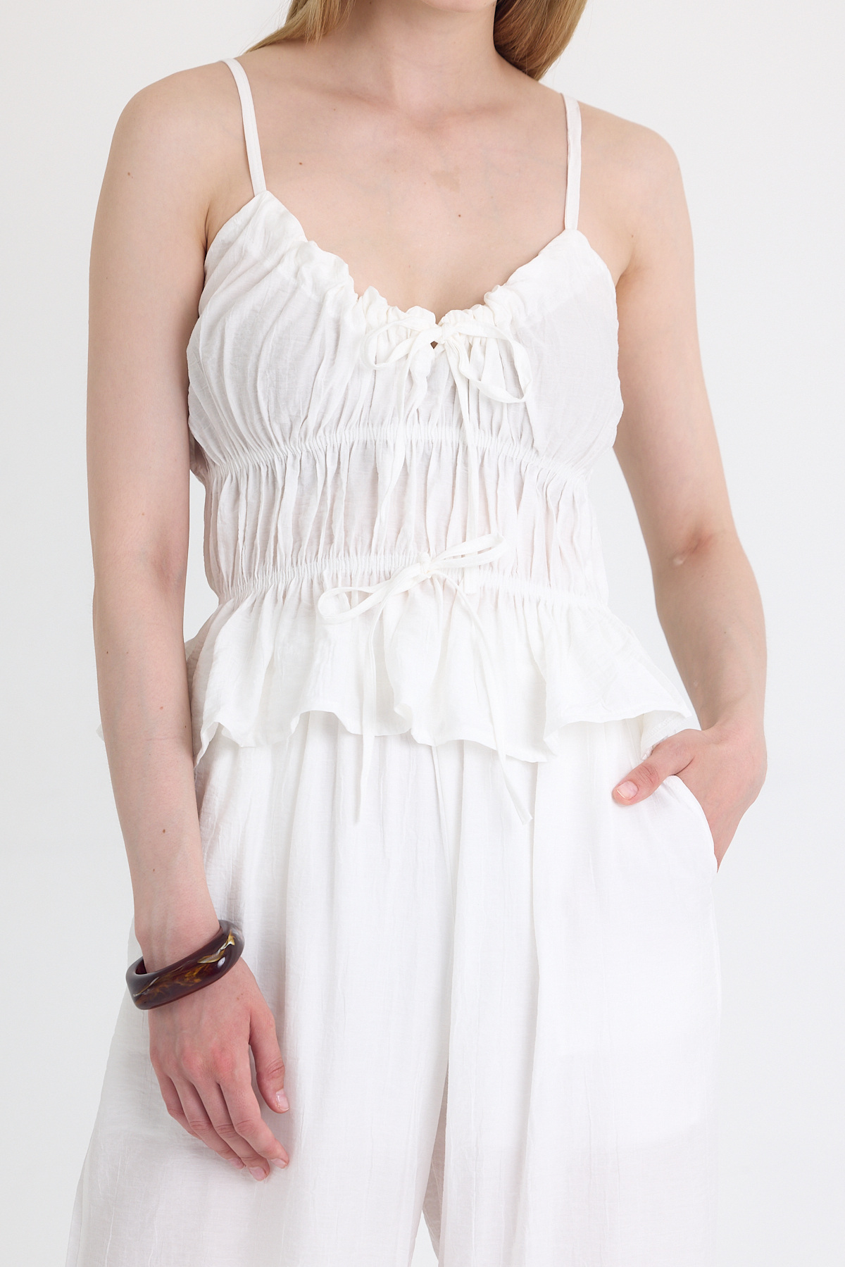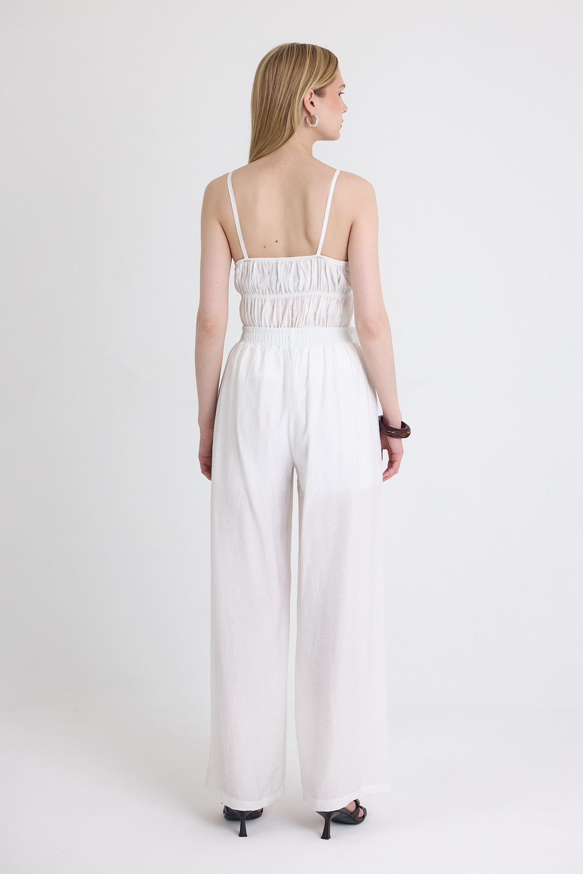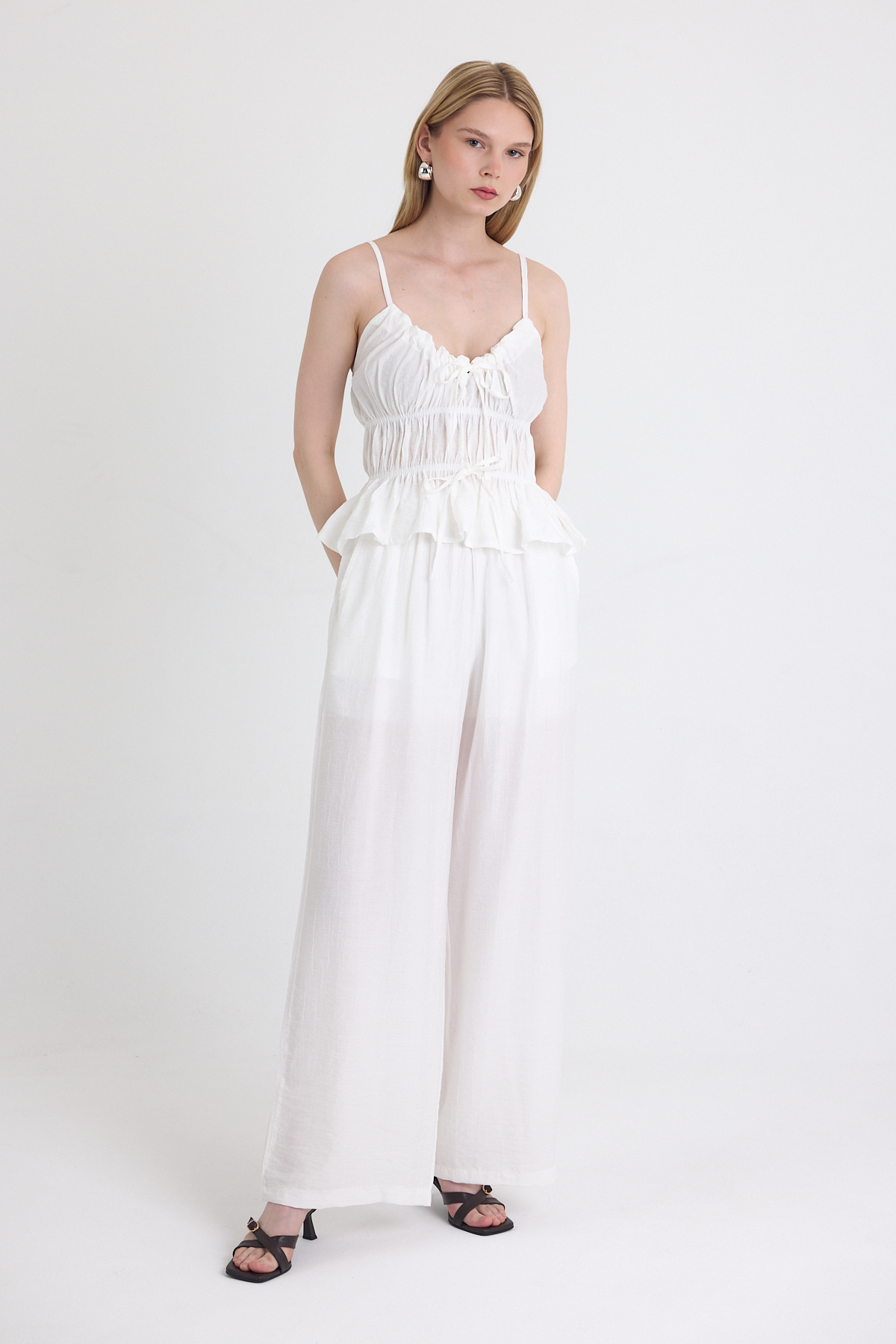 Beyaz Fırfırlı Askılı Bluz ve Geniş Paça Pantolon Takımı 5216