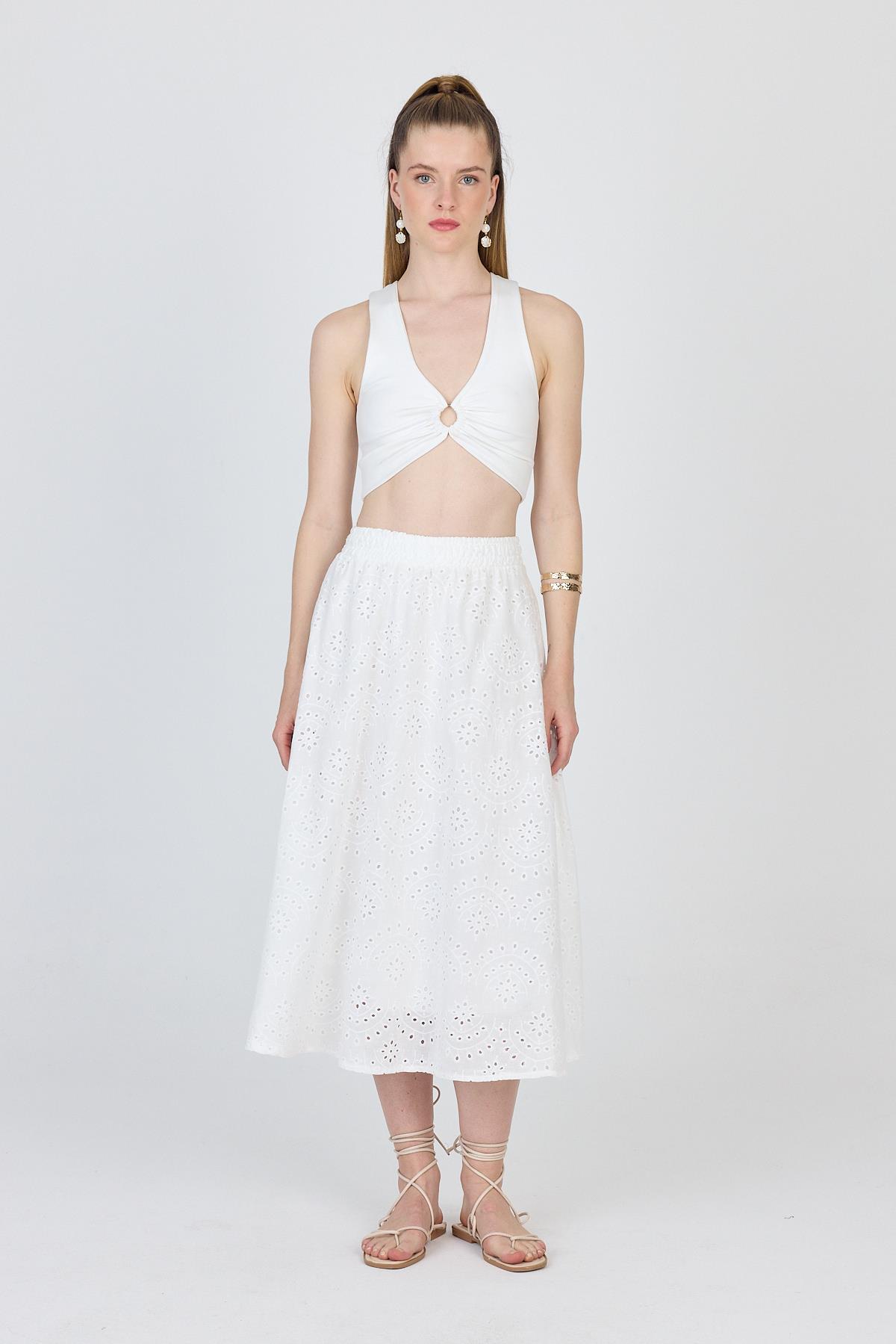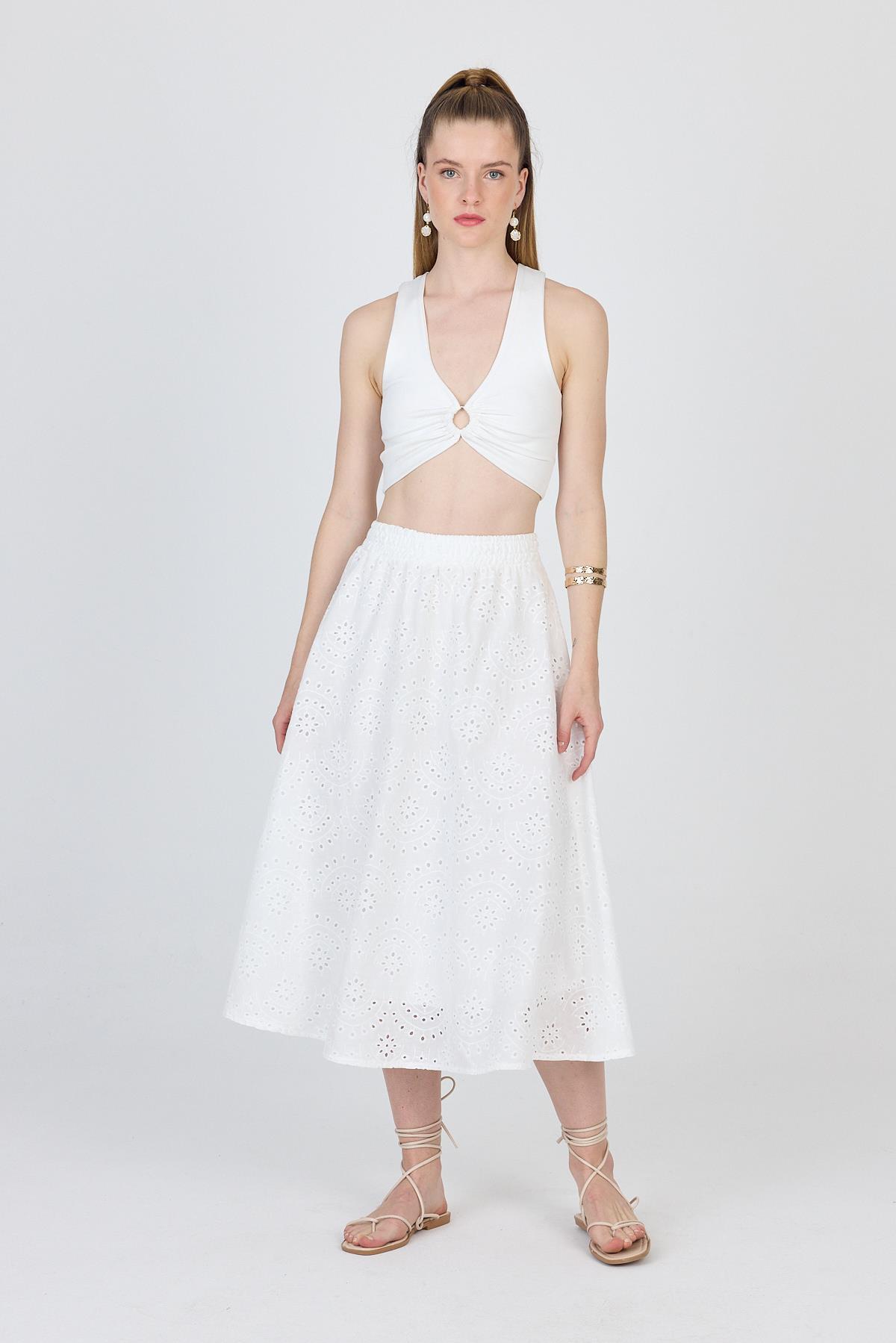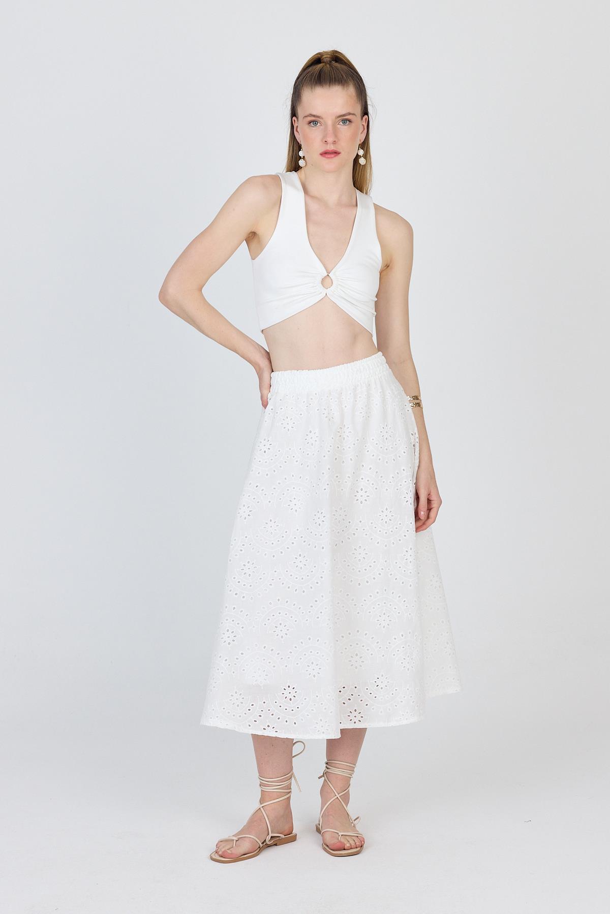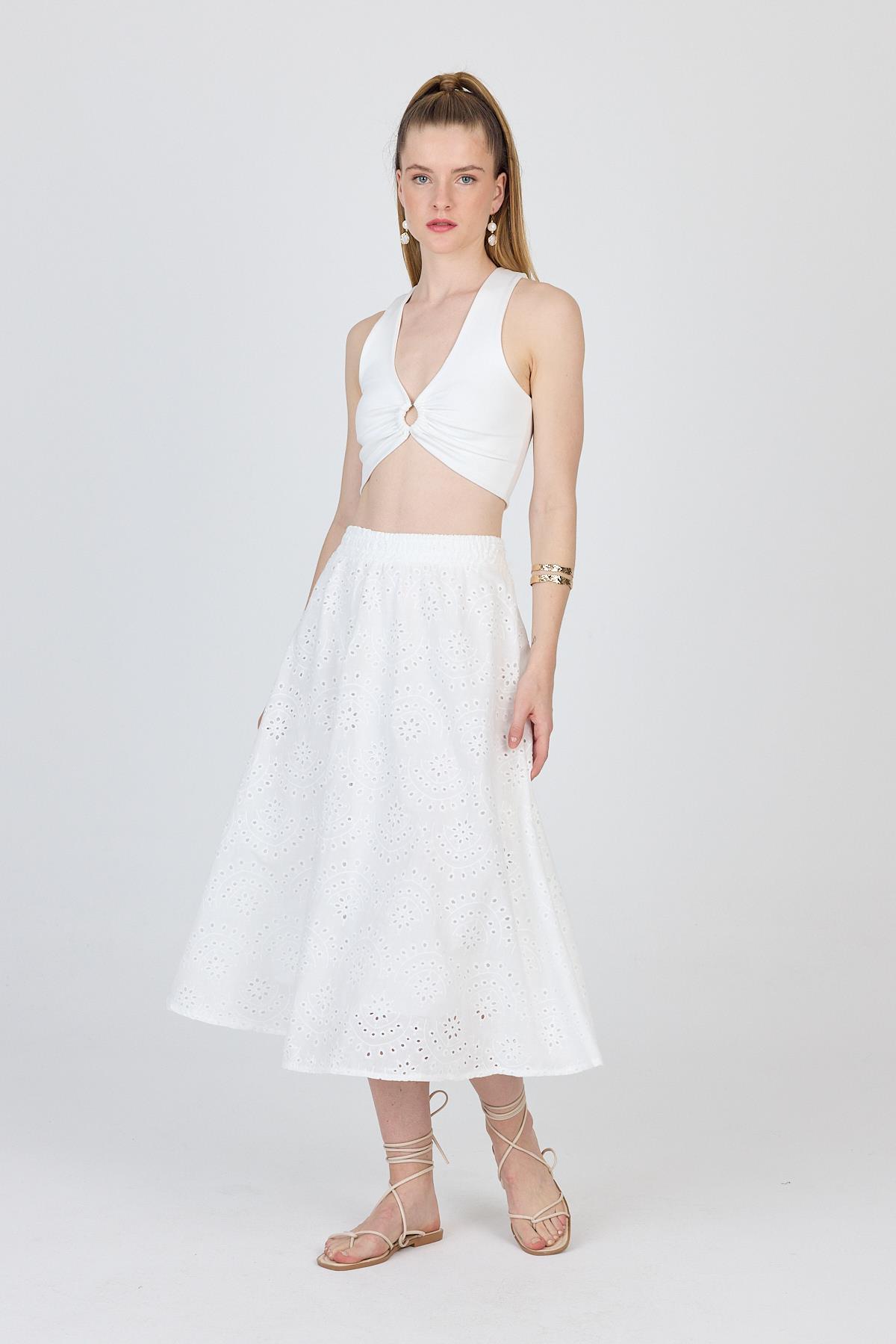 Beyaz Fisto Detaylı Midi Etek 4762A