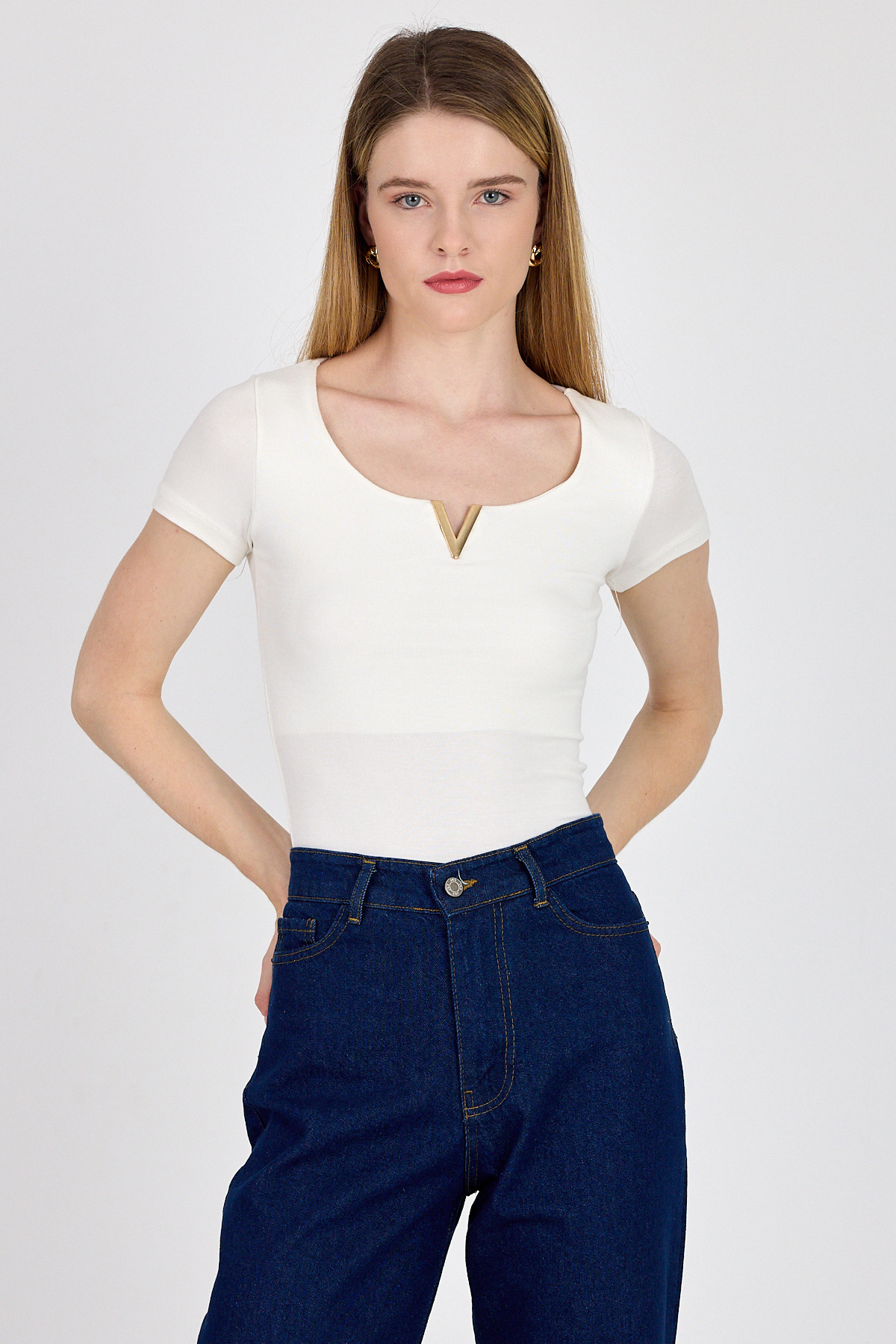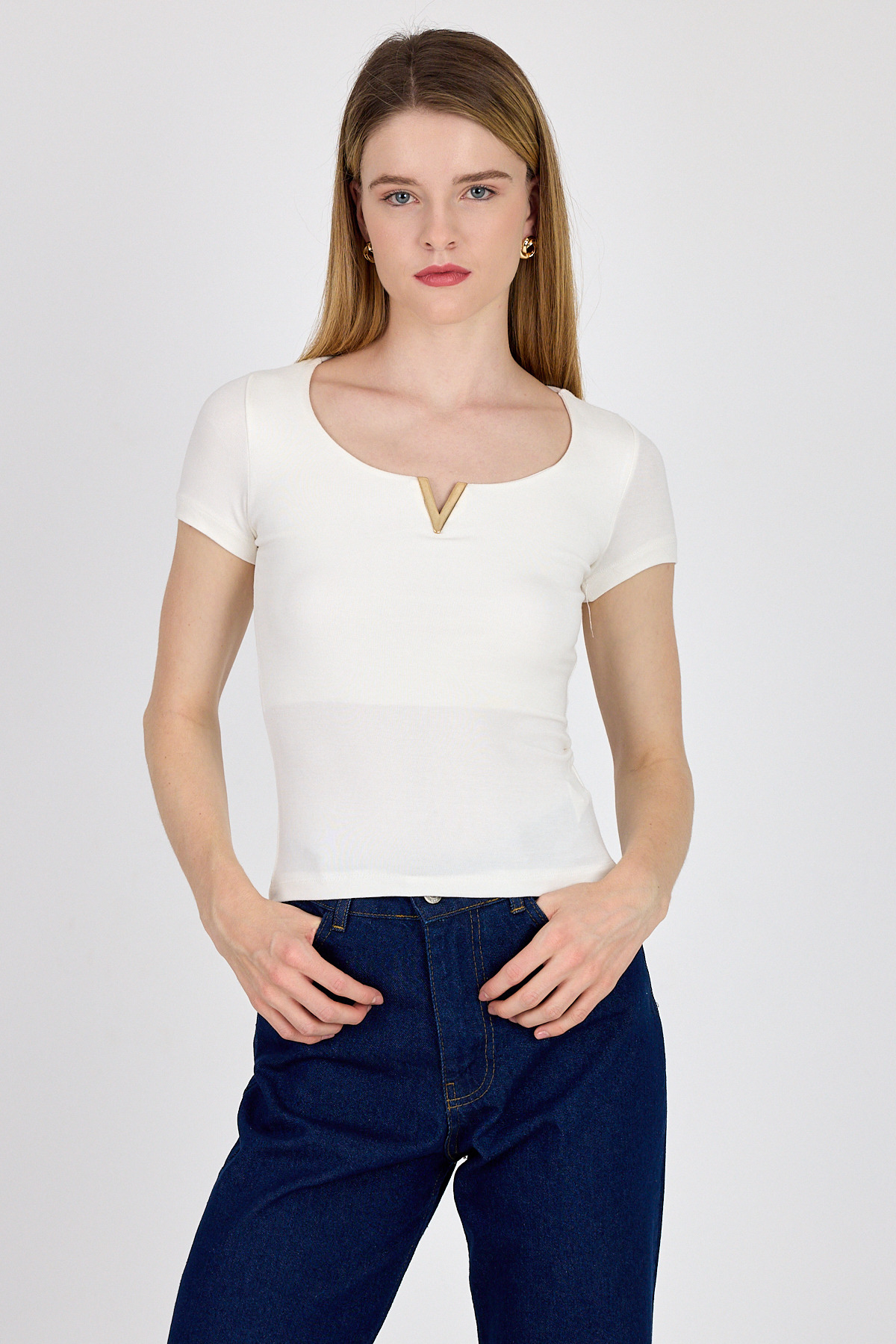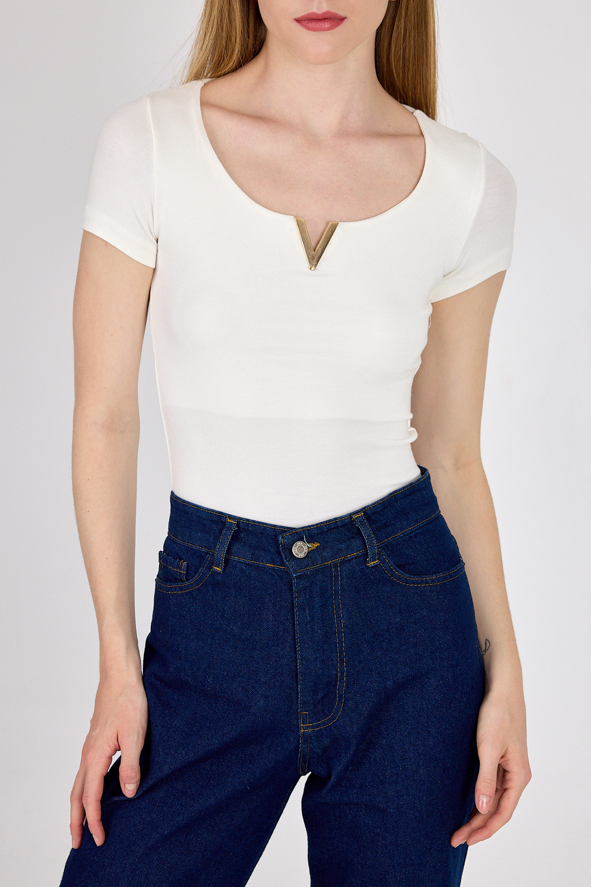 Beyaz Gold Aksesuar Detaylı Viskoz/Yumuşak Kumaş Tişört 1460