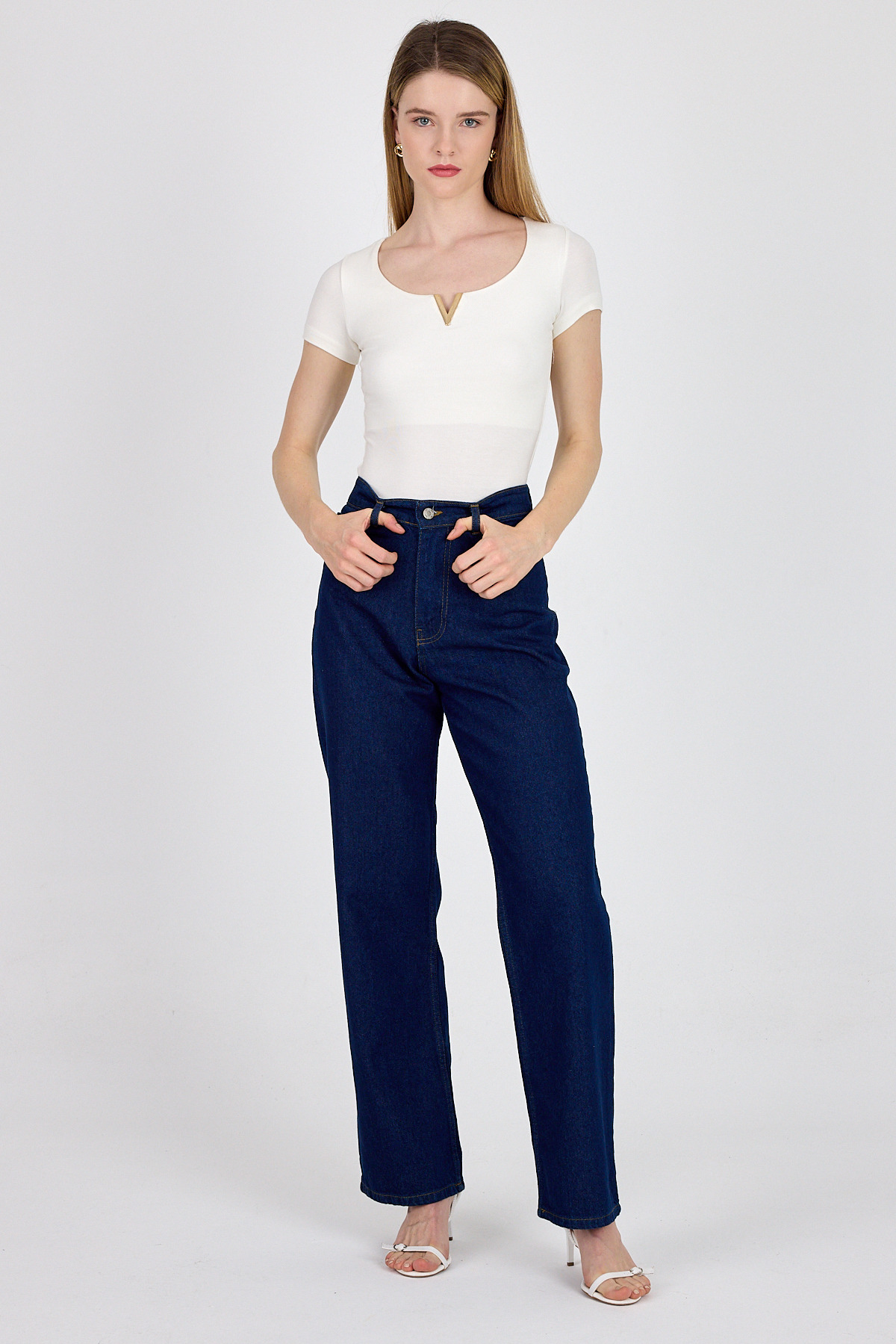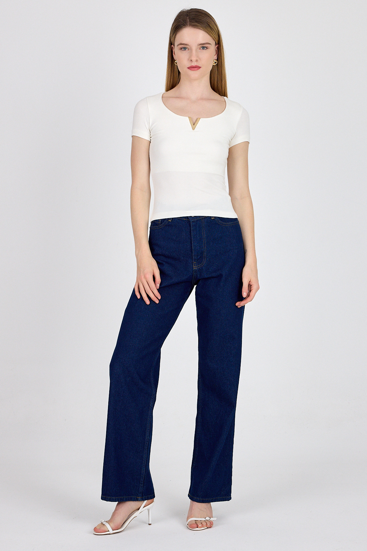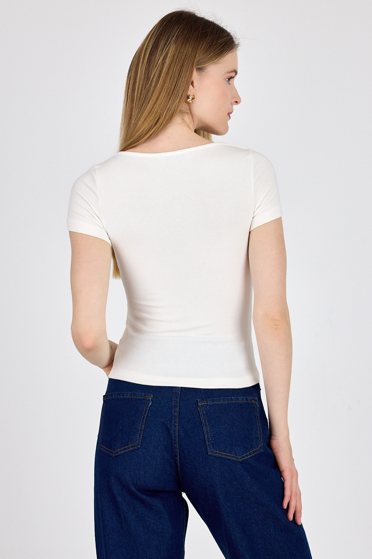 Beyaz Gold Aksesuar Detaylı Viskoz/Yumuşak Kumaş Tişört 1460