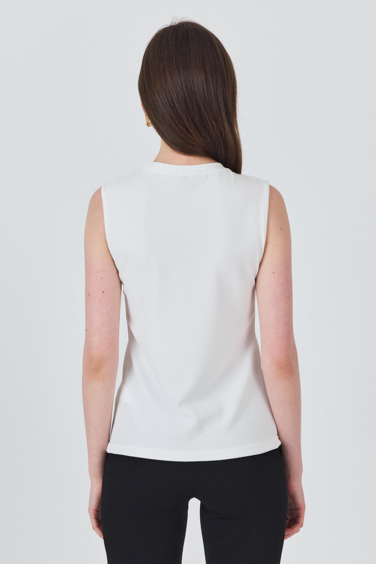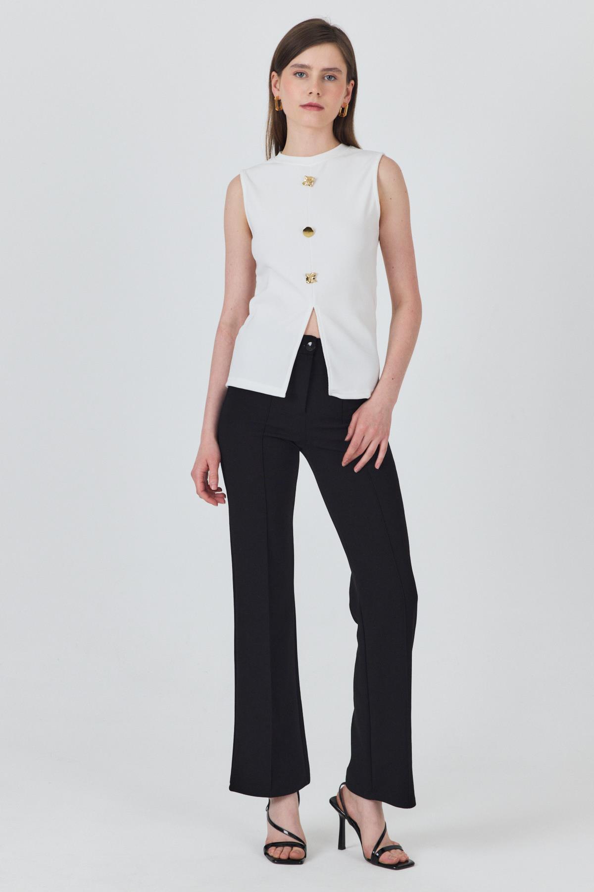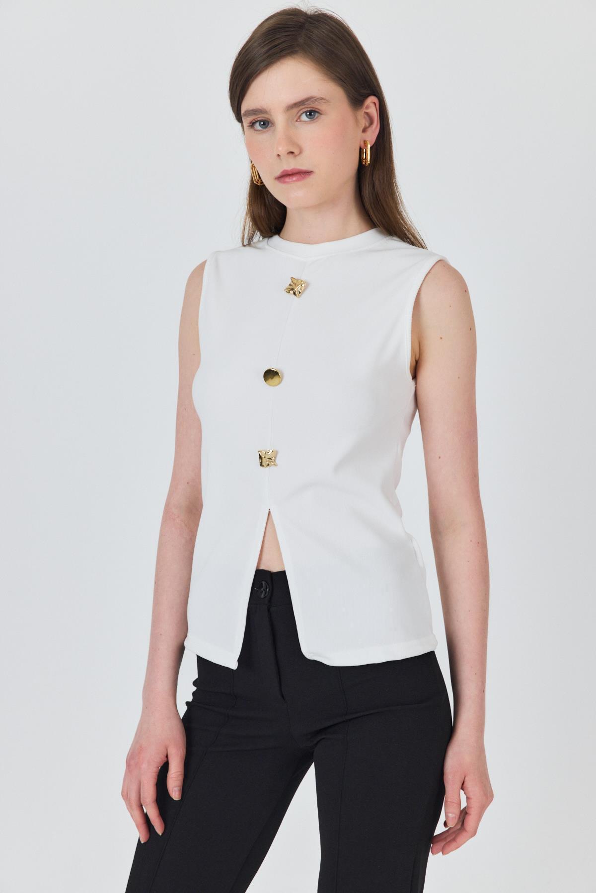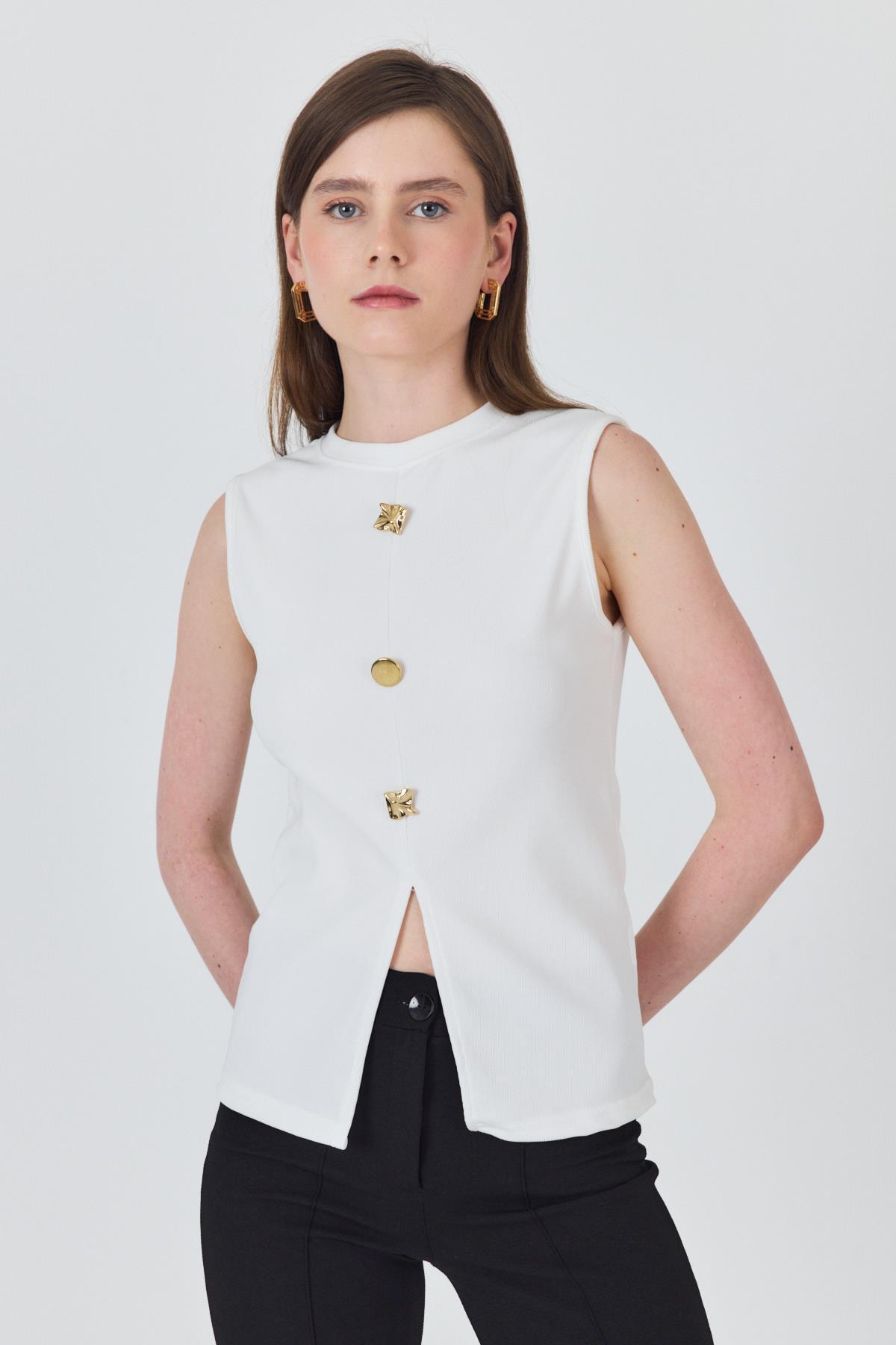 Beyaz Gold Düğme Detaylı Kolsuz Bluz 2203