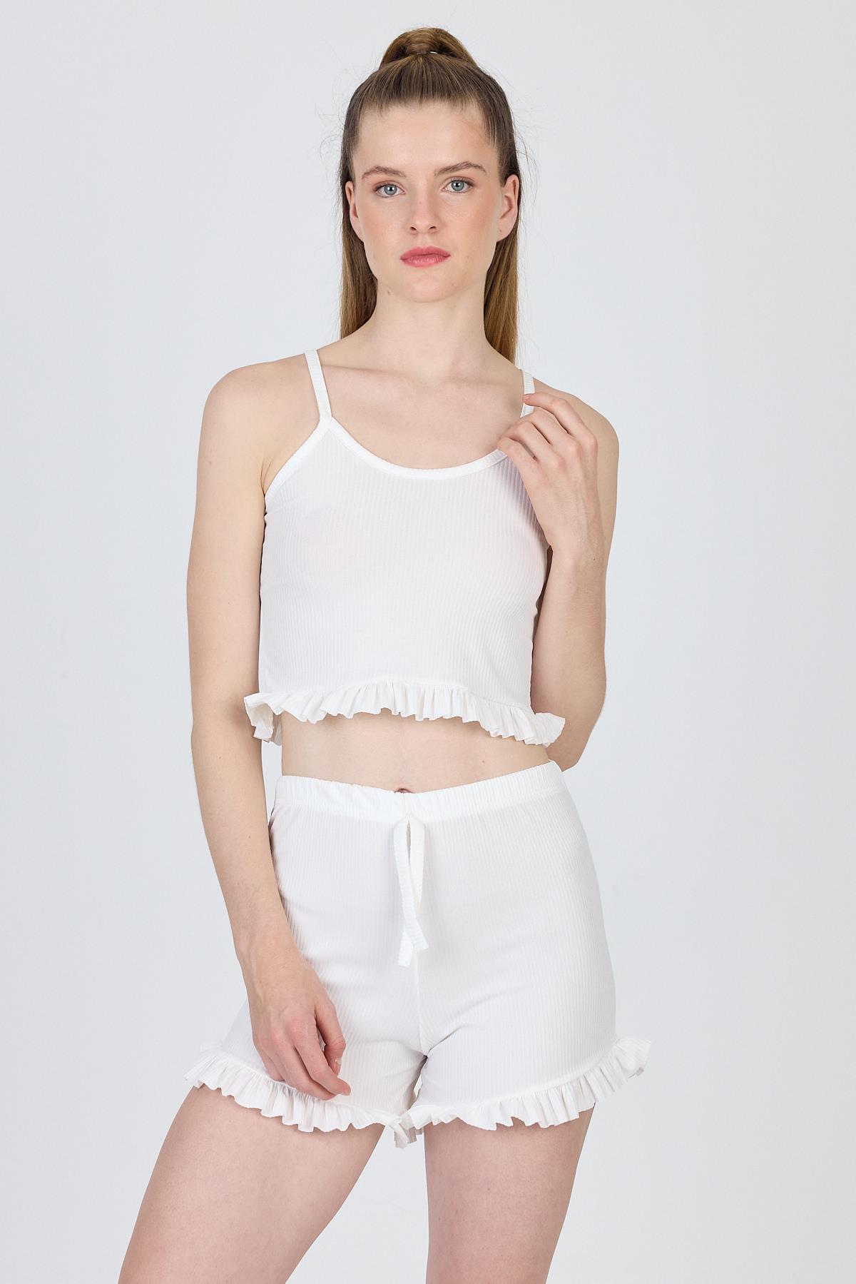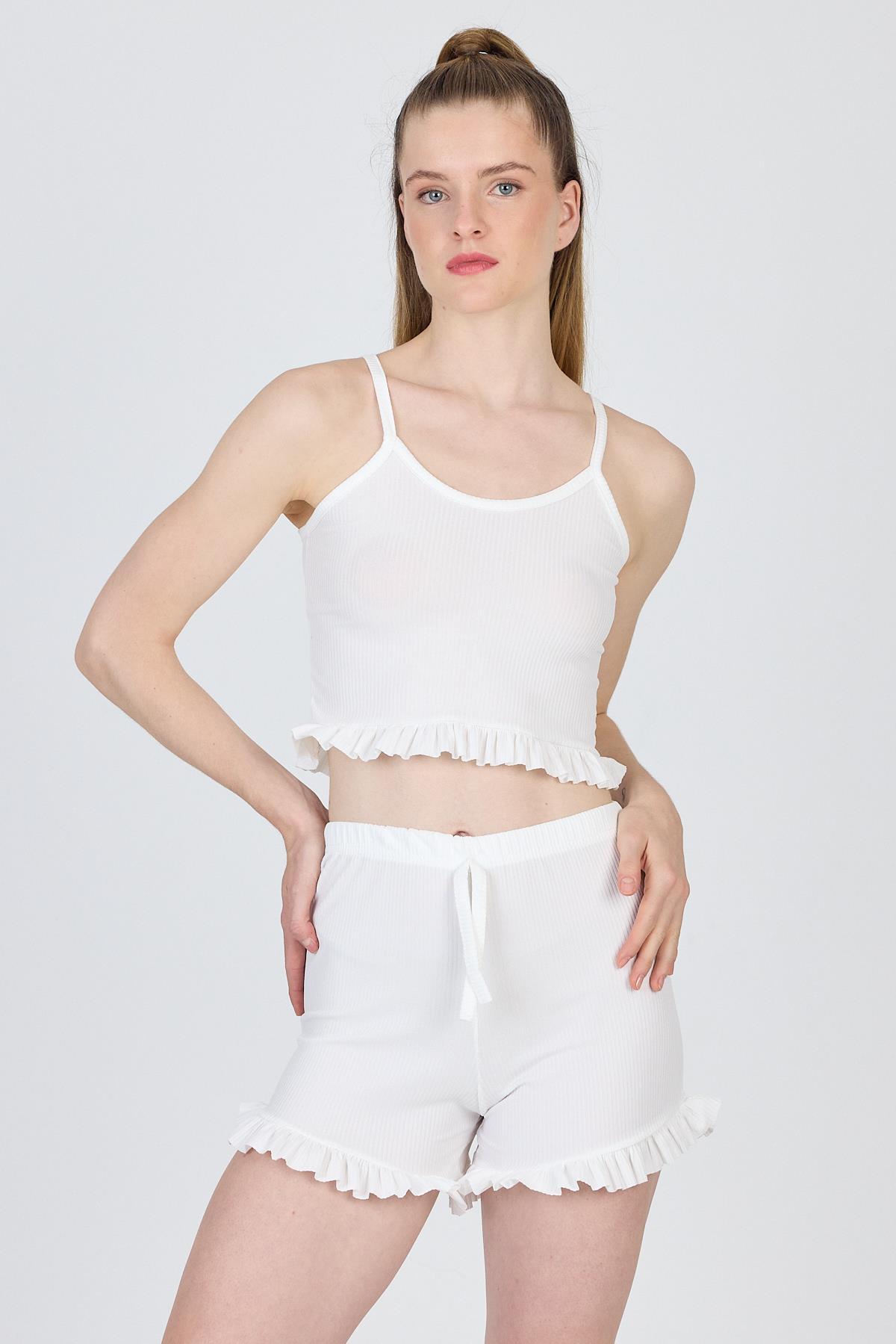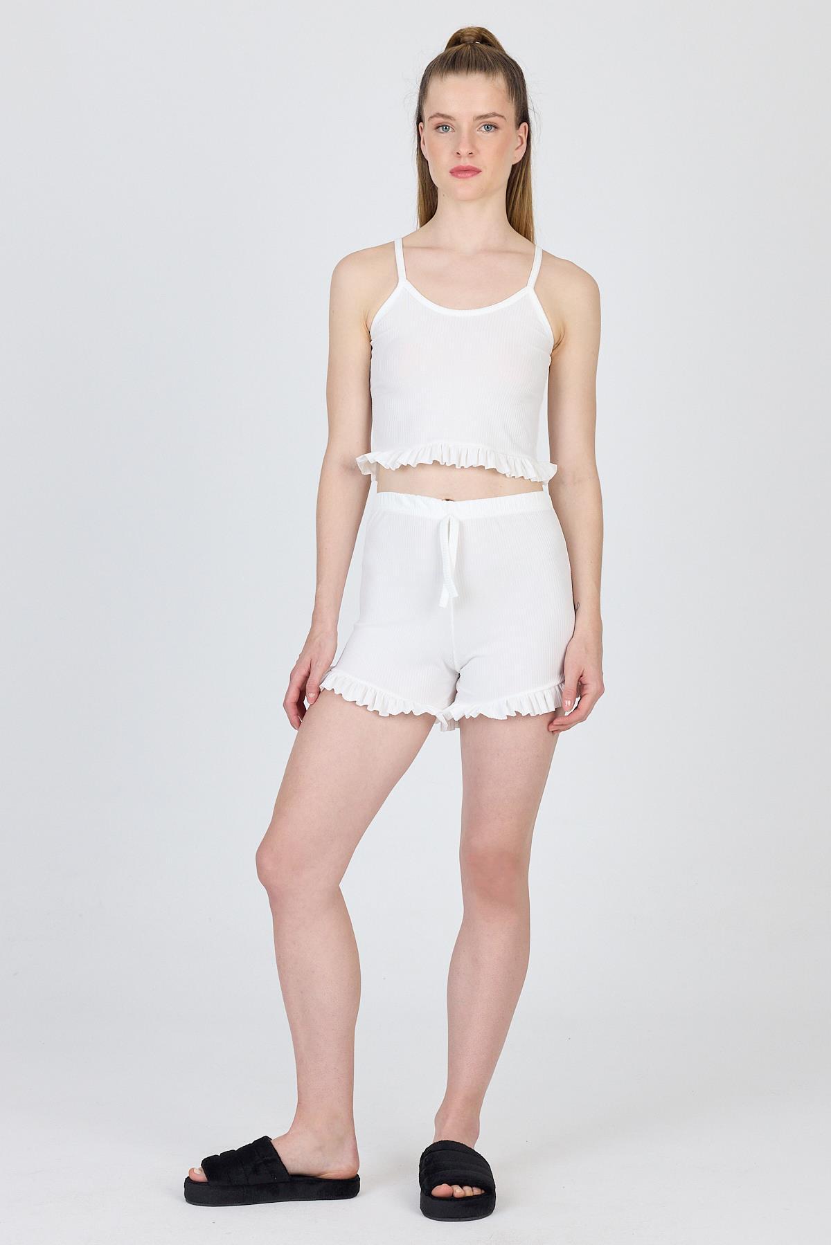 Beyaz İp Askılı Fırfırlı Şortlu Takım 0703