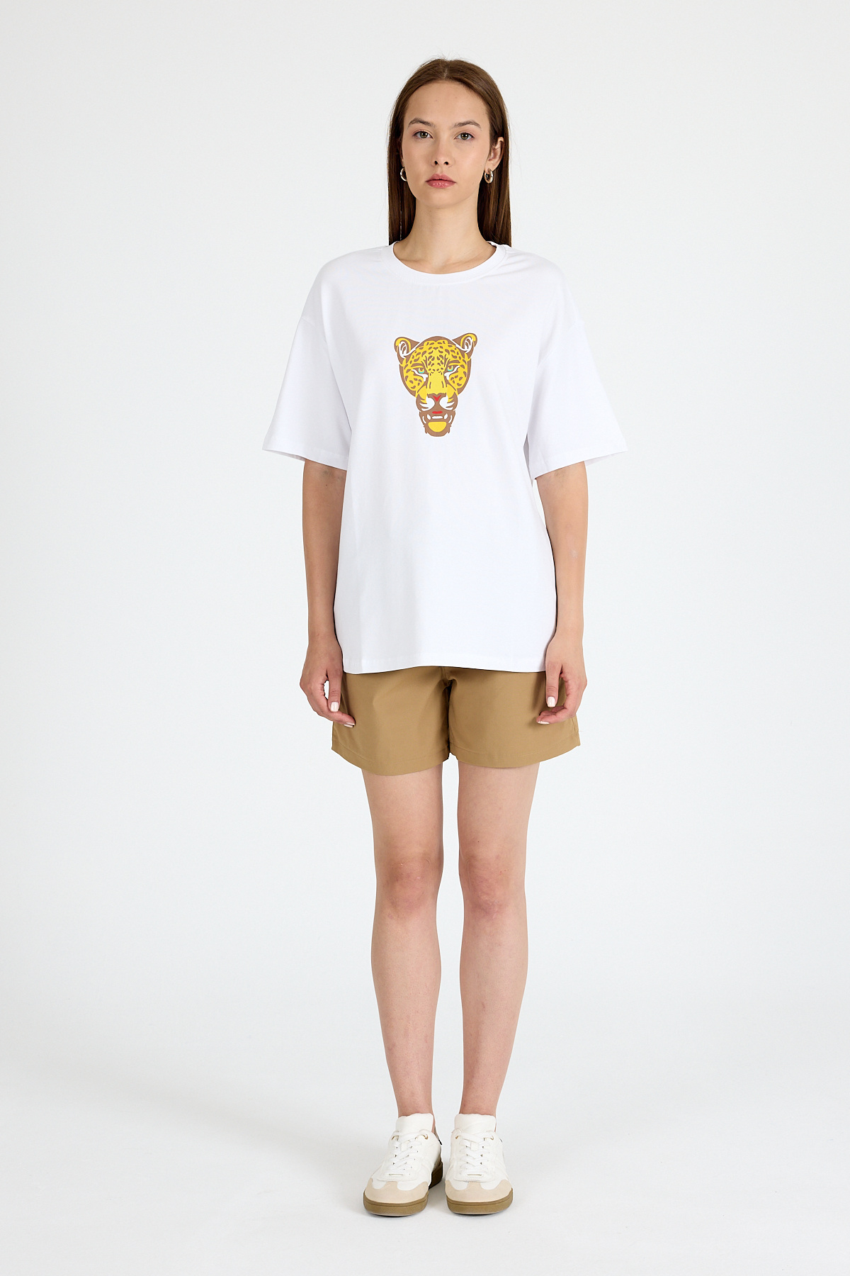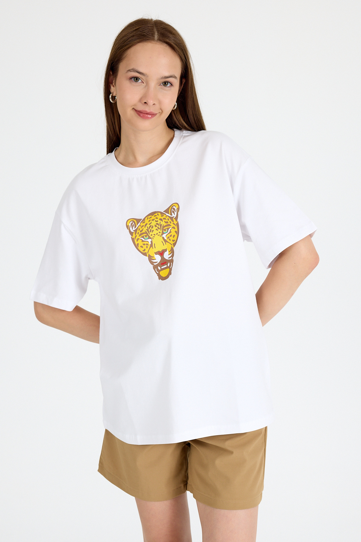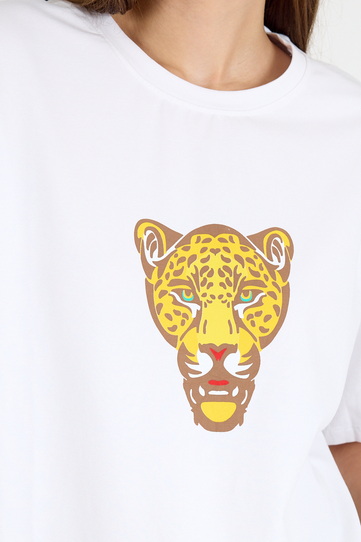 Beyaz Kaplan Baskılı Oversize Tişört 6887