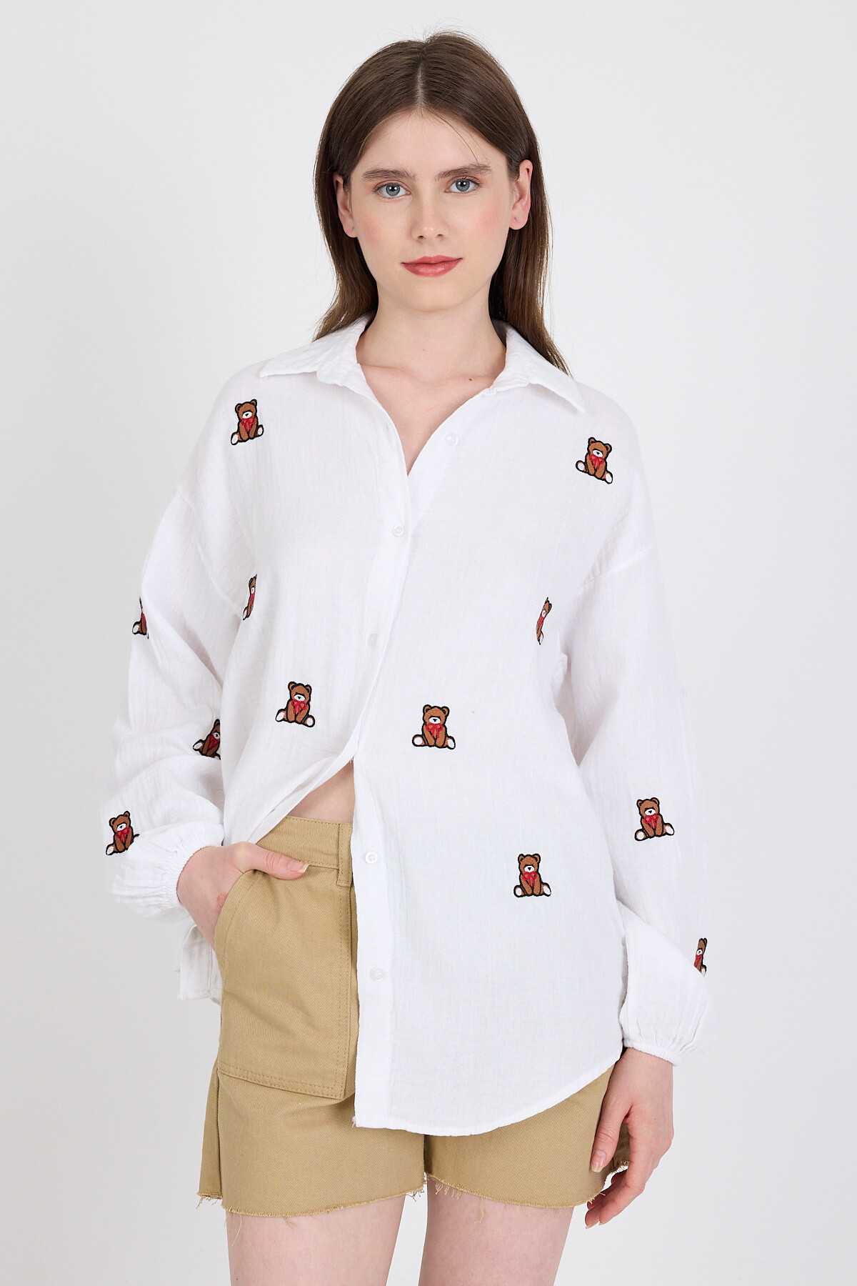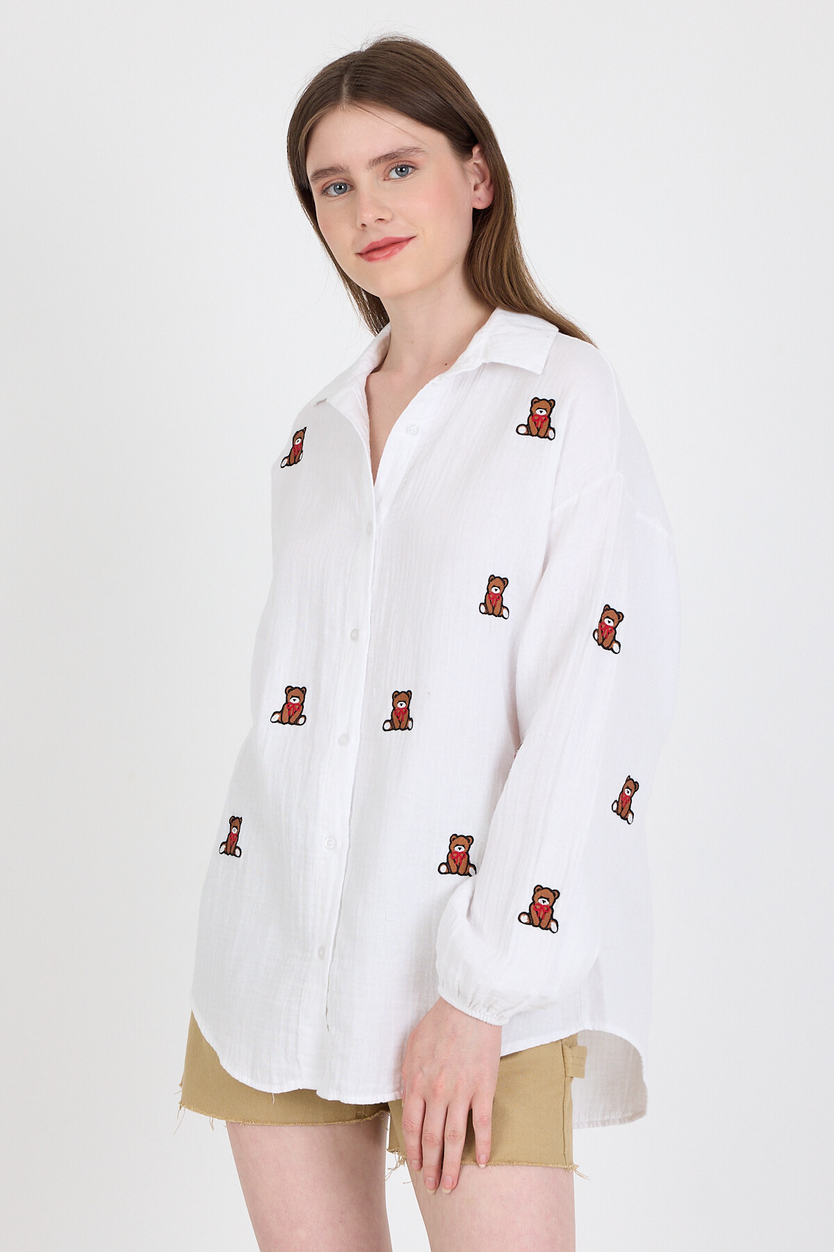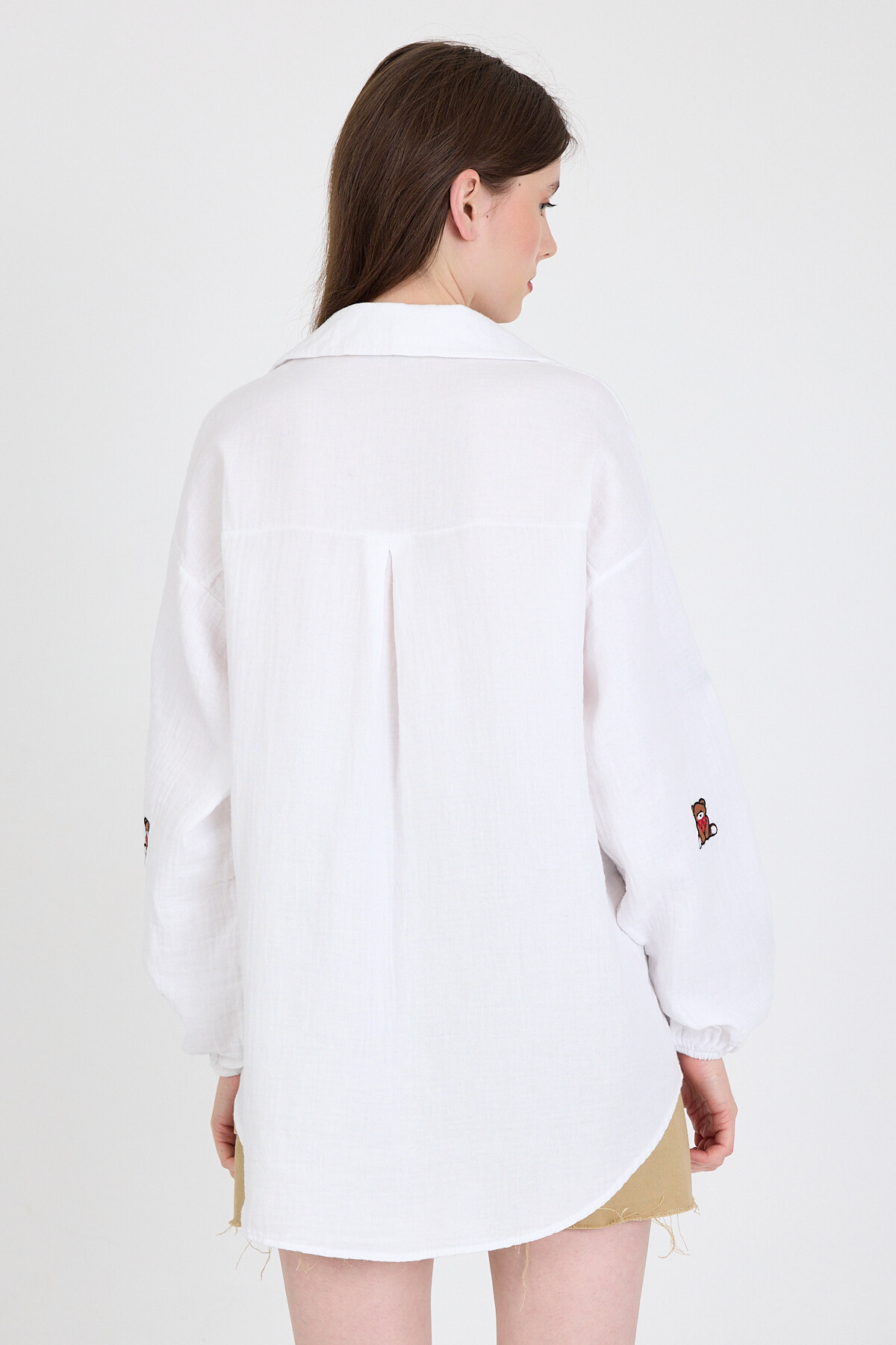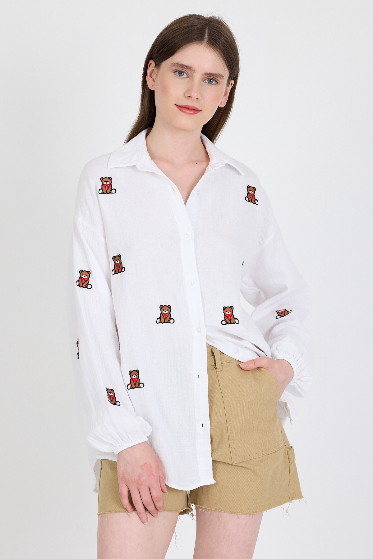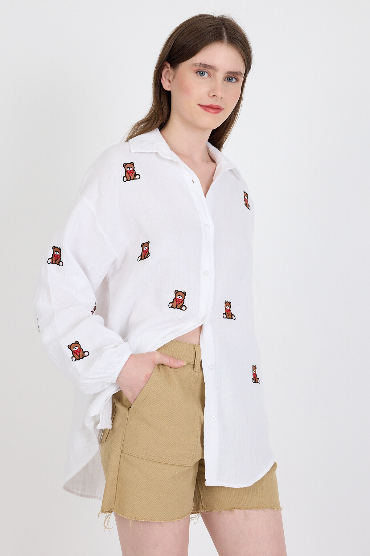 Beyaz Keten Görünümlü %100 Pamuk Ayıcık Nakışlı Gömlek 4798A